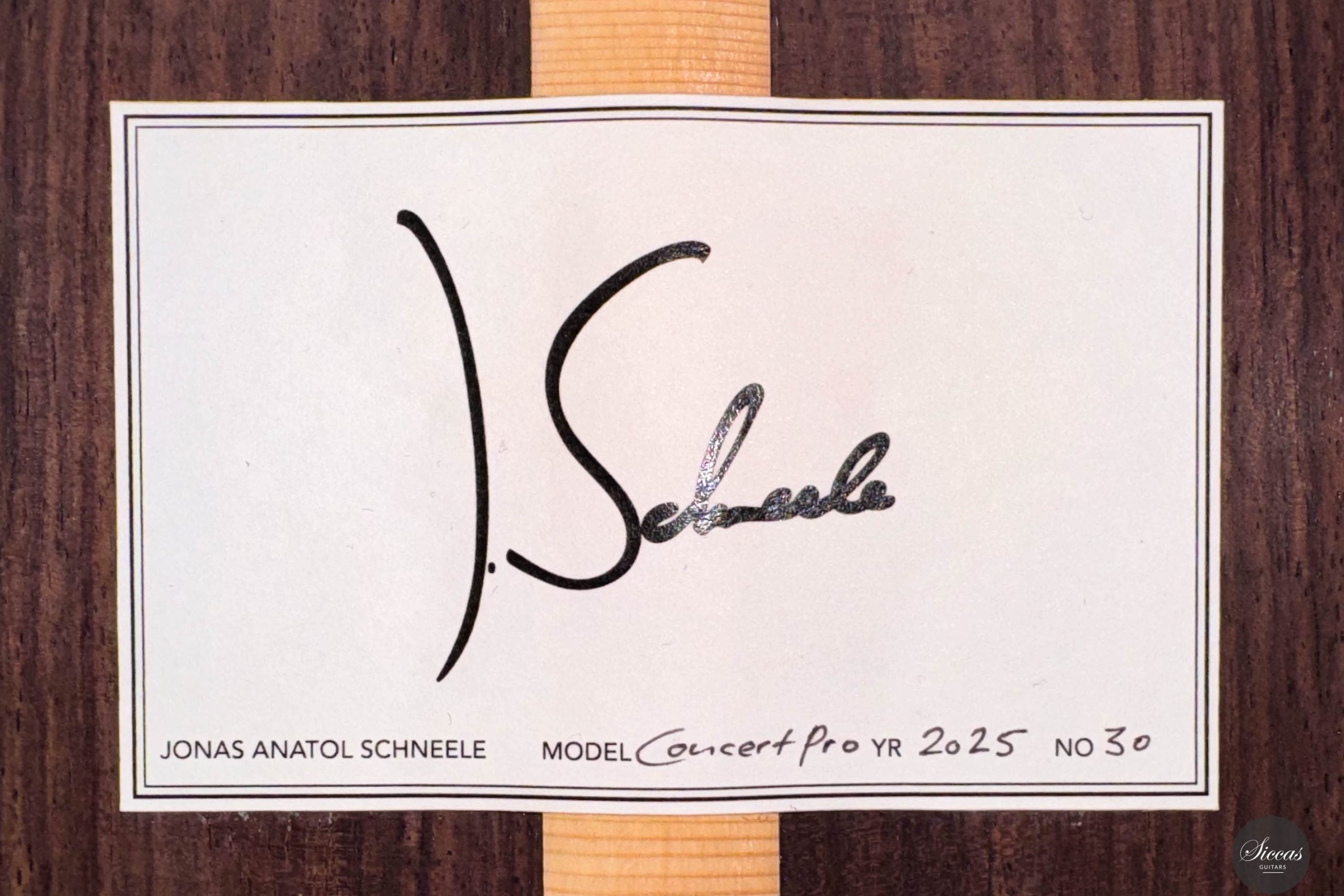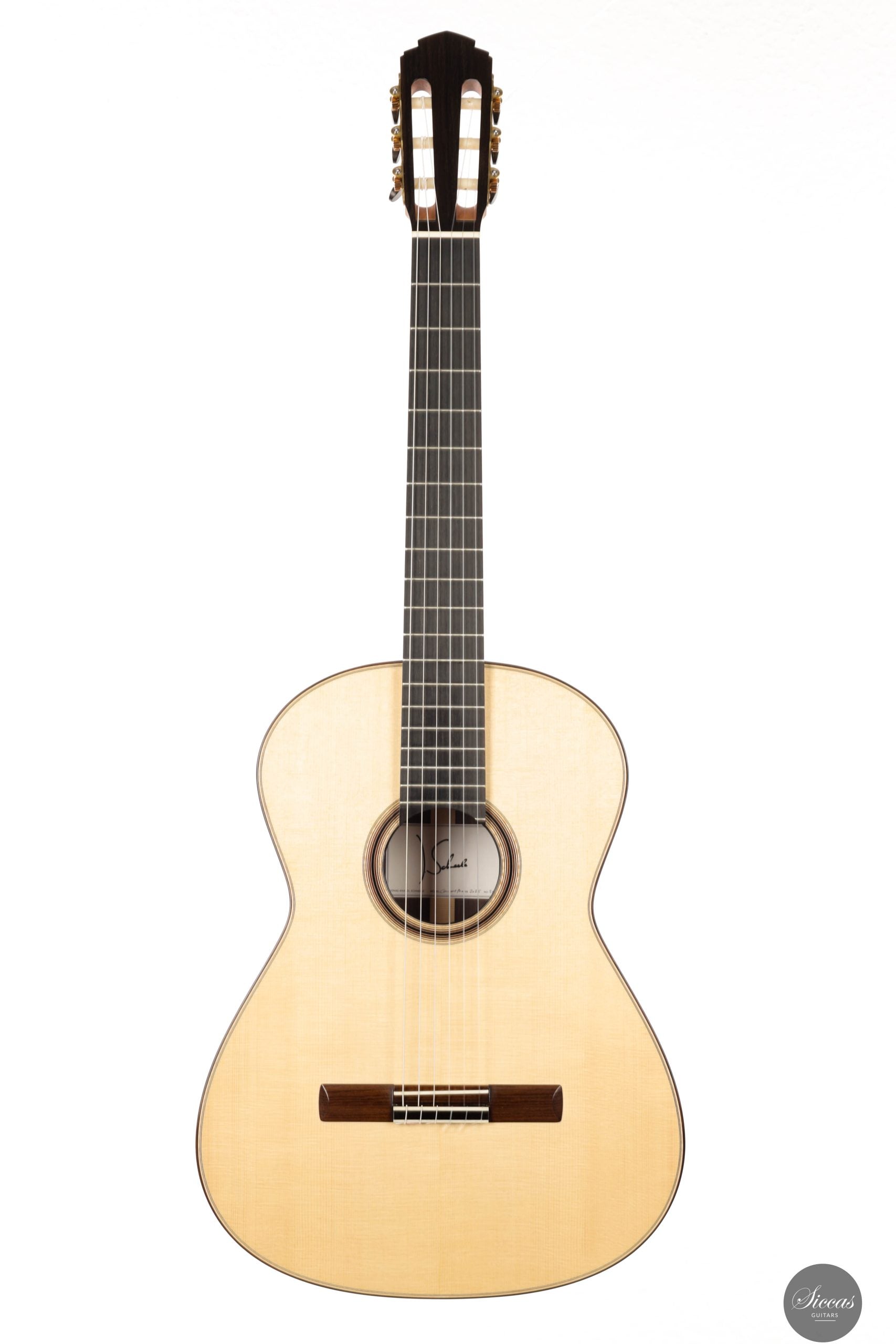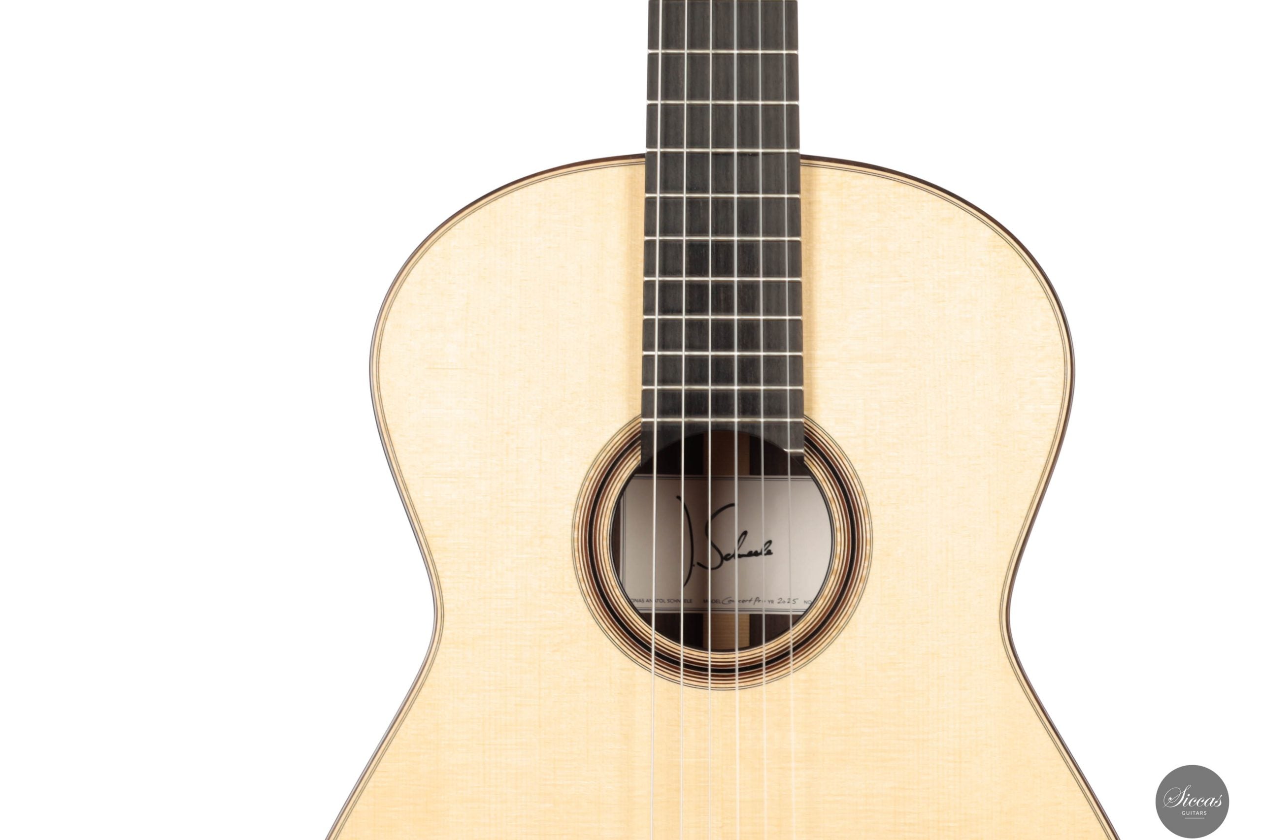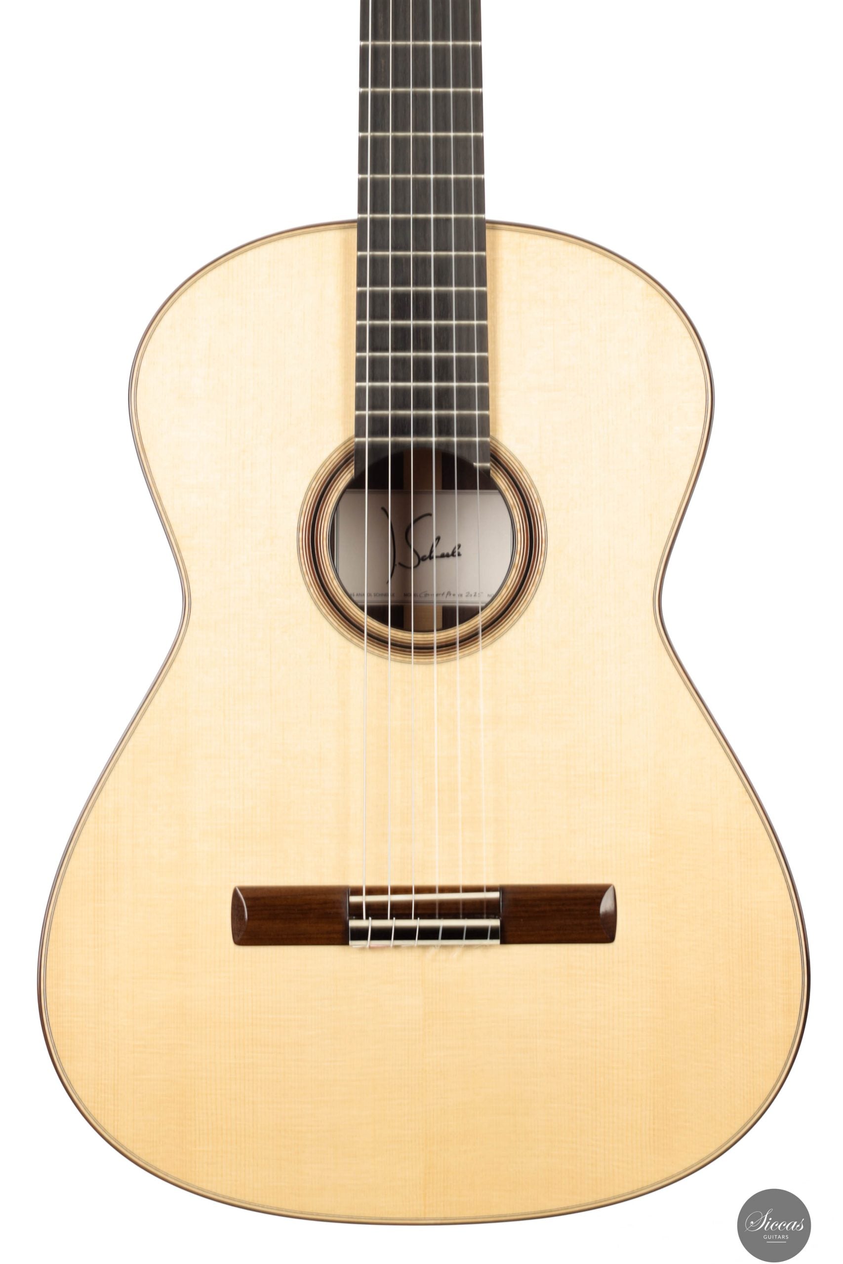 Jonas Anatol Schneele discovered his passion for guitar making early on as an enthusiastic guitarist. After completing an apprenticeship as a carpenter, he followed his fascination for wood and sound and trained as a plucked instrument maker at the technical college in Mittenwald, graduating in 2007. From 2013 to 2016, he deepened his knowledge of acoustics, restoration, innovative construction techniques, and musical instrument design through further studies at the College of Musical Instrument Construction in Markneukirchen. In 2017, he successfully completed his master craftsman’s examination in Mittenwald. Today, Jonas Schneele is one of the promising new generation of German luthiers, known for his precision craftsmanship, balanced tonal aesthetics, and thoughtful innovations.About the guitar