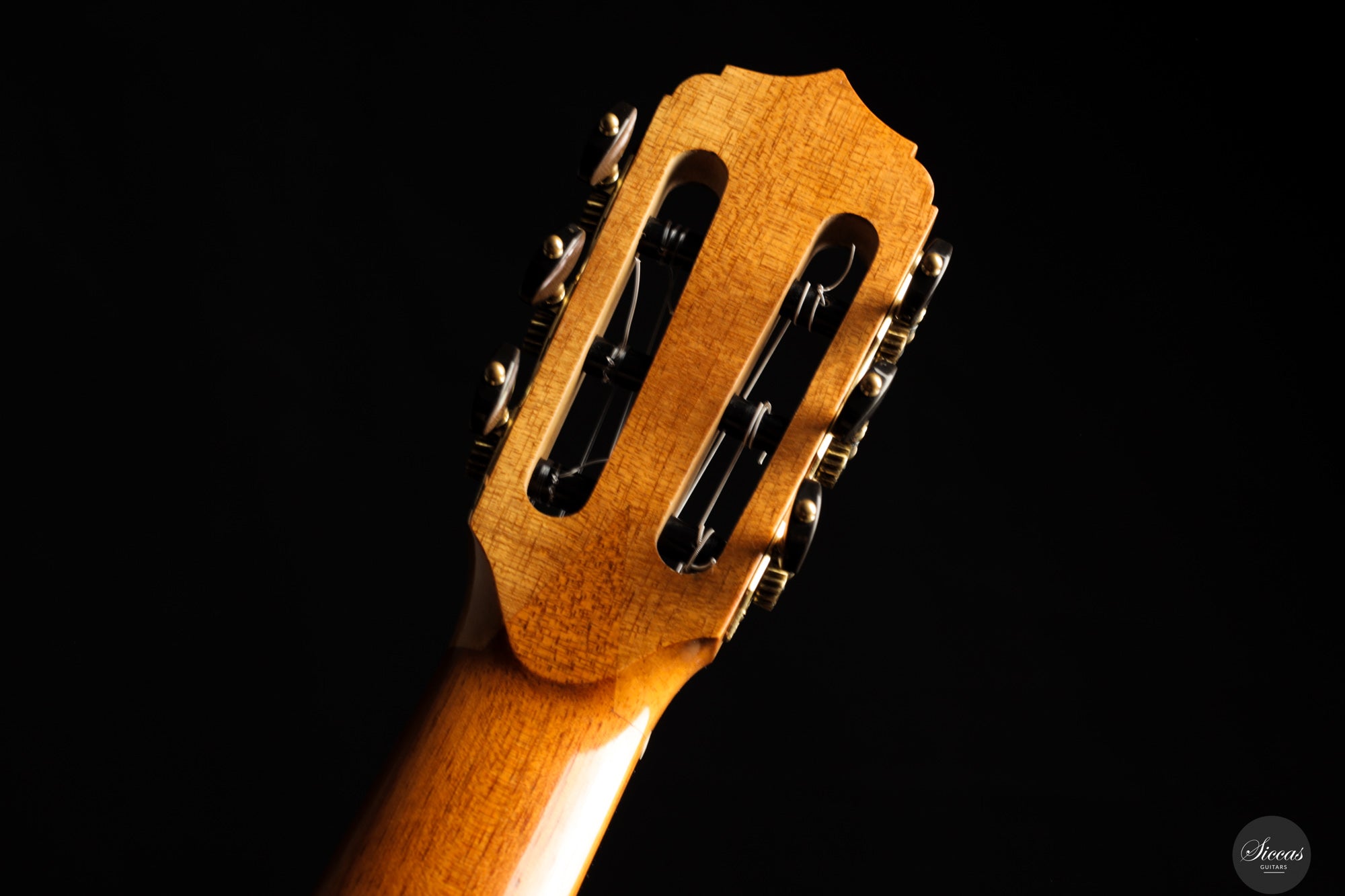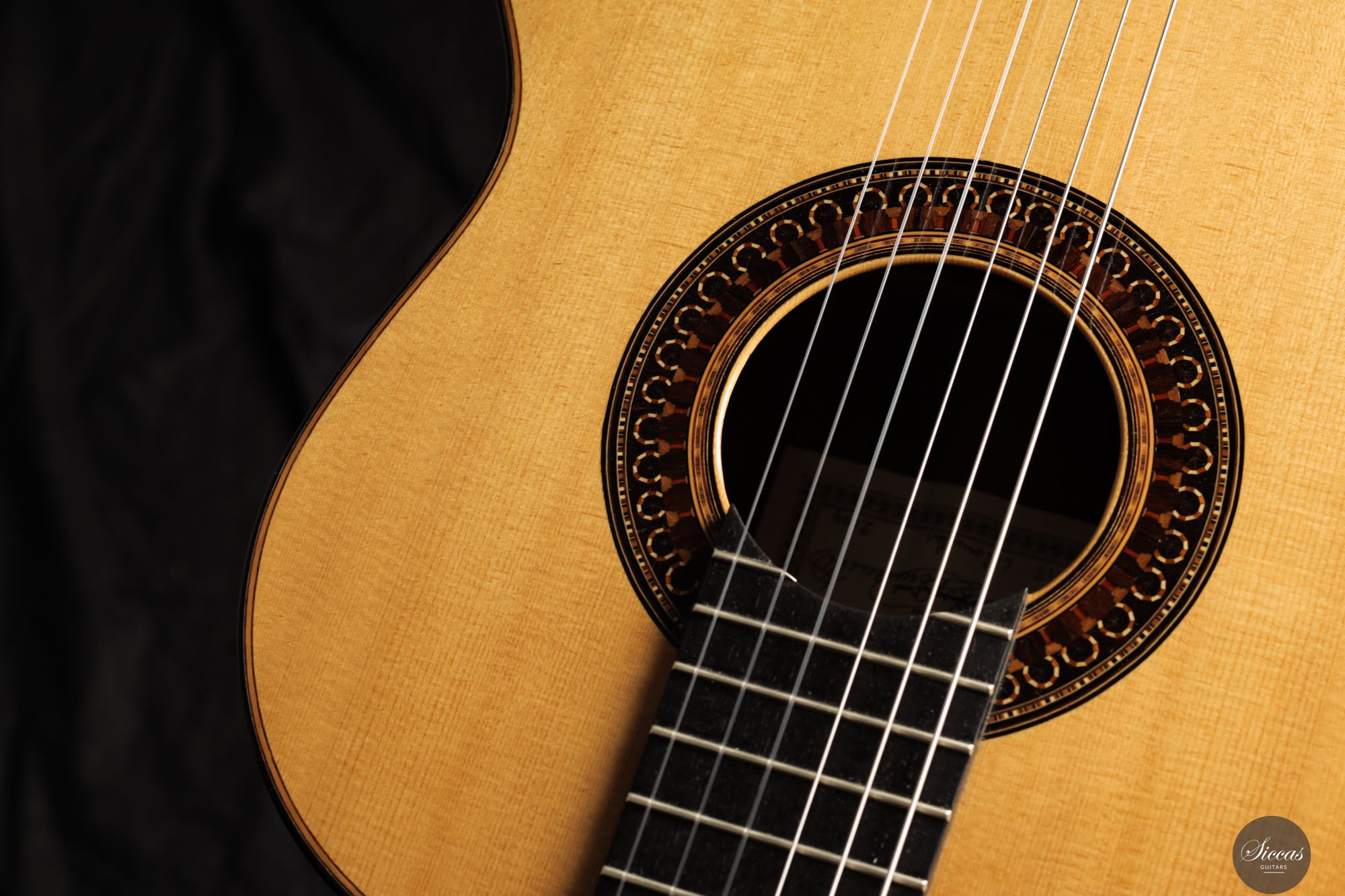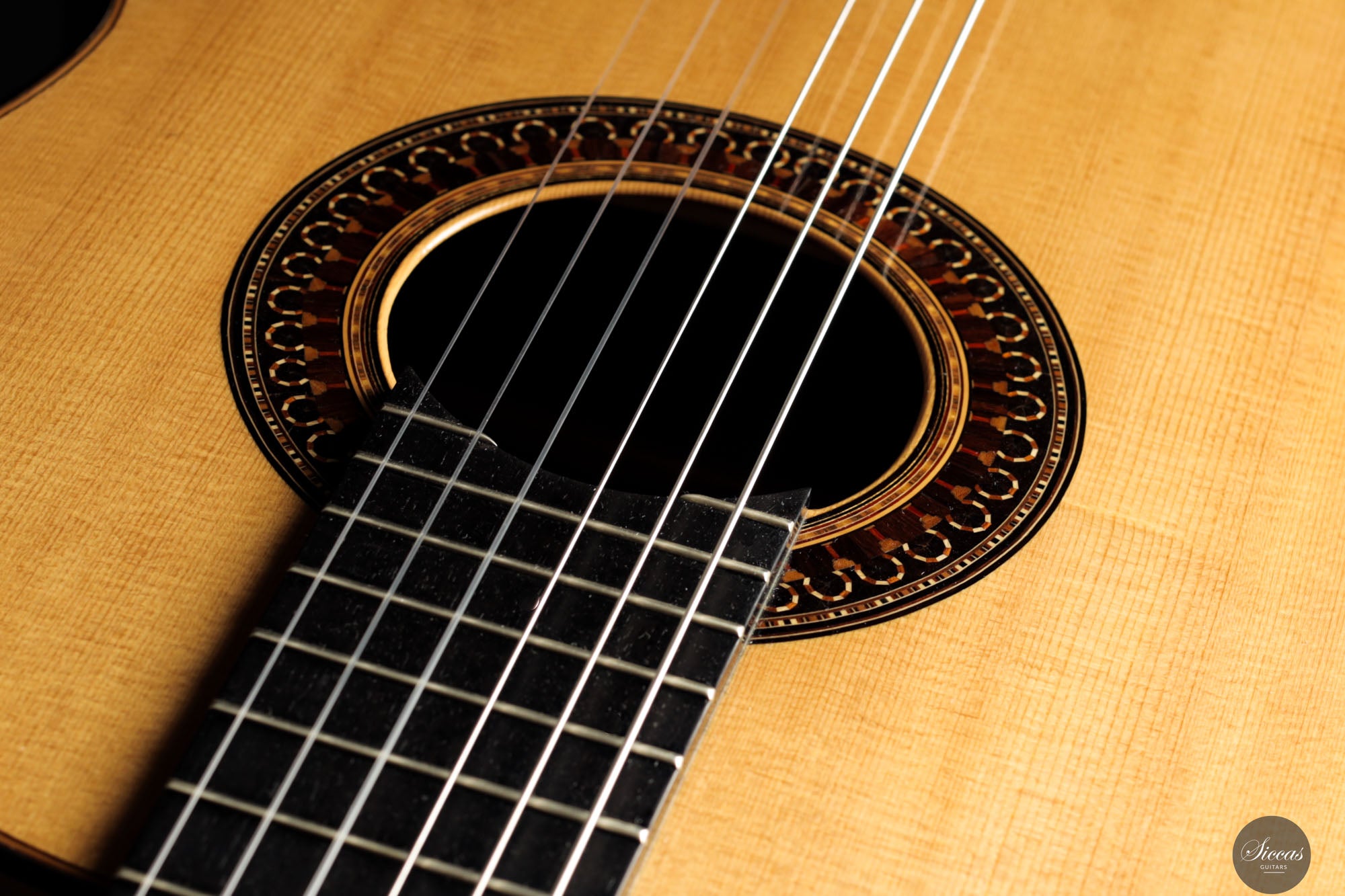 Die 2004 gebaute Gitarre mit der Nummer 818 trägt den Namen „La Sonrisa“ – „Das Lächeln“. Dieser poetische Name spiegelt nicht nur den Charakter des Instruments wider, sondern auch die Feinfühligkeit, mit der Romanillos jedes Detail gestaltet hat. Vom kunstvoll gearbeiteten Rosettenmuster über die Kopfplatte bis zur eleganten Stegverzierung zeigt sich seine unverkennbare Handschrift.