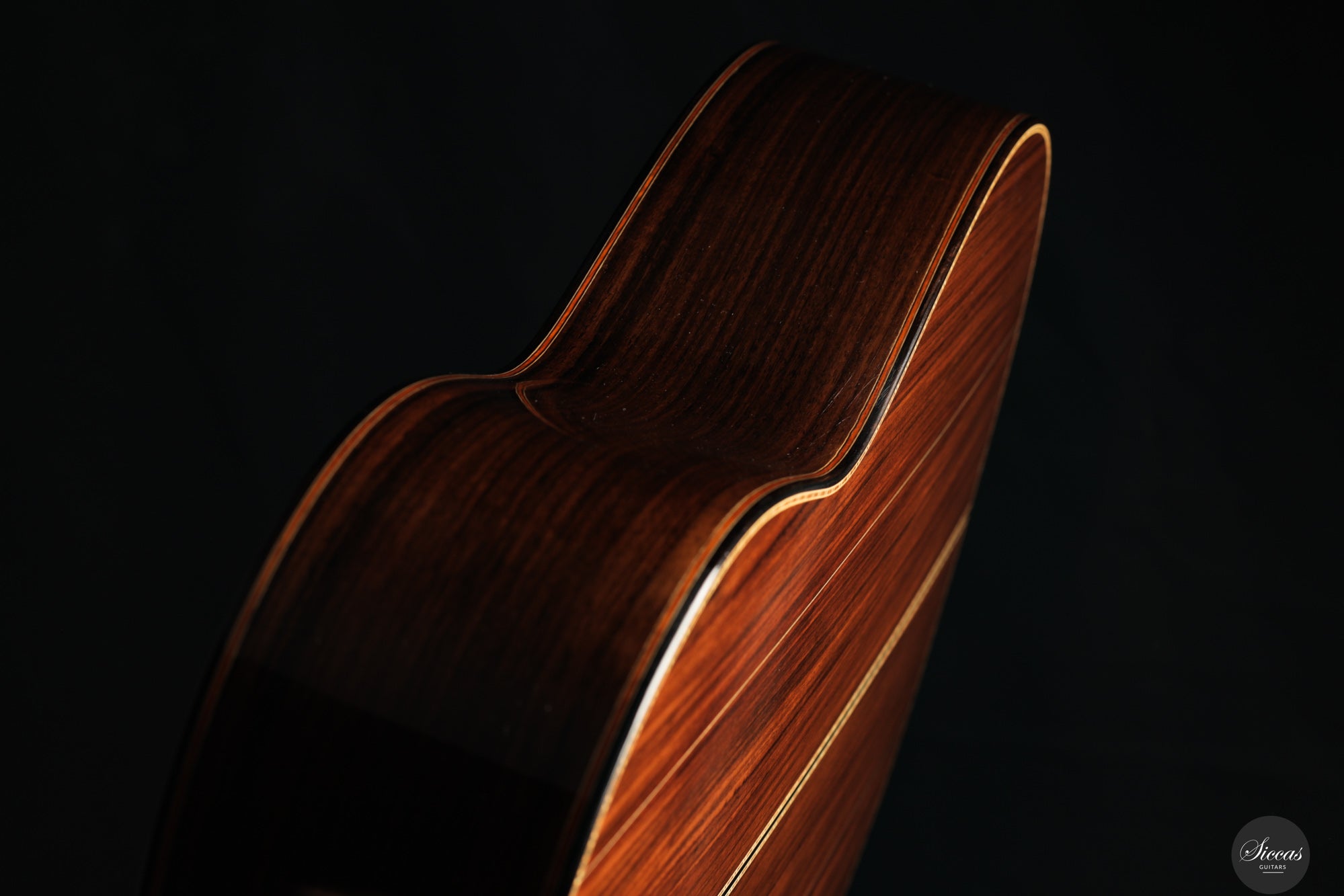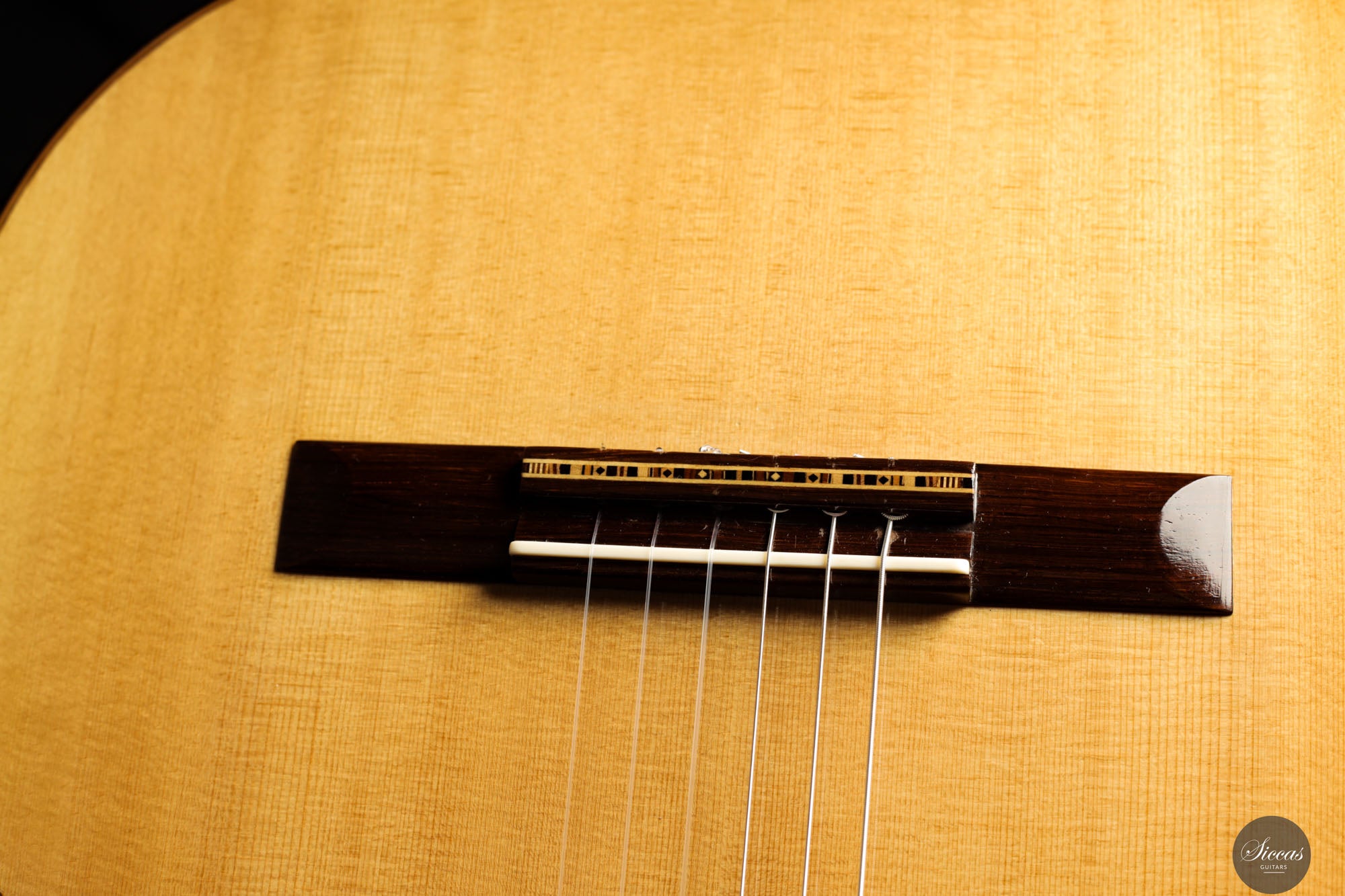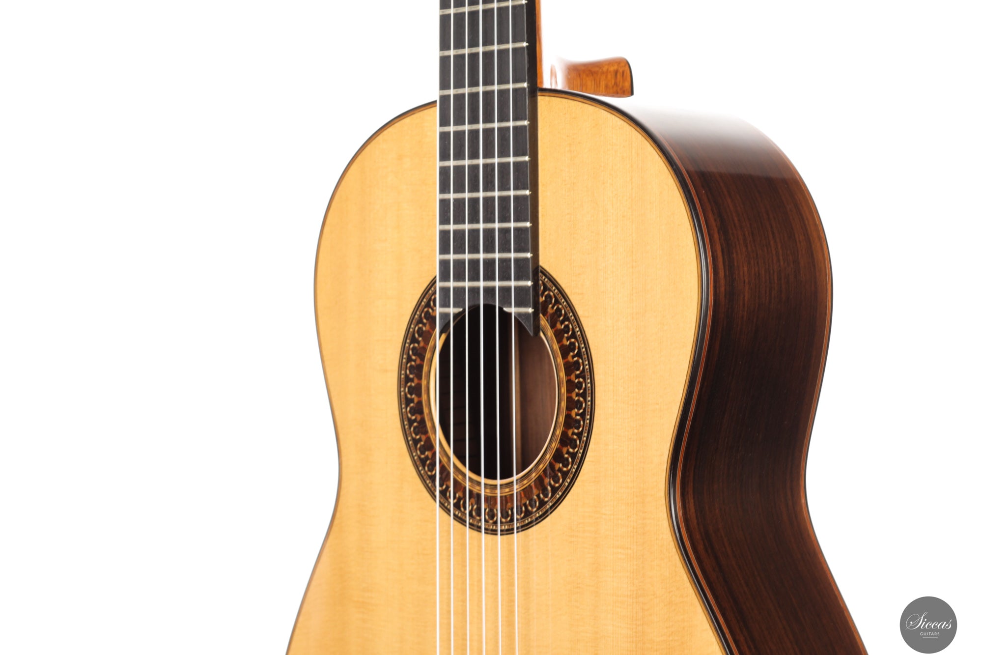 Die 2004 gebaute Gitarre mit der Nummer 818 trägt den Namen „La Sonrisa“ – „Das Lächeln“. Dieser poetische Name spiegelt nicht nur den Charakter des Instruments wider, sondern auch die Feinfühligkeit, mit der Romanillos jedes Detail gestaltet hat. Vom kunstvoll gearbeiteten Rosettenmuster über die Kopfplatte bis zur eleganten Stegverzierung zeigt sich seine unverkennbare Handschrift.