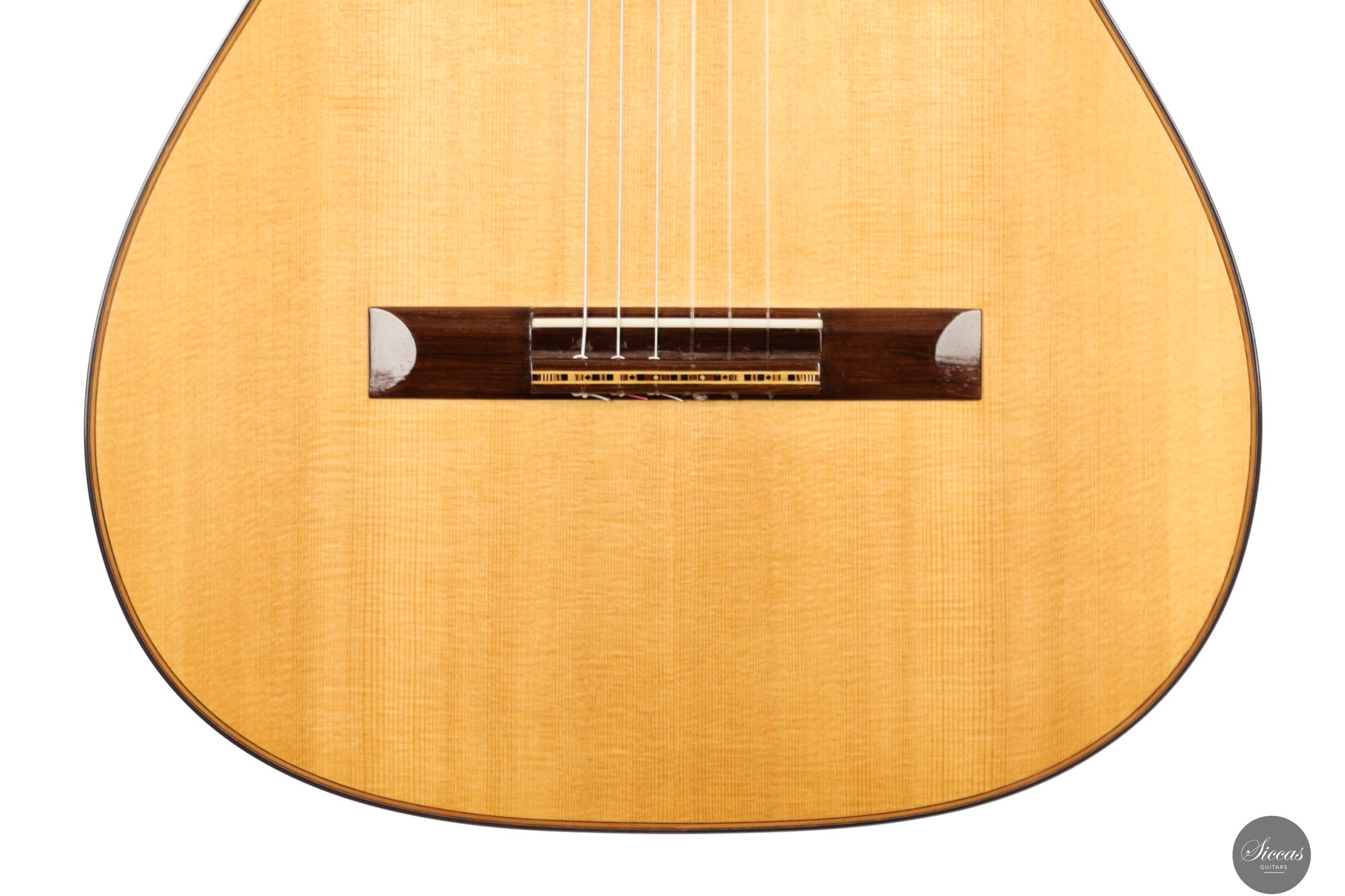Klanglich bietet „La Sonrisa“ eine außergewöhnlich lyrische Stimme mit langem Nachklang, ausgeglichener Ansprache und einer tief emotionalen Klangfarbe. Jeder Ton entfaltet sich klar und doch warm, getragen von einer weichen Eigenresonanz. Besonders beeindruckend ist die Gleichmäßigkeit über das gesamte Griffbrett hinweg – unabhängig von Lage oder Dynamik bleibt die Klangprojektion konsistent. Die Bässe sind rund und stützend, die Höhen transparent und gesanglich. Es entsteht ein Klangbild, das zugleich intim, farbenreich und offen wirkt. Obwohl Romanillos-Gitarren oft eine gemeinsame tonale Signatur teilen, besitzt „La Sonrisa“ eine eigene, individuelle Ausdruckskraft, die sie besonders macht.