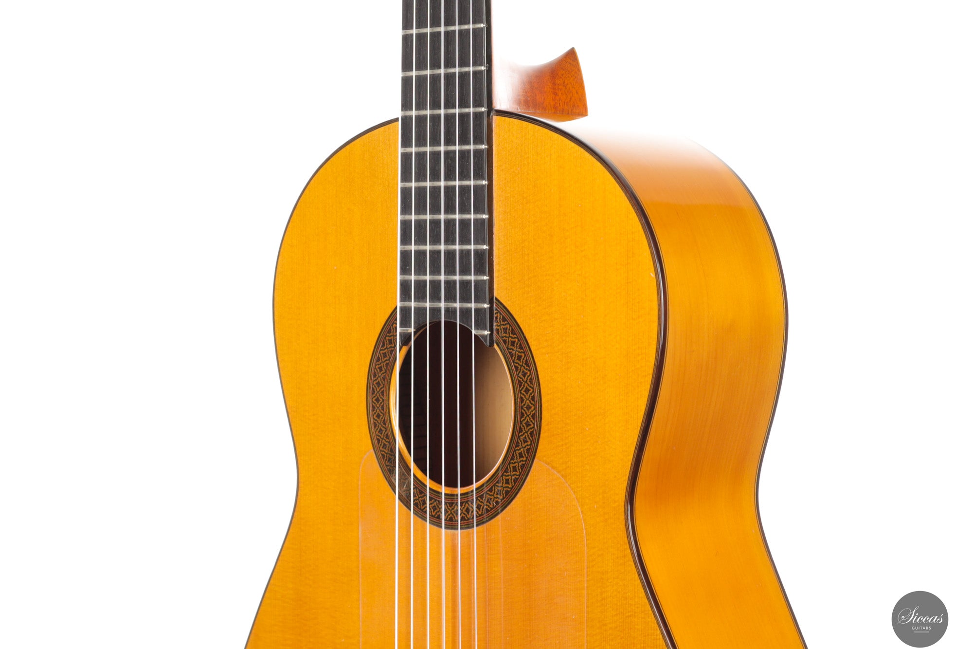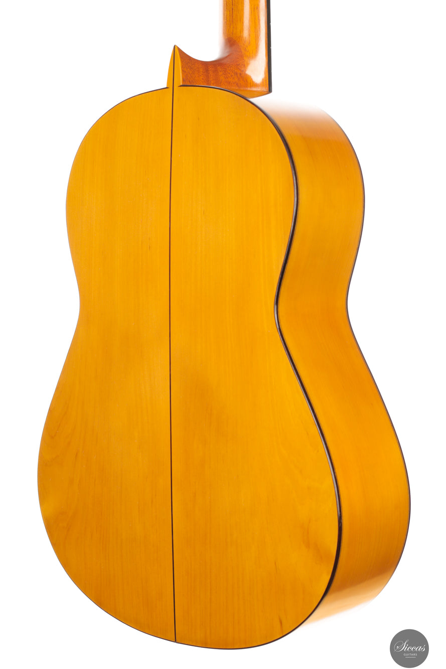 Klanglich präsentiert sich die Gitarre direkt, kraftvoll und durchsetzungsfähig mit sehr schneller Ansprache. Der Ton spricht unmittelbar an und unterstützt die rhythmische Präzision, die für den Flamencostil essenziell ist. Der Klang bleibt dabei fokussiert und substanzreich und verliert auch bei hoher Dynamik nicht an Kern. Intern trägt die Gitarre den Stempel mit den Initialen AM, die sehr wahrscheinlich Antonio Martínez Ortega zuzuordnen sind, einem Gitarrenbauer, der unter anderem Instrumente für Andrés Segovia und Christopher Parkening gefertigt hat. Diese Zuordnung verankert die Gitarre klar in der Tradition der Madrider Werkstattarbeit dieser Epoche.