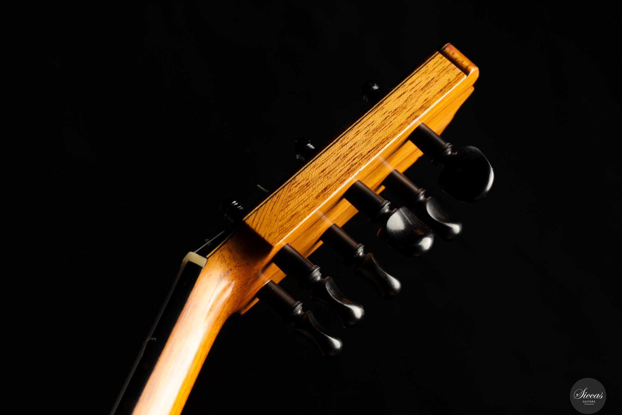 Die Gitarre befindet sich in ausgezeichnetem Zustand. Es sind keine Risse vorhanden und es wurden keine Reparaturen durchgeführt. Das Instrument ist strukturell stabil und vollständig spielfähig.
