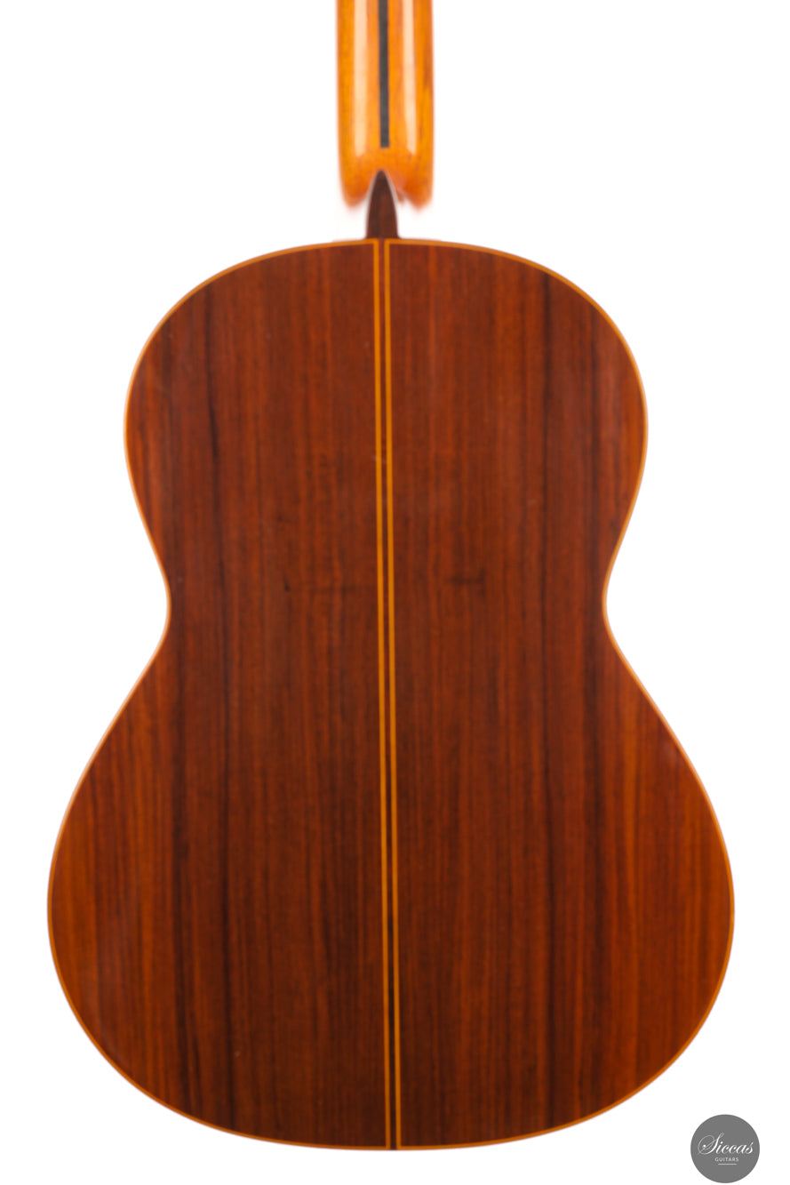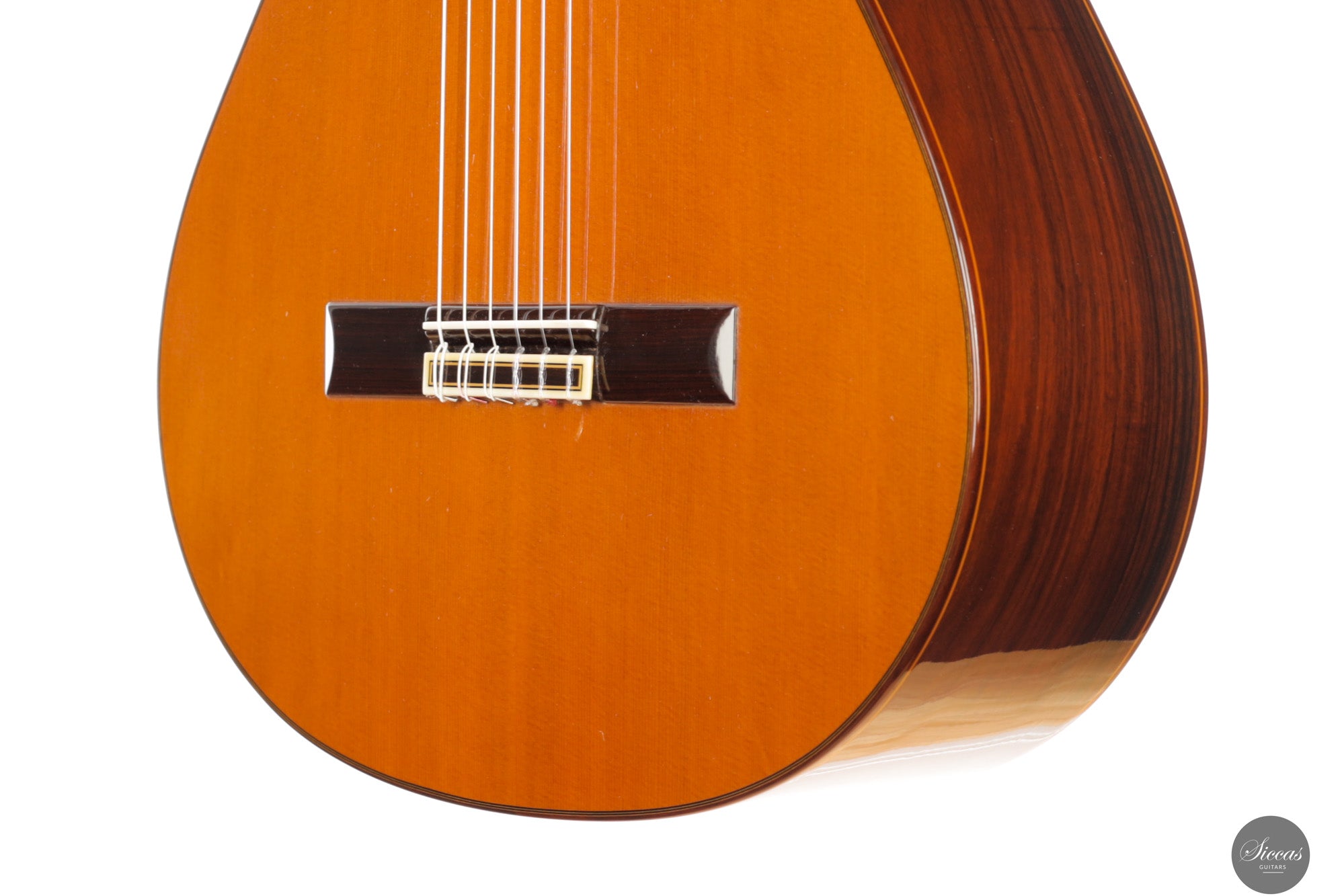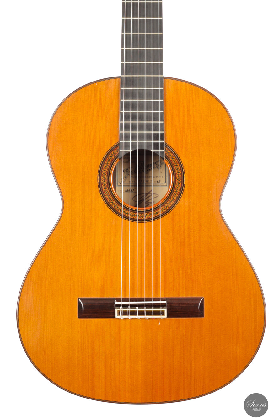 Diese klassische Gitarre von José Ramírez III aus dem Jahr 1985 ist ein repräsentatives Beispiel des traditionellen 1A-Modells aus der späteren Phase der einflussreichsten Werkstattjahre. Die Kombination aus Zederndecke und Boden und Zargen aus indischem Palisander entspricht der typischen Bauweise dieser Zeit. Die Polyurethan-Lackierung sorgt für Widerstandsfähigkeit und unterstützt zugleich eine stabile und direkte Klangansprache.