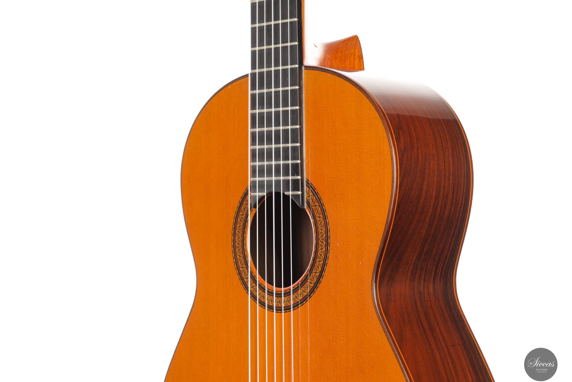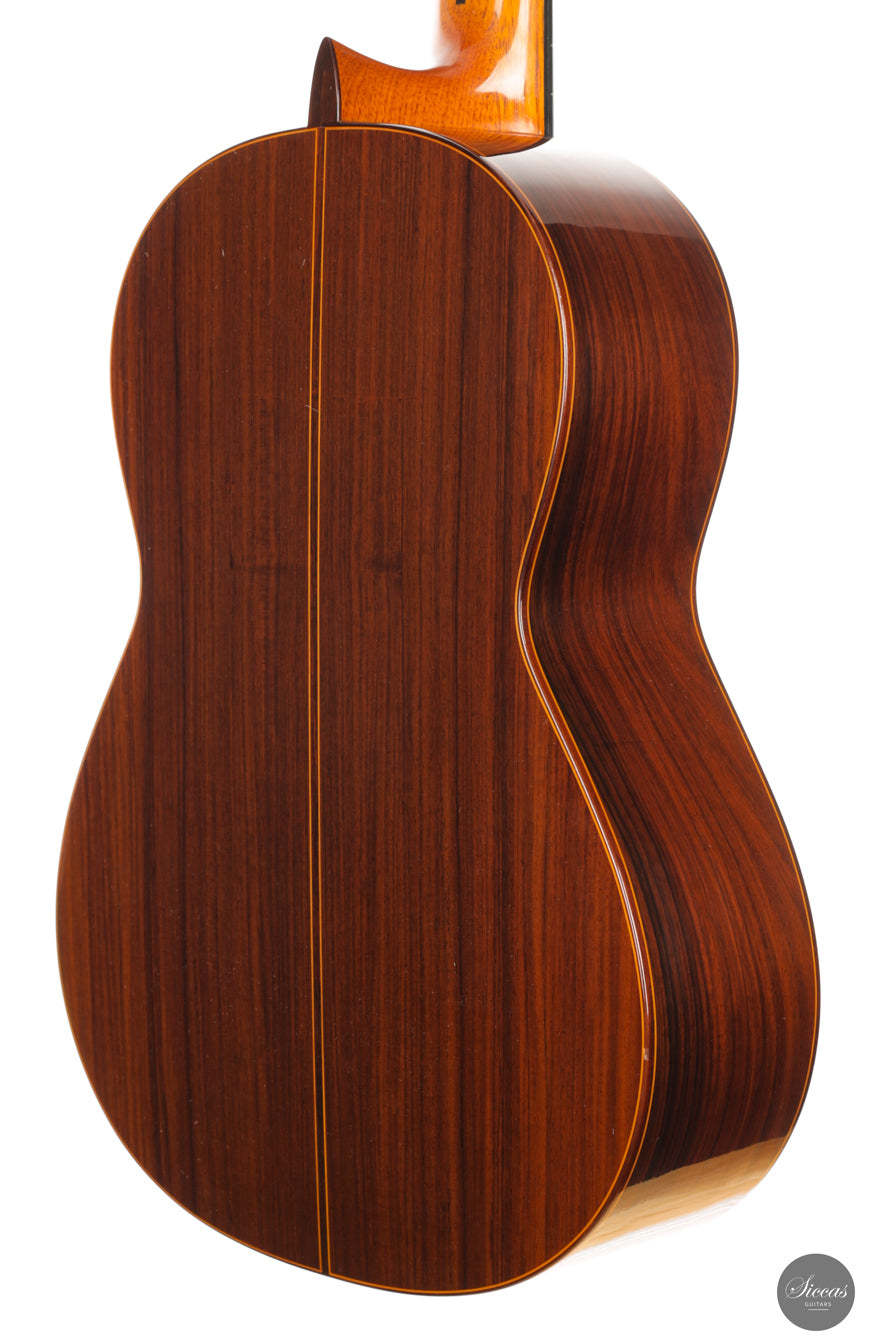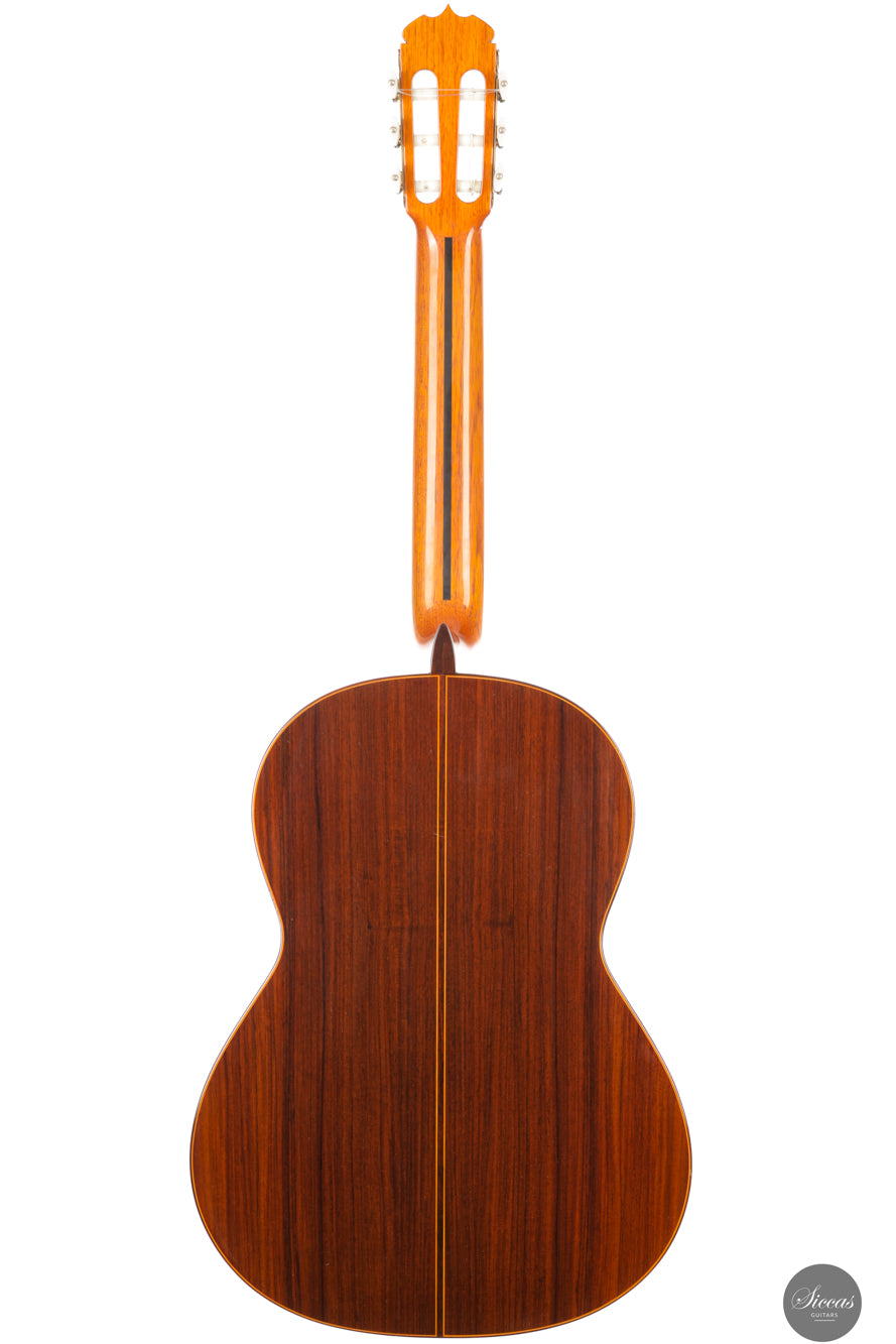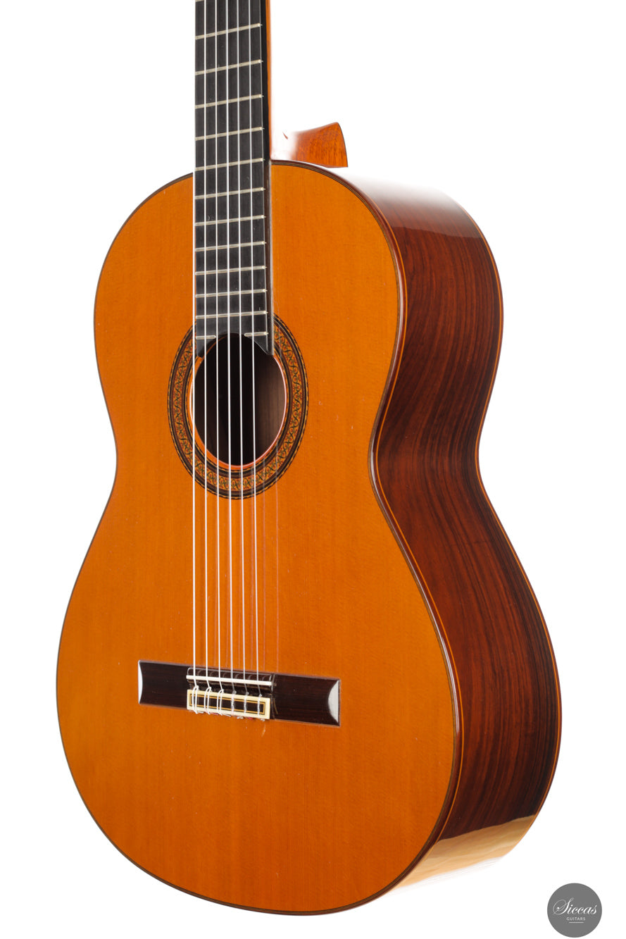 Diese klassische Gitarre von José Ramírez III aus dem Jahr 1985 ist ein repräsentatives Beispiel des traditionellen 1A-Modells aus der späteren Phase der einflussreichsten Werkstattjahre. Die Kombination aus Zederndecke und Boden und Zargen aus indischem Palisander entspricht der typischen Bauweise dieser Zeit. Die Polyurethan-Lackierung sorgt für Widerstandsfähigkeit und unterstützt zugleich eine stabile und direkte Klangansprache.