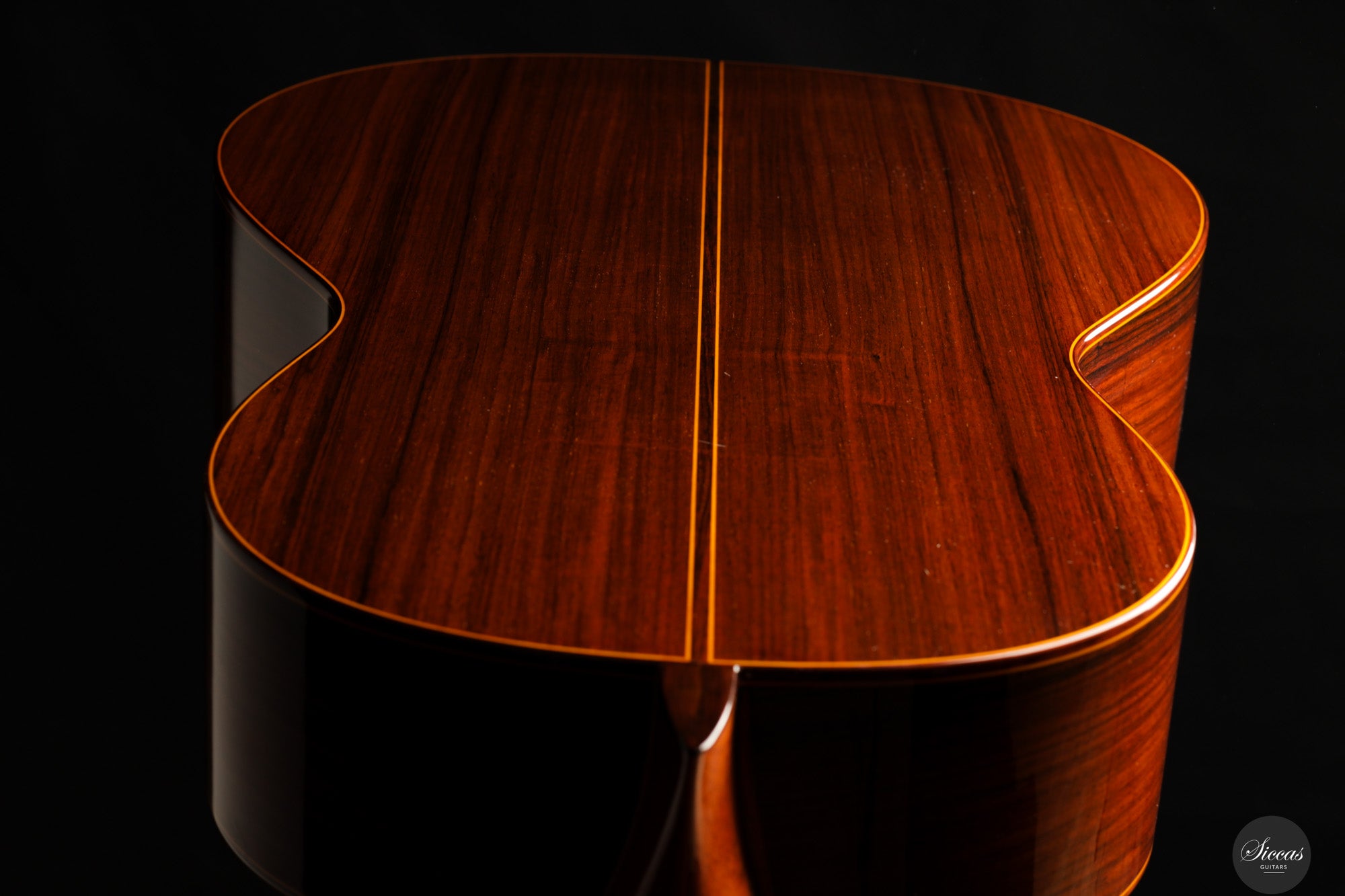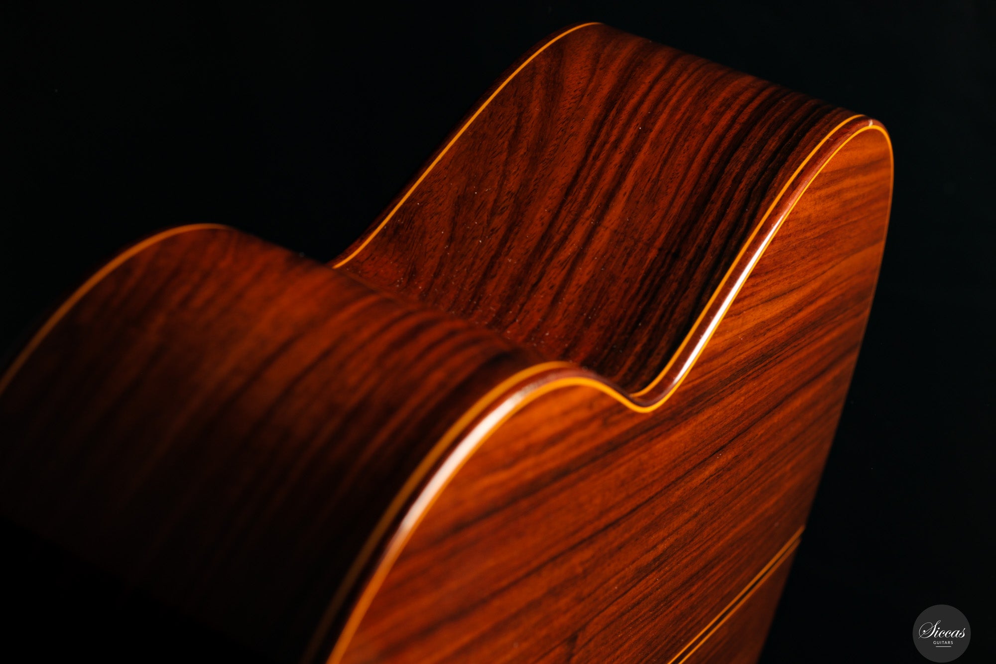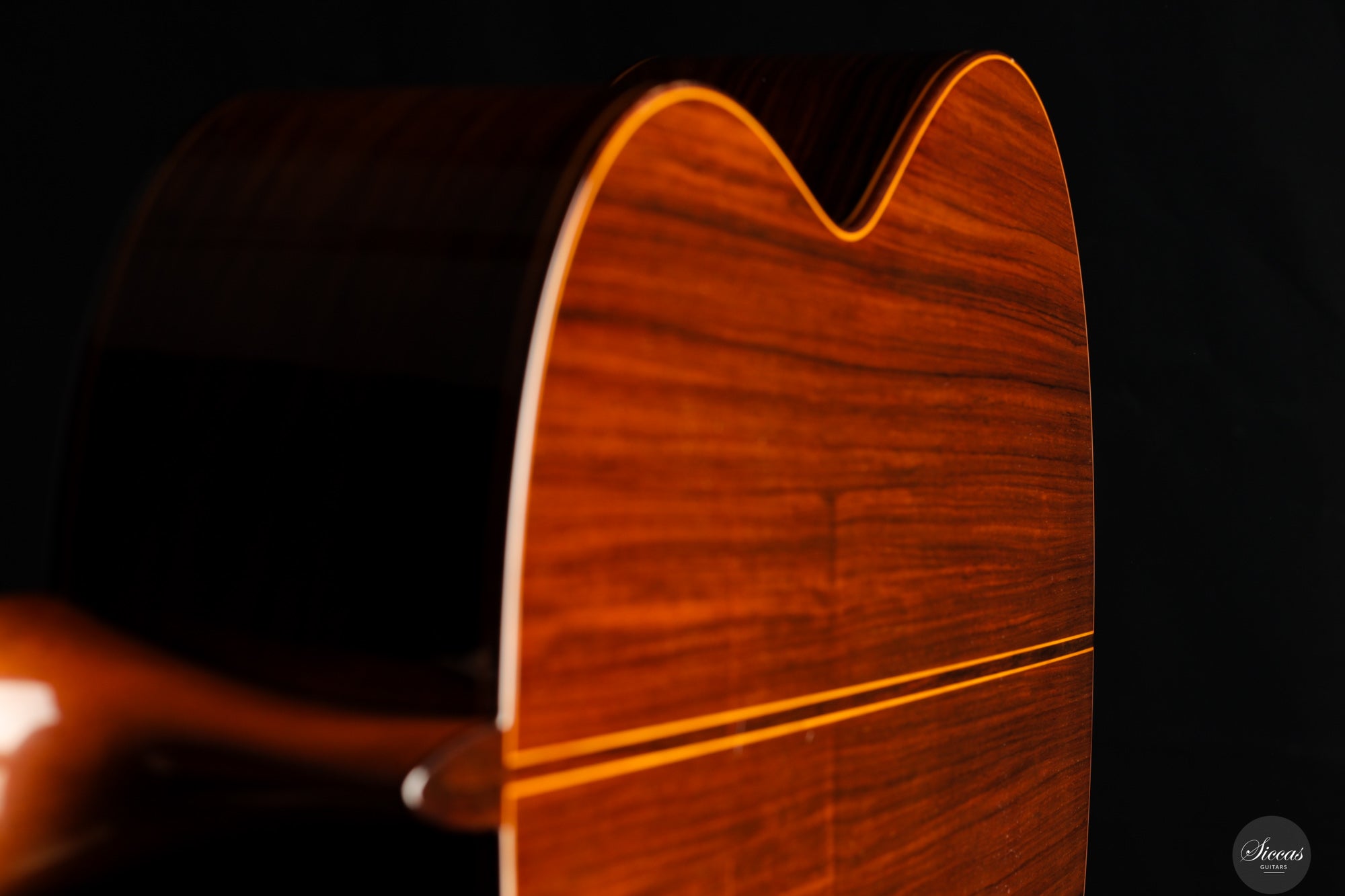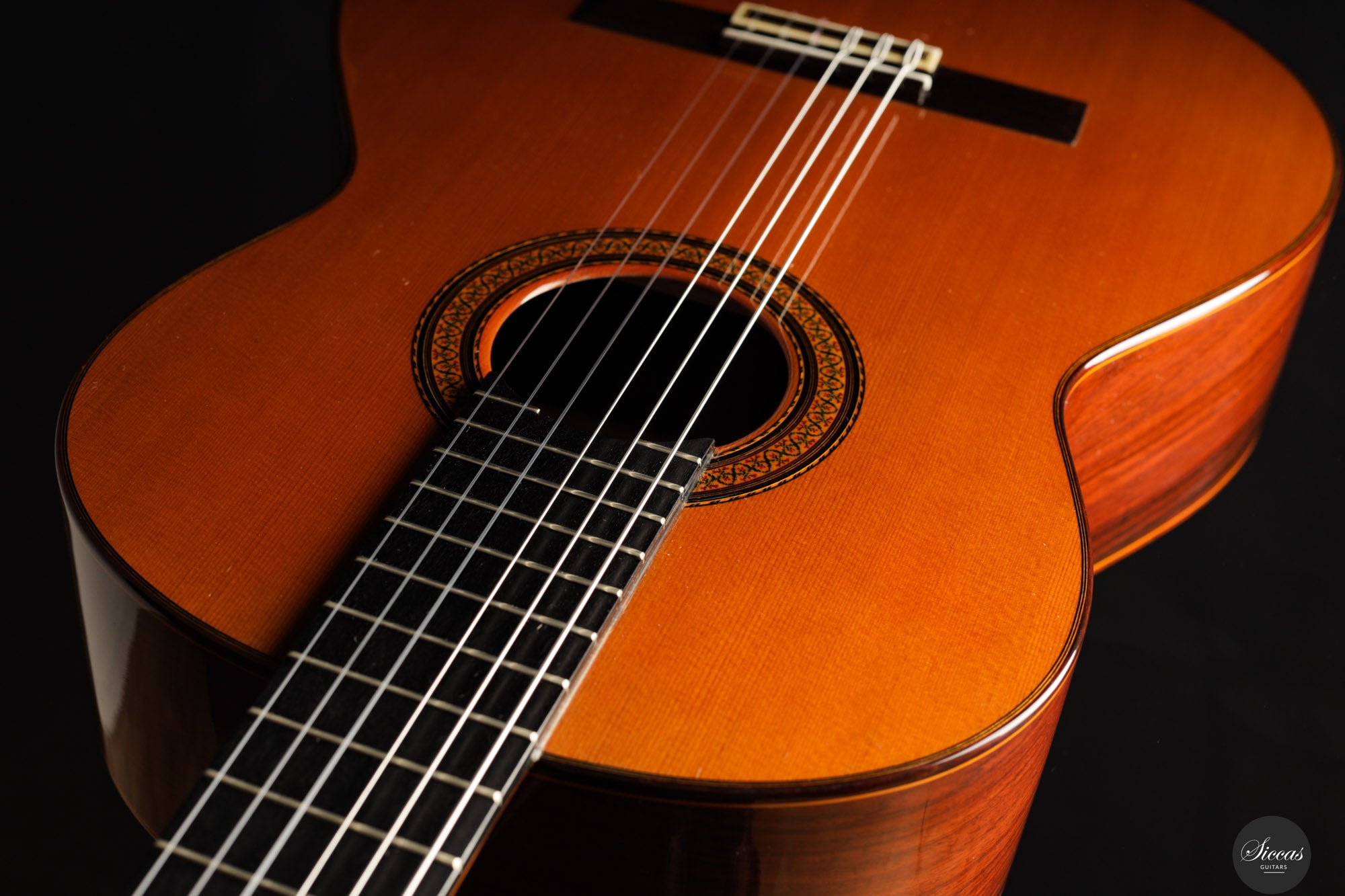 Klanglich zeigt die Gitarre einen klar ausgeprägten spanischen Charakter mit einem tragfähigen und fokussierten Grundton. Die Diskantsaiten überzeugen durch glockenartige Klarheit und Gesanglichkeit, während die Bässe präsent bleiben, ohne an Kontur zu verlieren. Besonders hervorzuheben ist die sehr gute Stimmtrennung. Jede Stimme bleibt deutlich nachvollziehbar, wodurch polyphone Strukturen präzise und ausgewogen dargestellt werden können. Das Instrument vermittelt ein souveränes Spielgefühl und eignet sich hervorragend für Repertoire, das Klarheit, Projektion und eine traditionelle Konzertstimme verlangt.