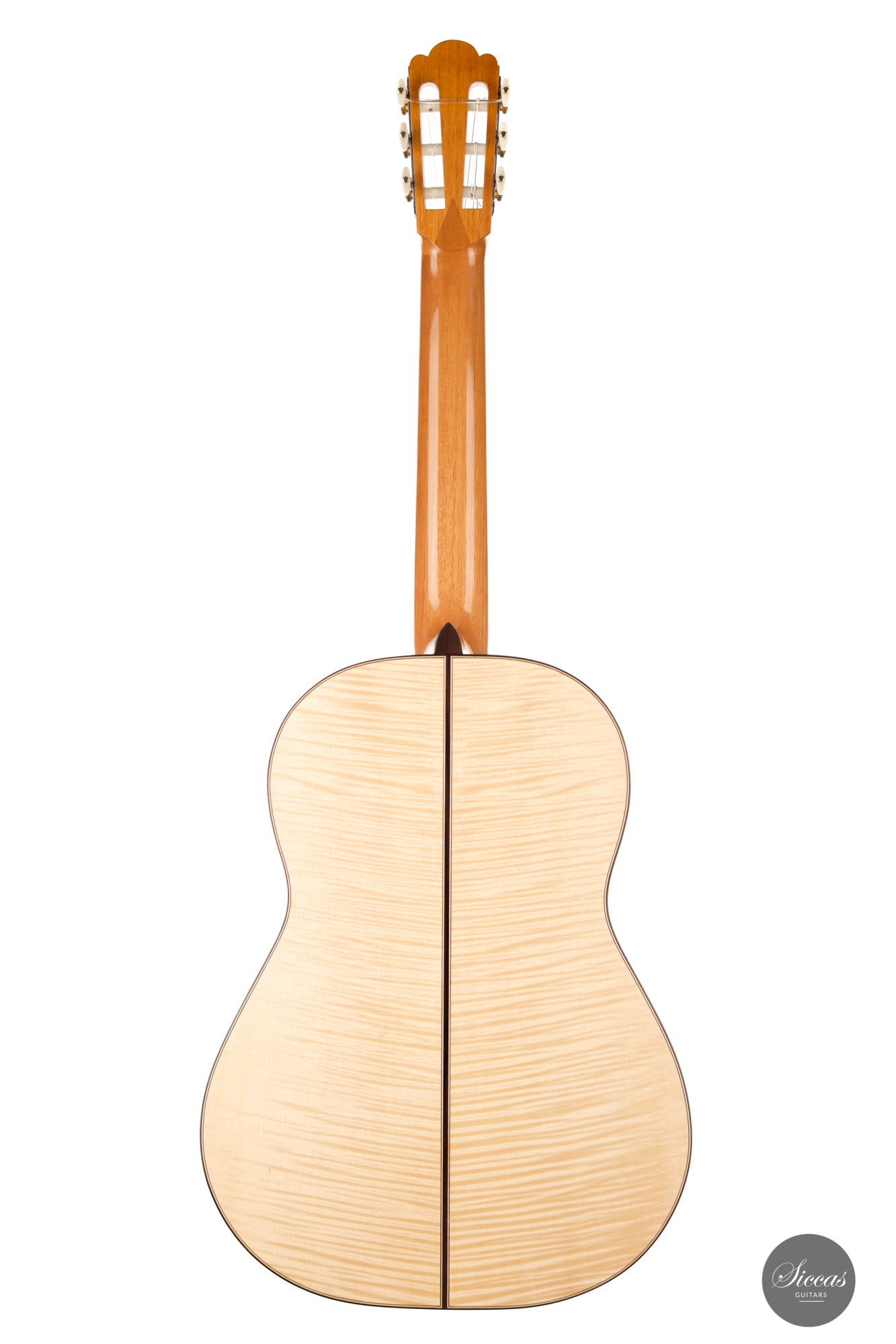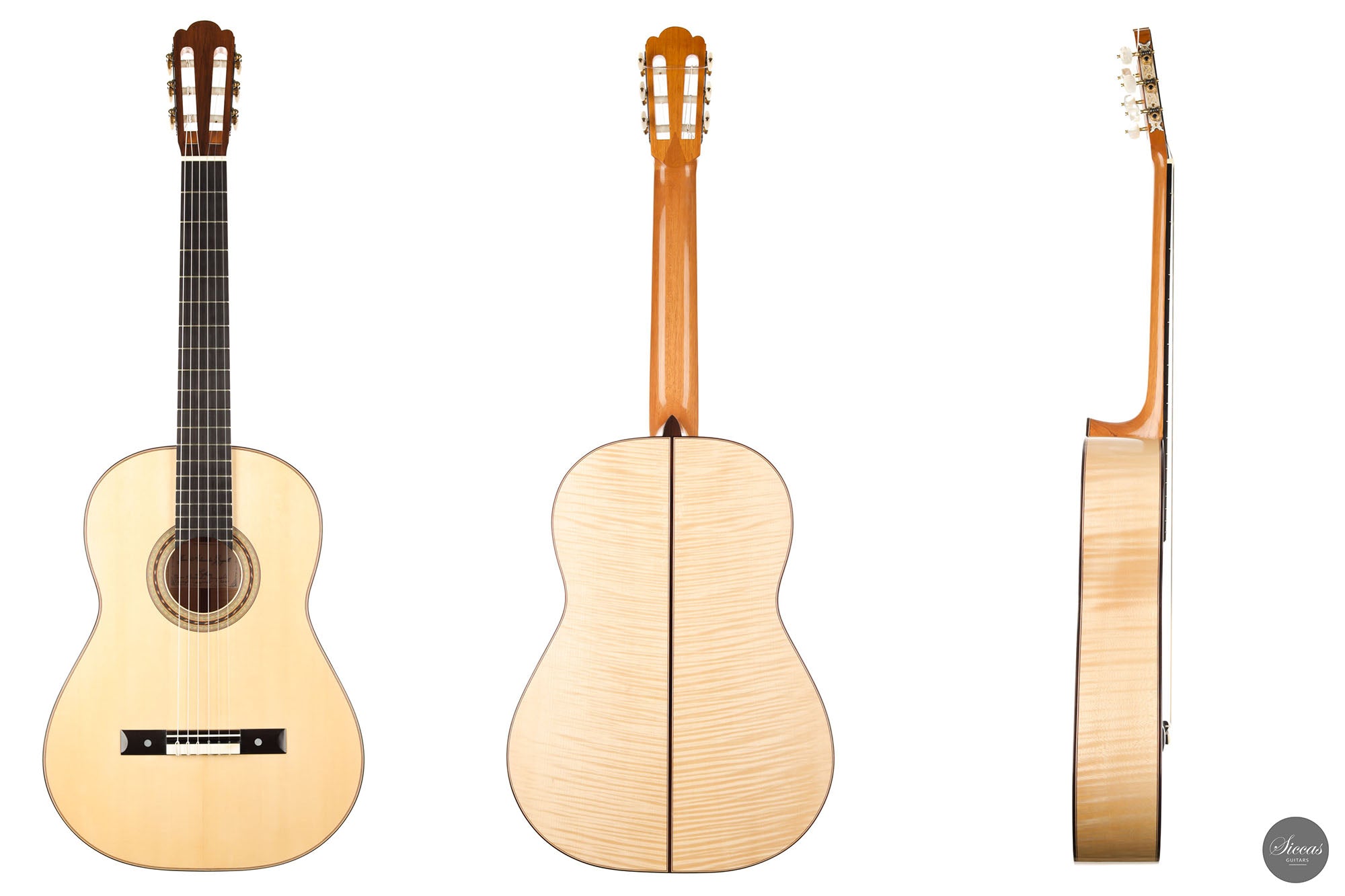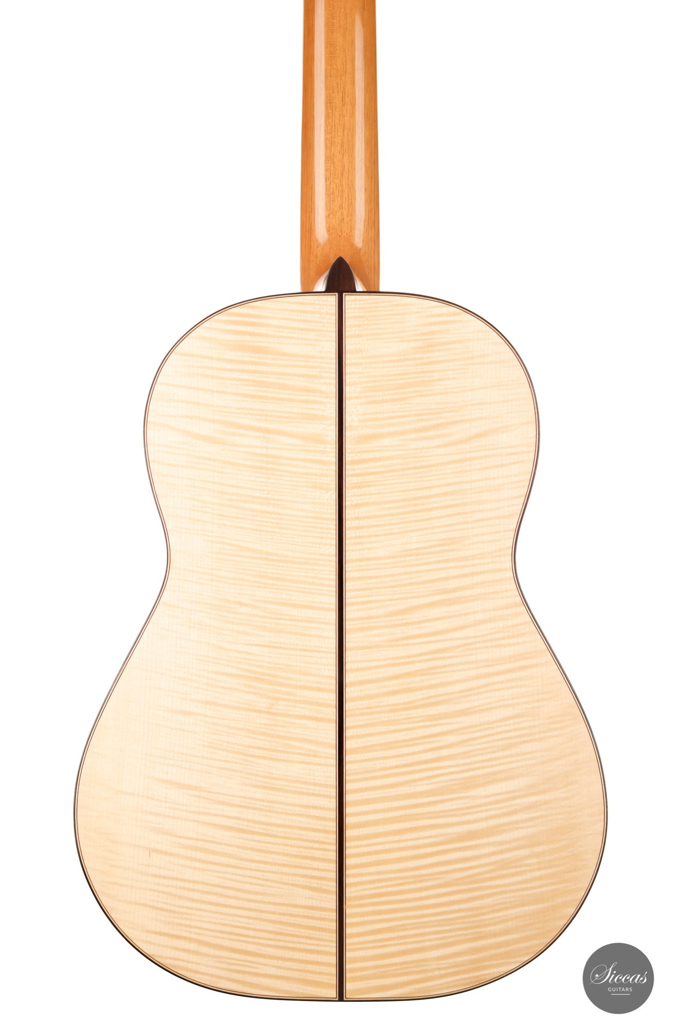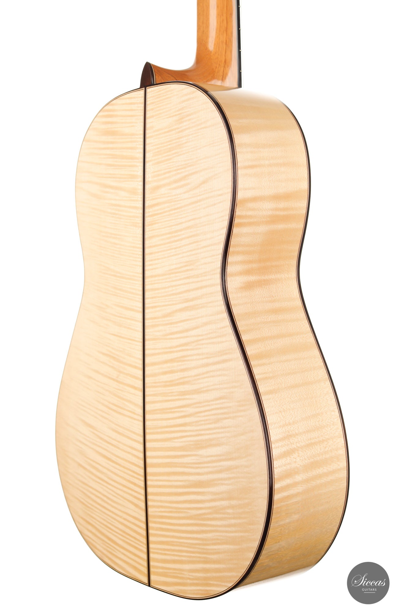 This unique, lightweight guitar is crafted in the style of Antonio de Torres, with a spruce top and maple back and sides. It is fully french polished with a very transparent shellac, so that the natural colours of the wood are revealed very well and the fascinating reflections of the annual rings can be admired. Some beautiful construction details such as the mother-of-pearl dots on the bridge and the green shades of the rosette are also reminiscent of Antonio de Torres' aesthetic universe.