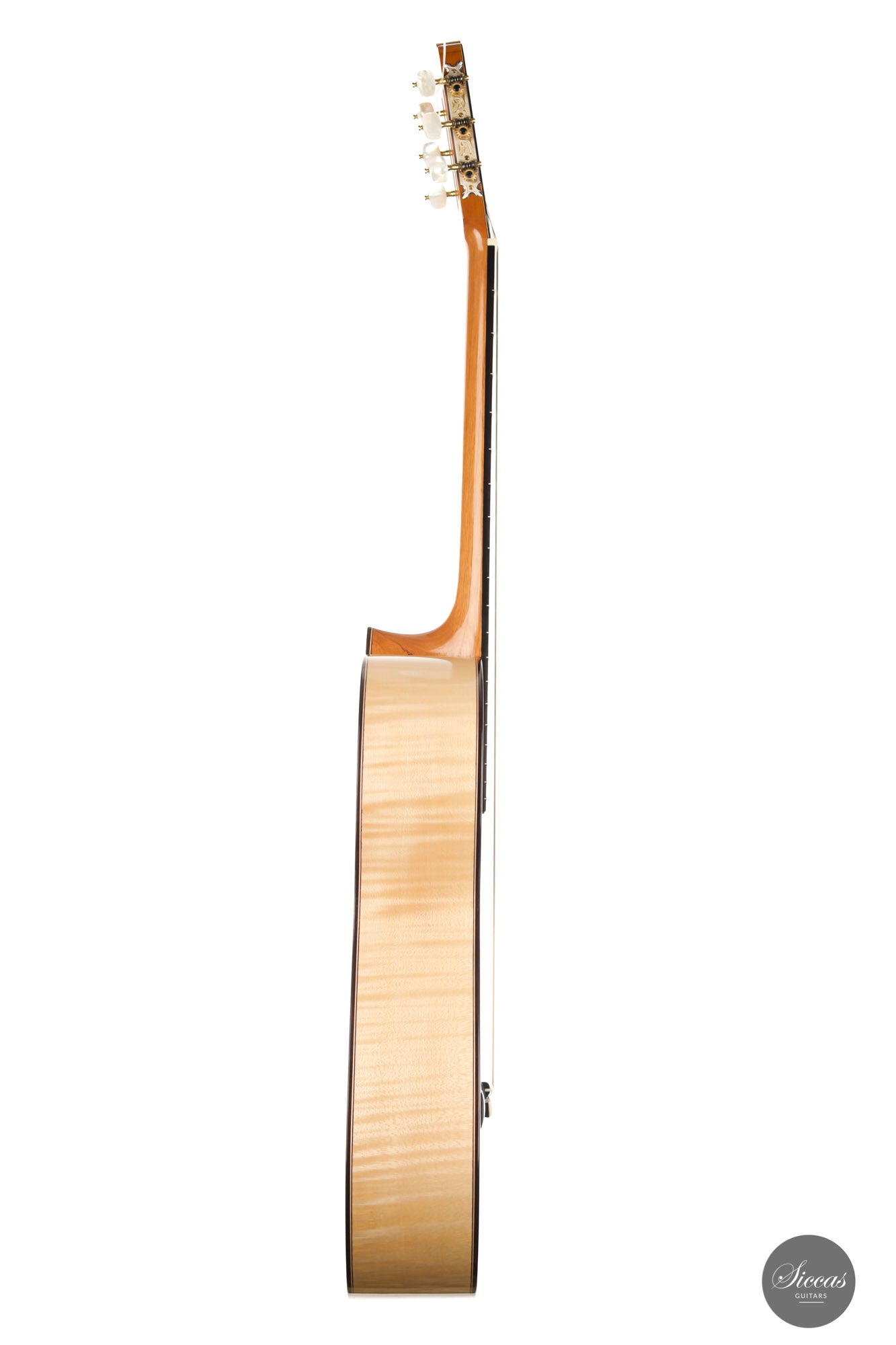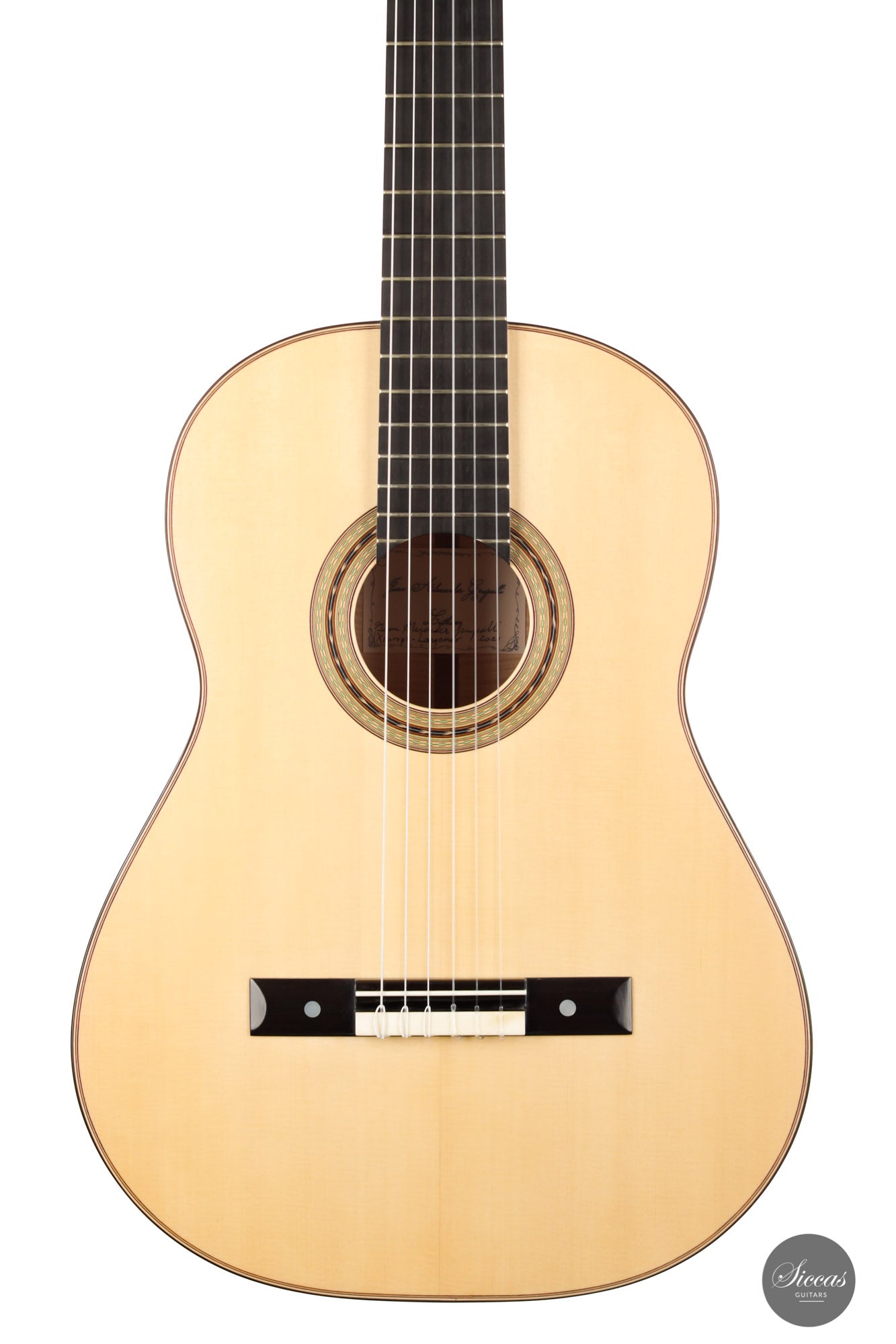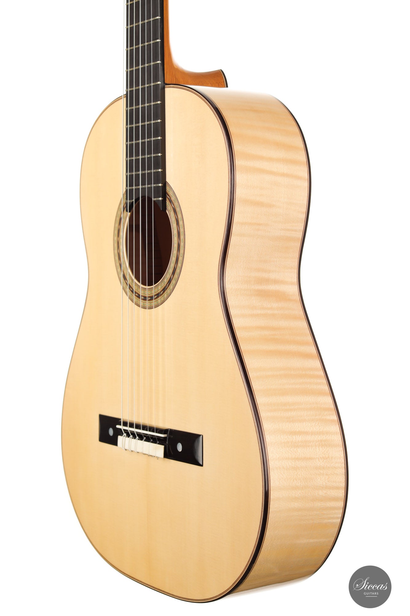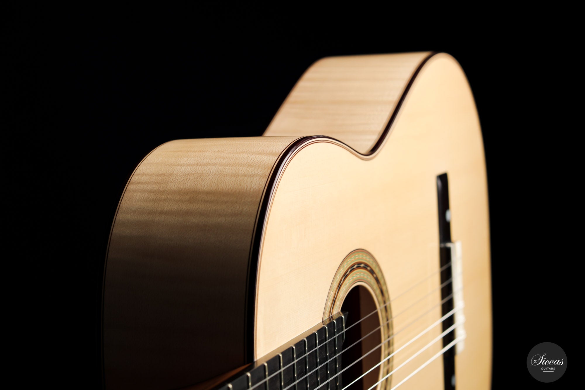 This unique, lightweight guitar is crafted in the style of Antonio de Torres, with a spruce top and maple back and sides. It is fully french polished with a very transparent shellac, so that the natural colours of the wood are revealed very well and the fascinating reflections of the annual rings can be admired. Some beautiful construction details such as the mother-of-pearl dots on the bridge and the green shades of the rosette are also reminiscent of Antonio de Torres' aesthetic universe.