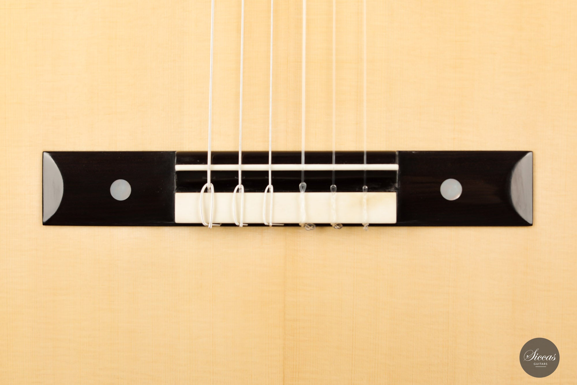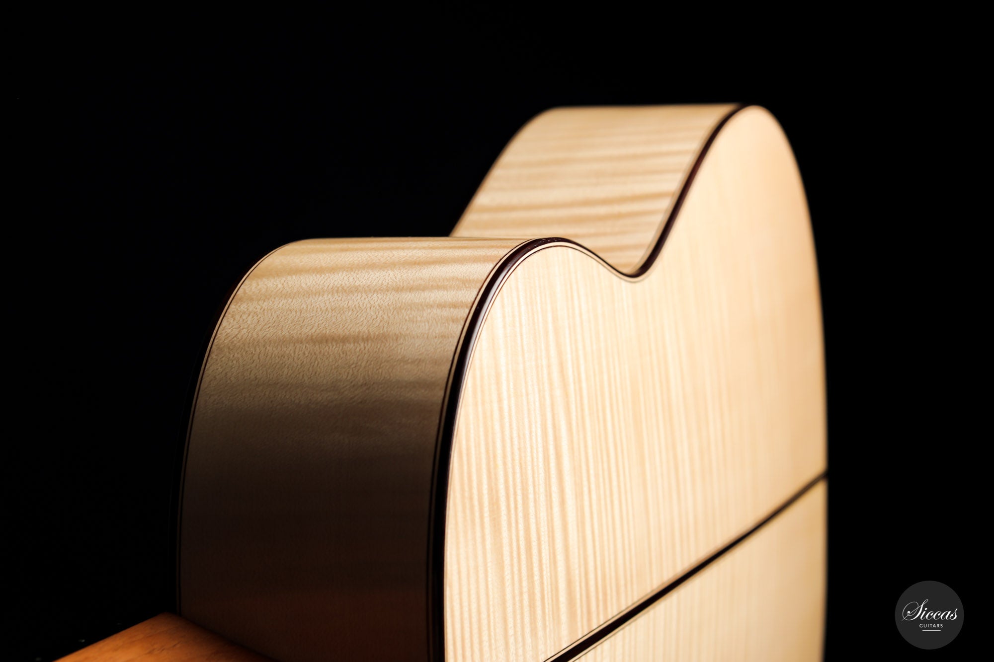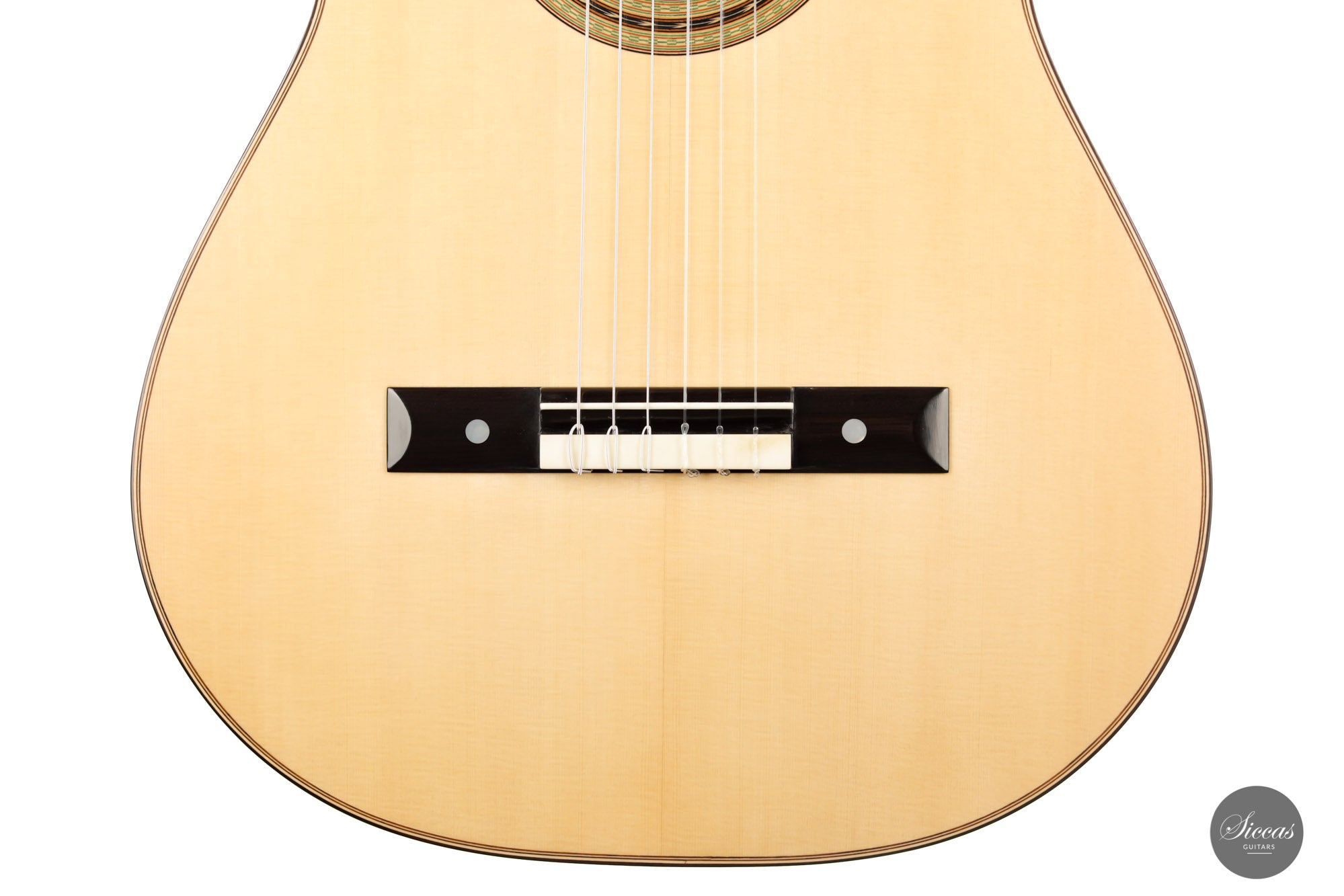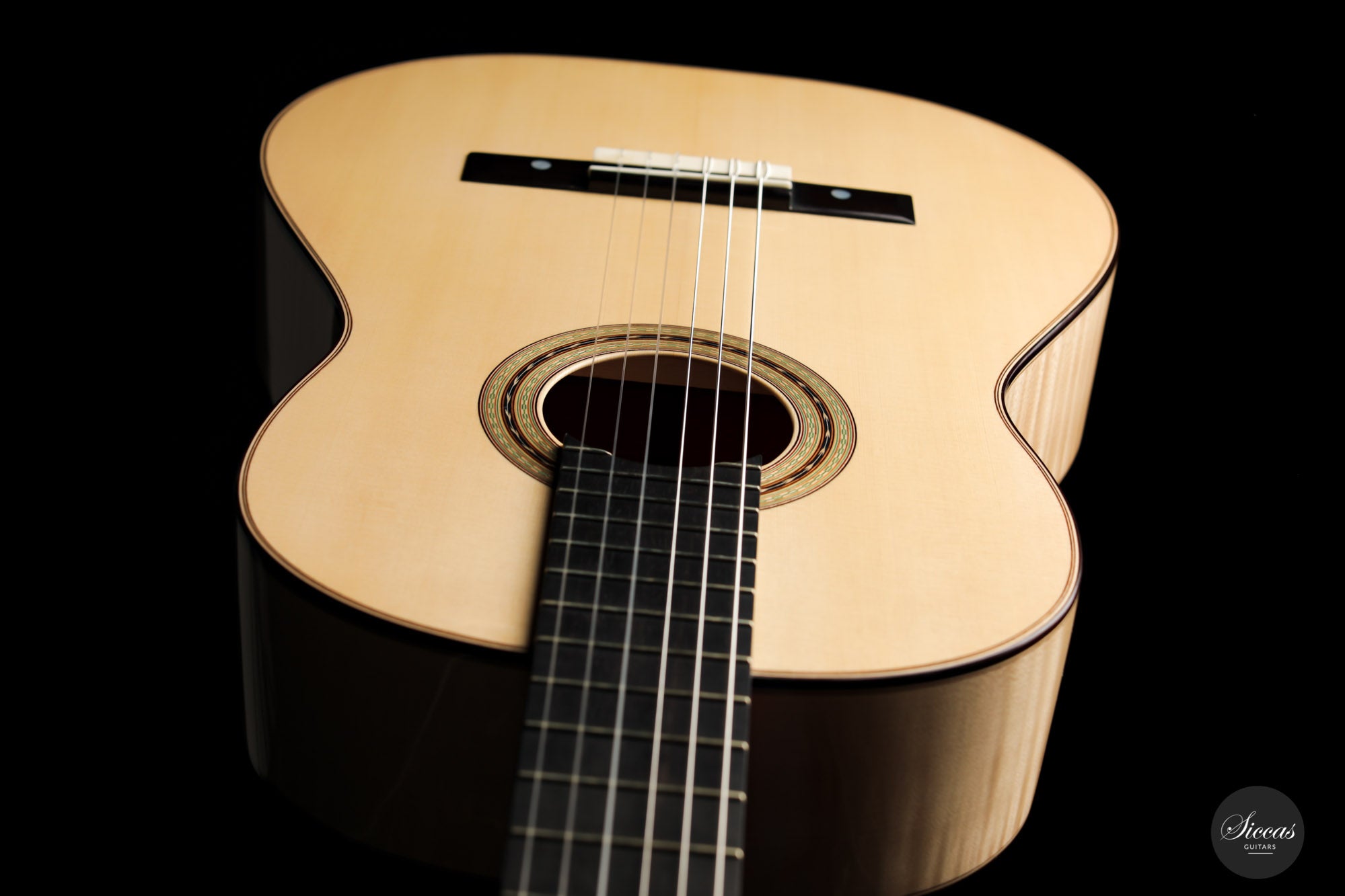 This unique, lightweight guitar is crafted in the style of Antonio de Torres, with a spruce top and maple back and sides. It is fully french polished with a very transparent shellac, so that the natural colours of the wood are revealed very well and the fascinating reflections of the annual rings can be admired. Some beautiful construction details such as the mother-of-pearl dots on the bridge and the green shades of the rosette are also reminiscent of Antonio de Torres' aesthetic universe.