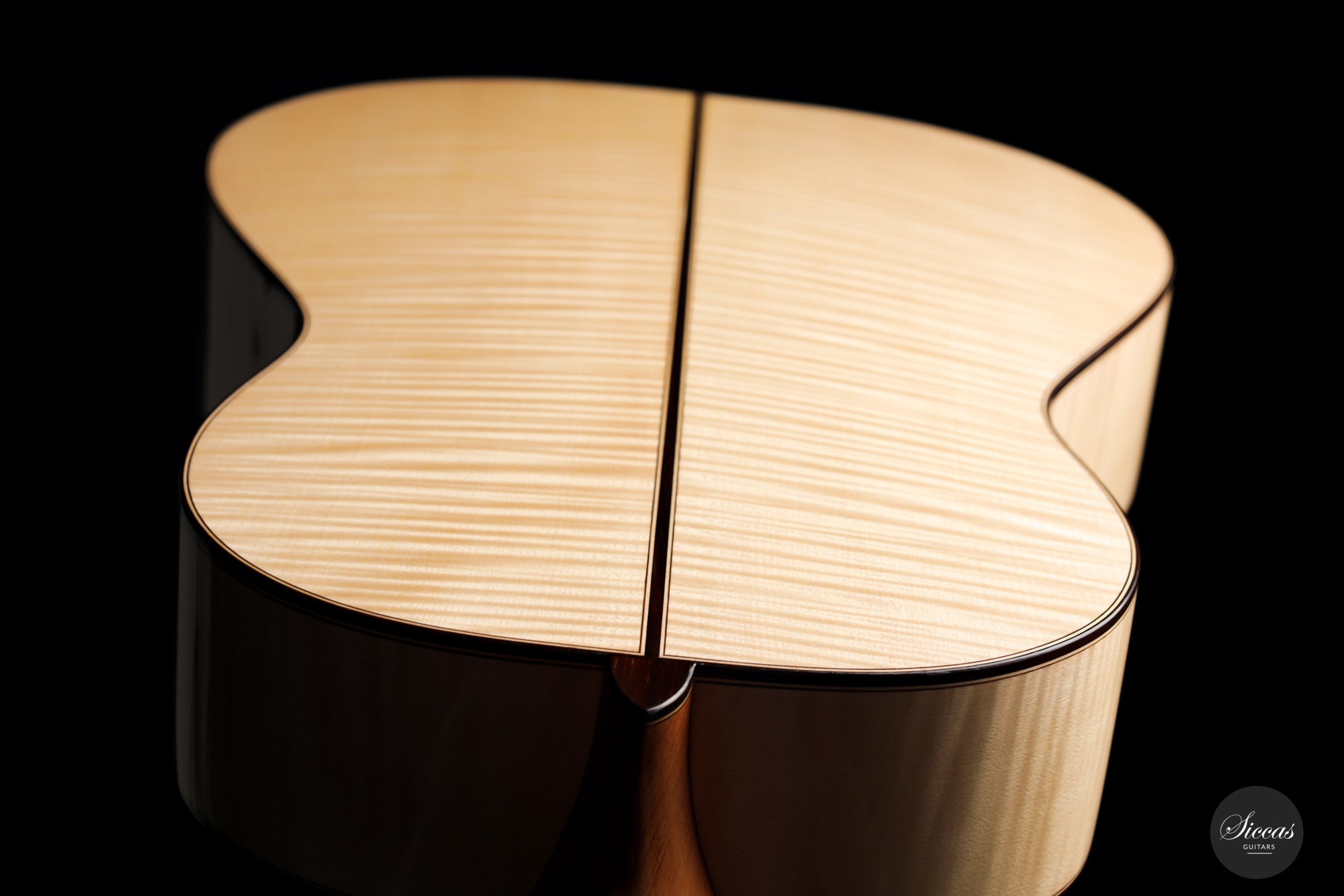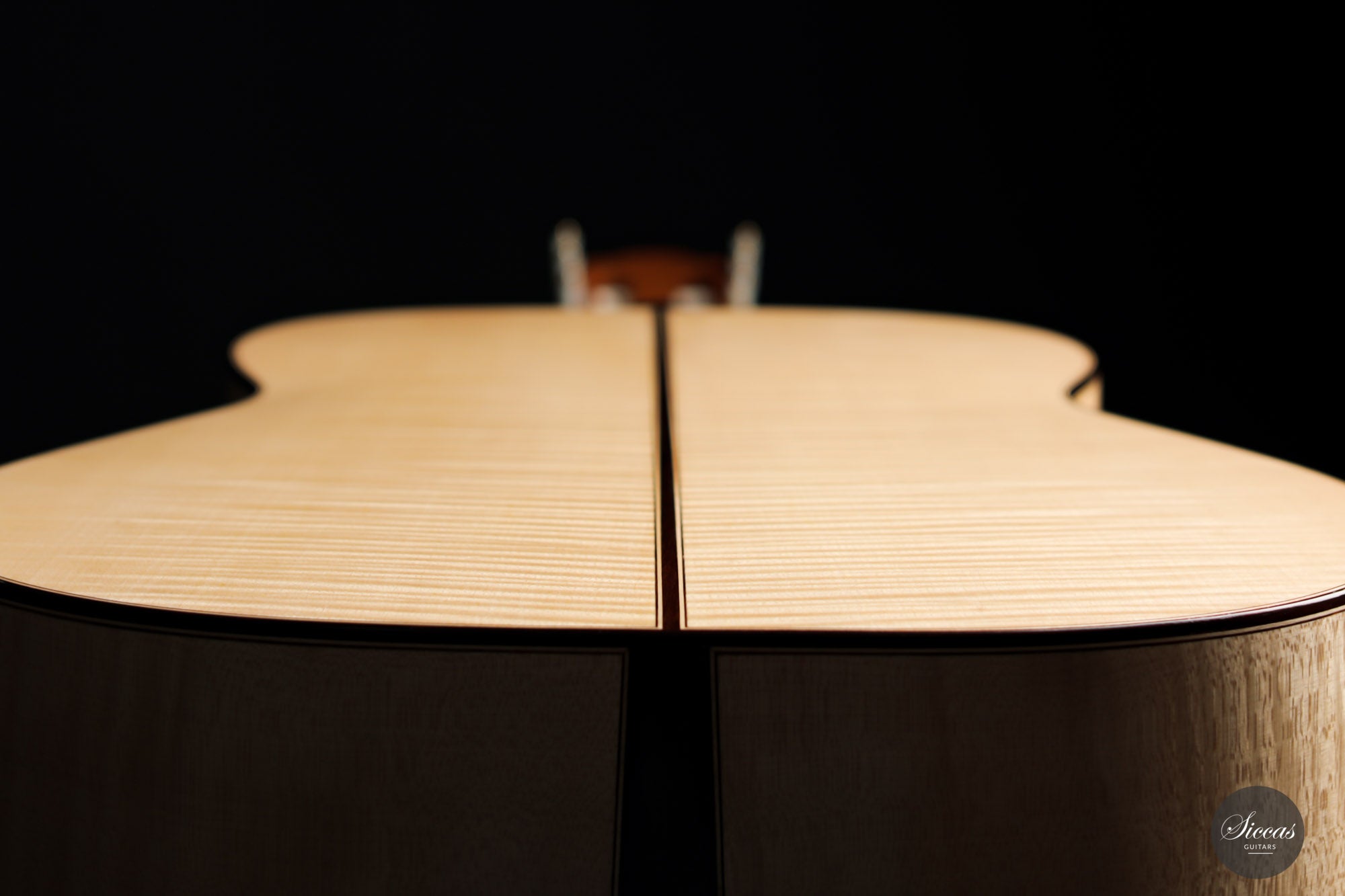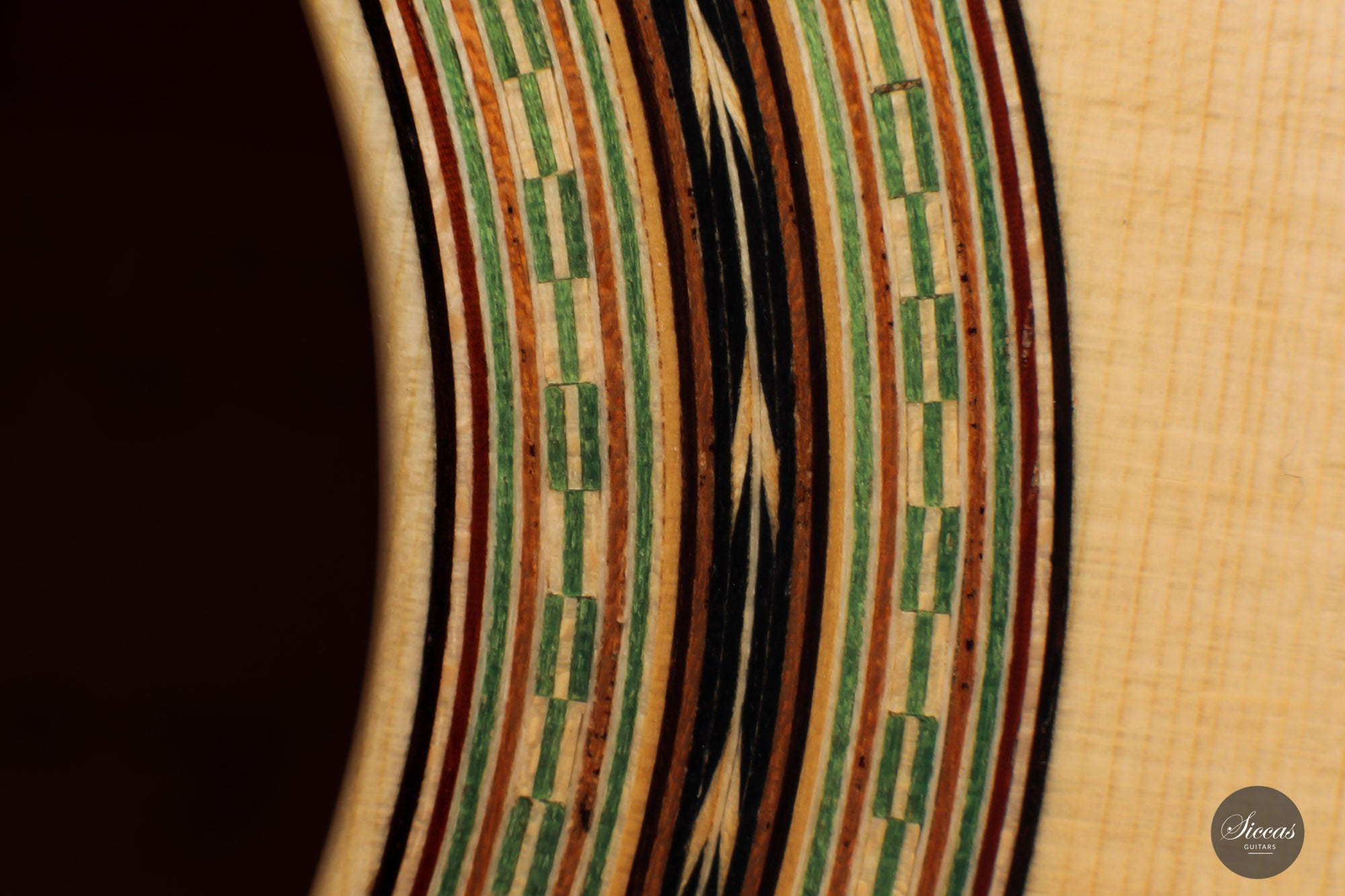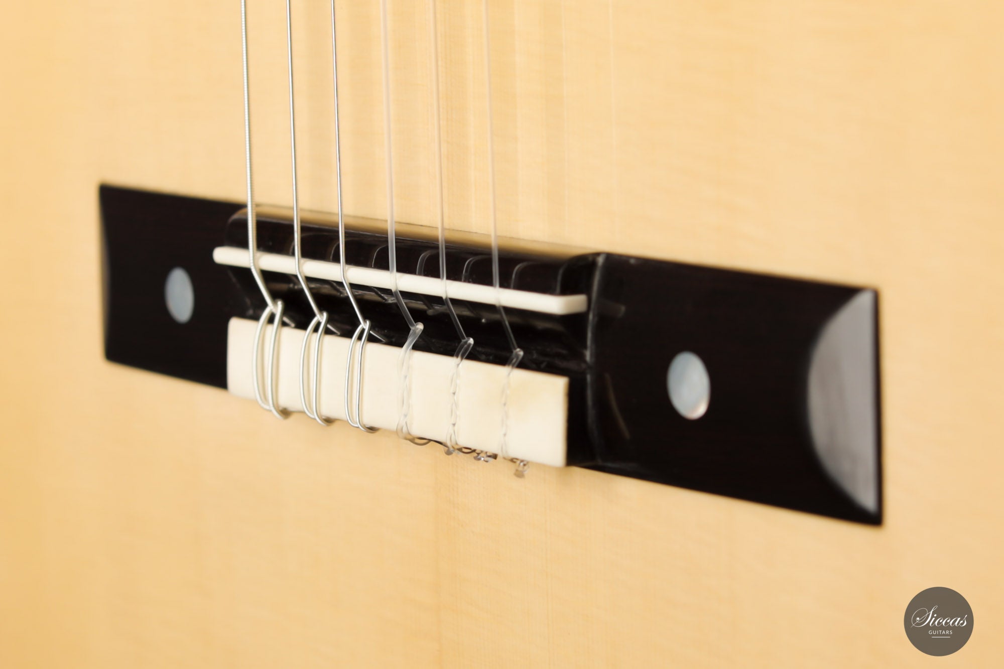 This unique, lightweight guitar is crafted in the style of Antonio de Torres, with a spruce top and maple back and sides. It is fully french polished with a very transparent shellac, so that the natural colours of the wood are revealed very well and the fascinating reflections of the annual rings can be admired. Some beautiful construction details such as the mother-of-pearl dots on the bridge and the green shades of the rosette are also reminiscent of Antonio de Torres' aesthetic universe.