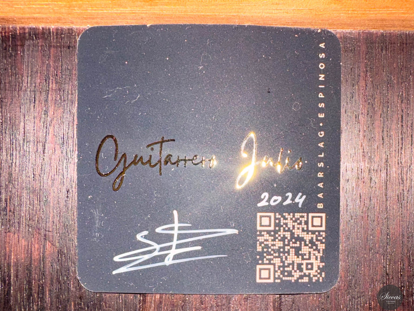 Julio Baarslag Espinosa carries the legacy of two families with long carriers in the guitar-making world. In his own words he has “lived in the workshop since he was born, with the luck his parents would not take the tools away from him as he experimented”. He became a technician in renewable energies at the same time he completed his guitar-apprenticeship and finally decided to dedicate himself fully to the family’s craft. Since then, he has become part of his parent’s workshop, which has been open since 1980. Under the guidance of his parents, he has developed his own models, which combine traditional and modern elements to produce his own signature tone.