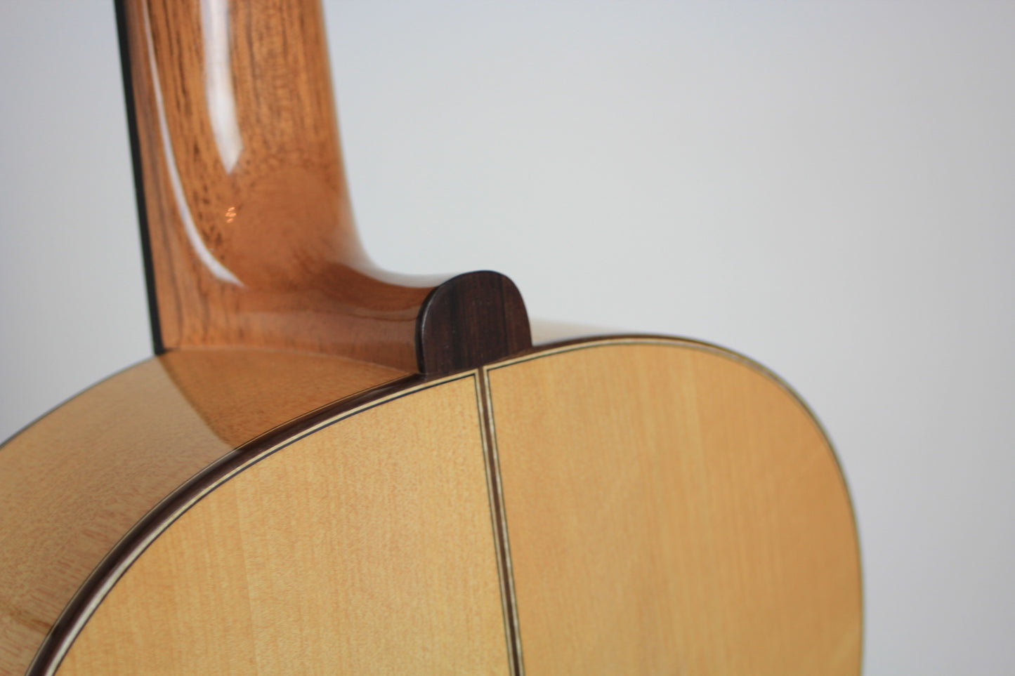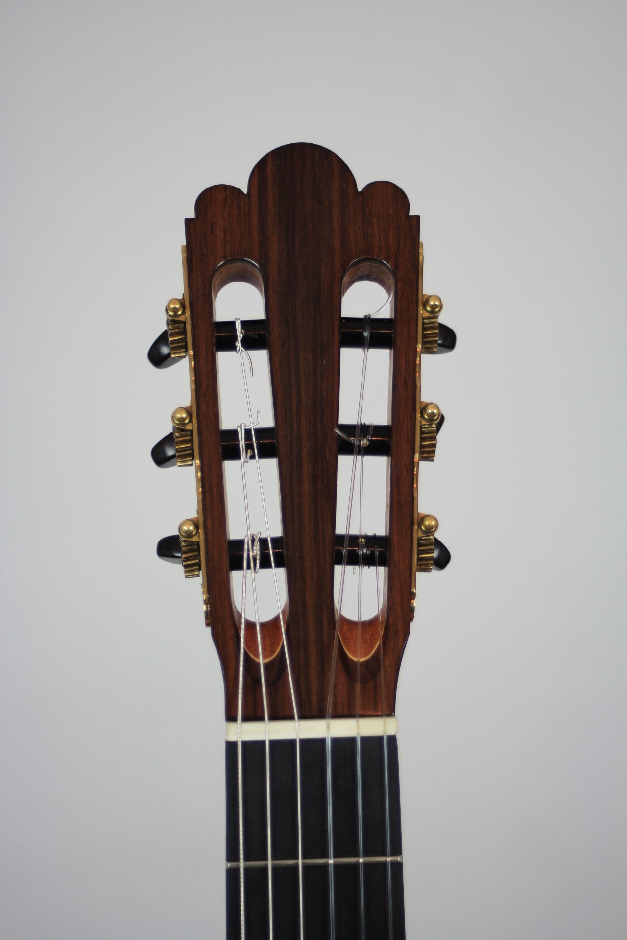 This guitar is a copy (except for the rosette and cypress) of a 1917 guitar by Enrique Garcia. It has eight fan bars, typical for Garcia. Karel respected everything of the original: doming of the soundboard and back and the dimensions. Everyone who played it was impressed by the trebles and balance. The machine heads are by Rodgers.