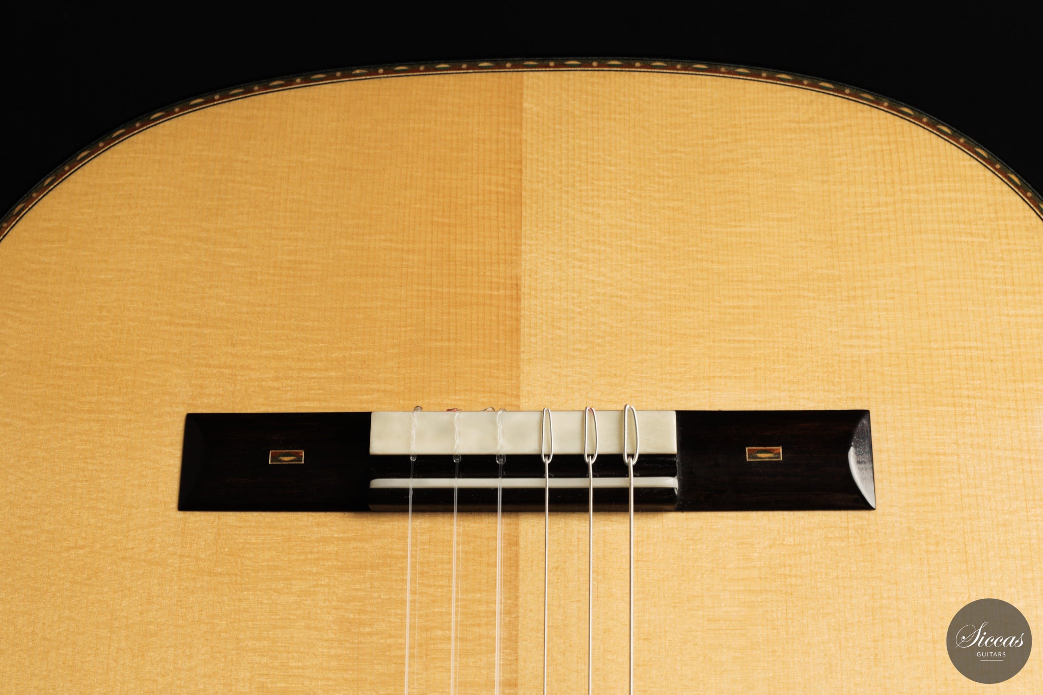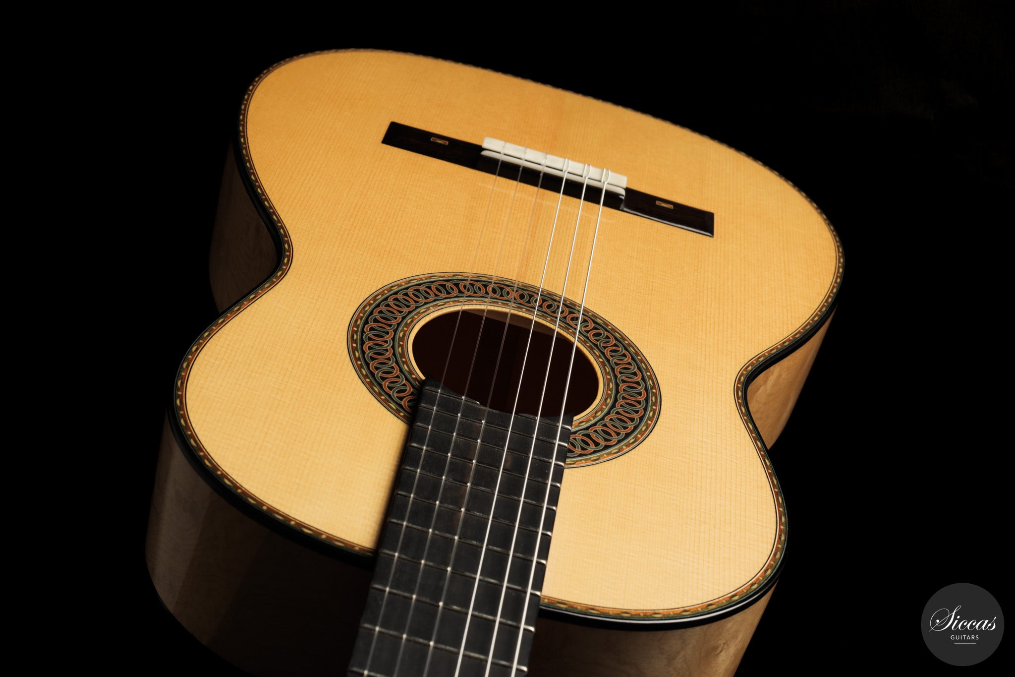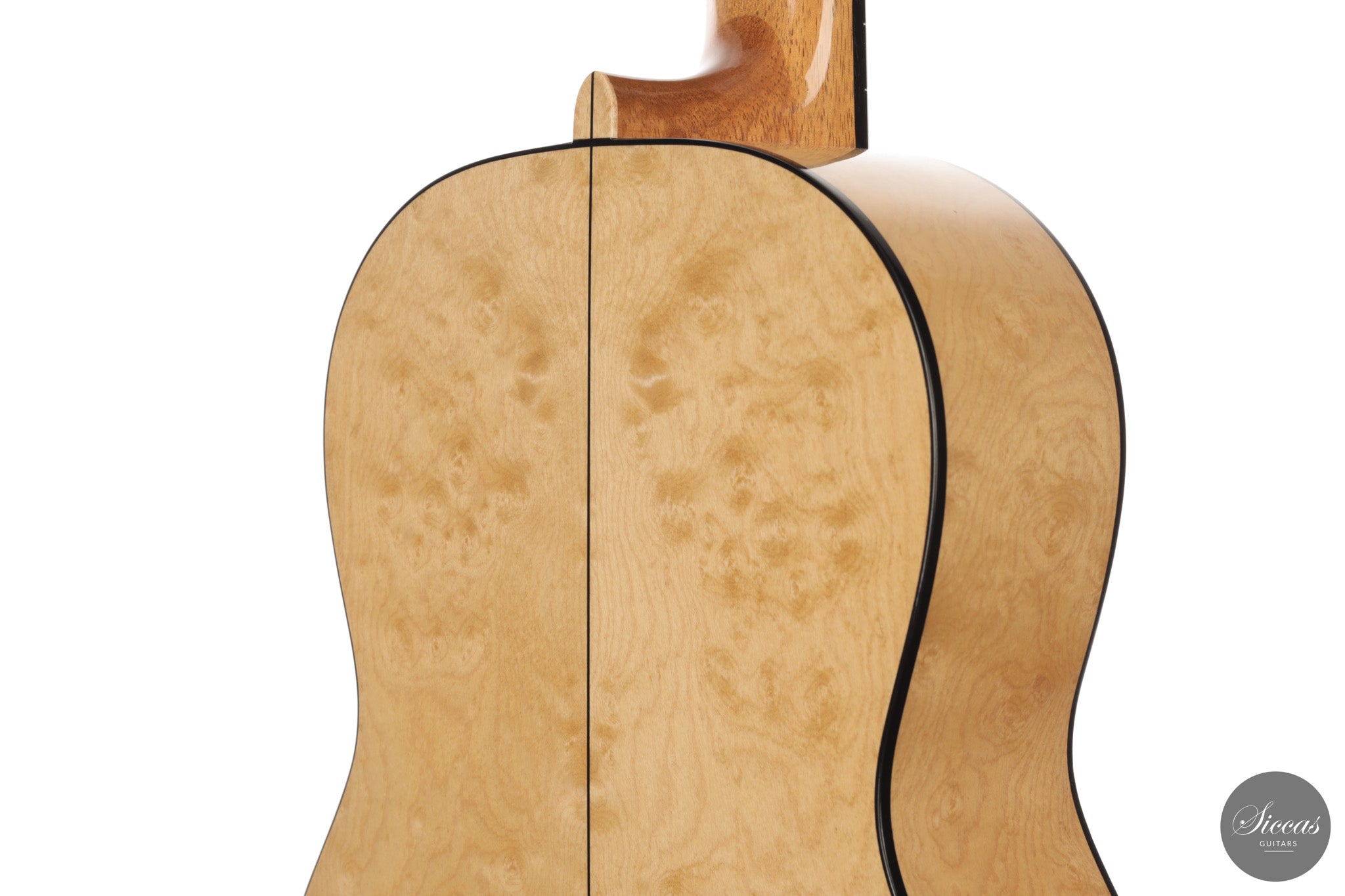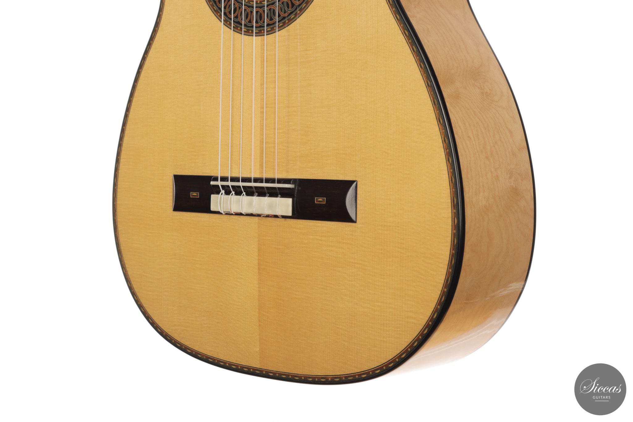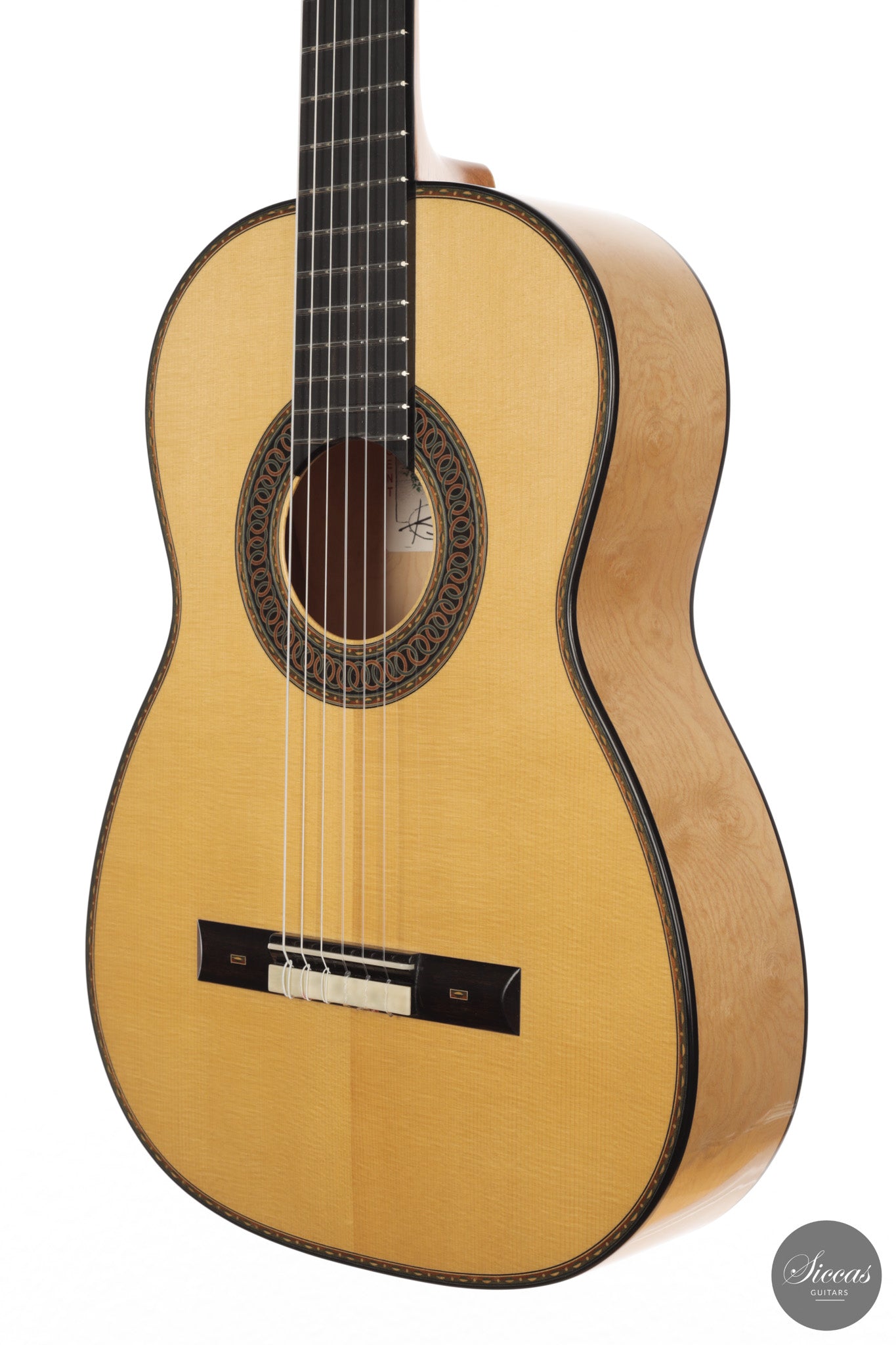 Dieses Arias Modell aus dem Jahr 2026 ist ein traditionell gebautes Instrument mit einer Decke aus Fichte und Boden und Zargen aus geflammtem Ahorn, vollständig mit Schellack poliert. Der Ahorn ist optisch besonders charaktervoll und verbindet die lebendige Zeichnung von Birdseye Maple mit dem besonderen Ausdruck speziell geschnittenen Muschelahorns. Auch visuell hebt sich die Gitarre durch die außerordentliche Feinheit ihrer Ornamentik hervor. Rosette, Einfassungen und kleine dekorative Details sind mit bemerkenswerter Präzision ausgeführt und verleihen dem Instrument eine starke individuelle Präsenz, ohne seine historische Geschlossenheit zu stören.