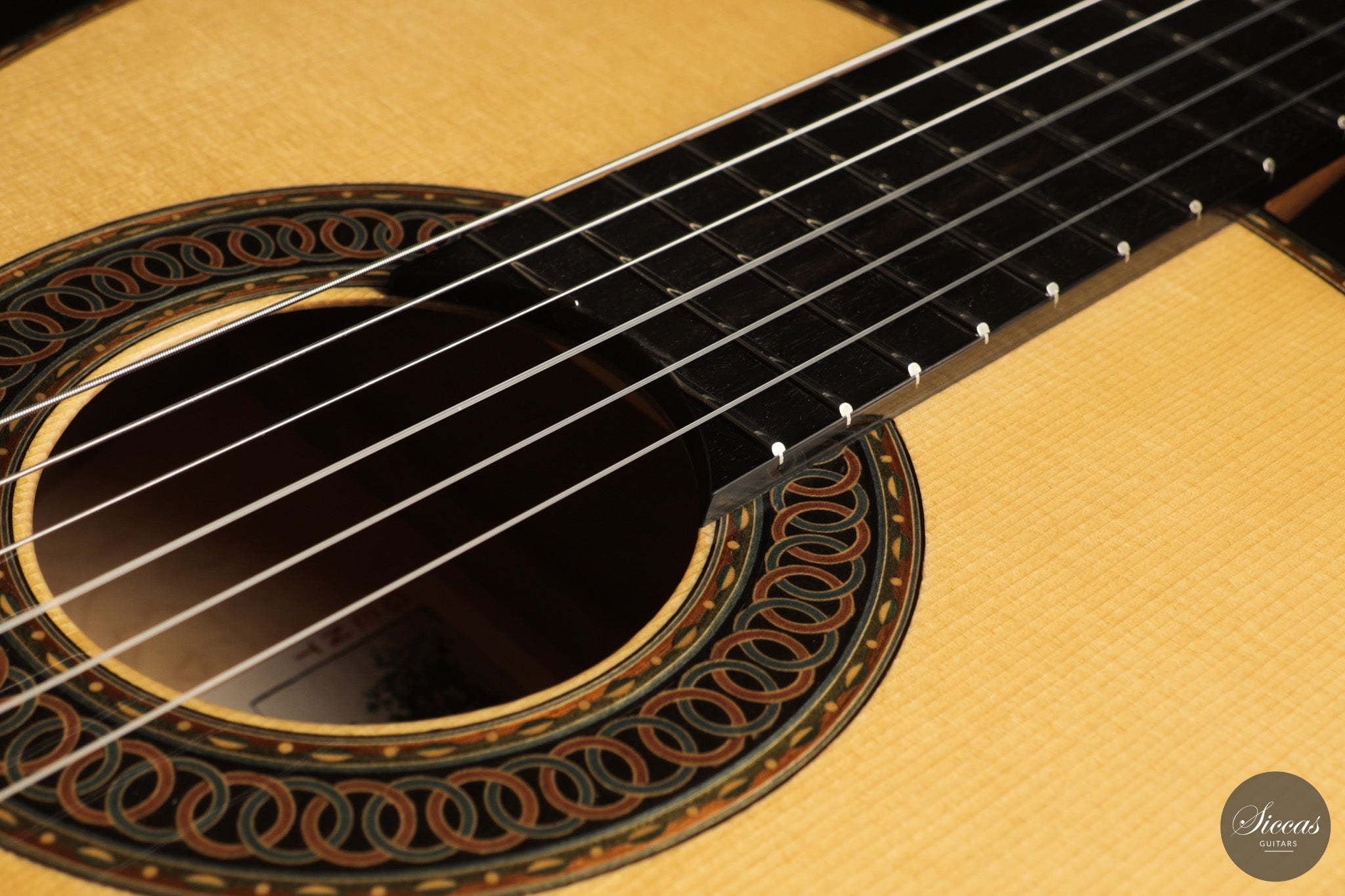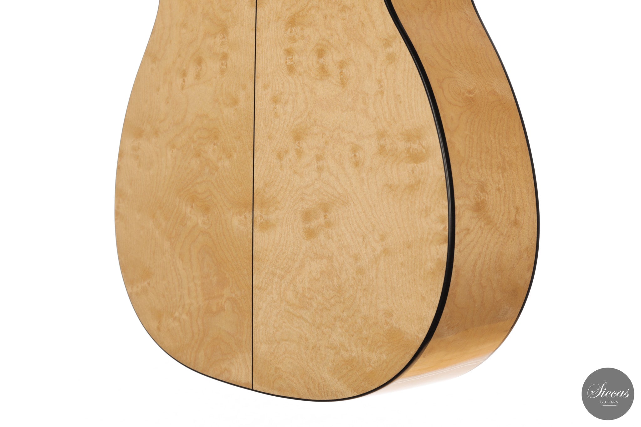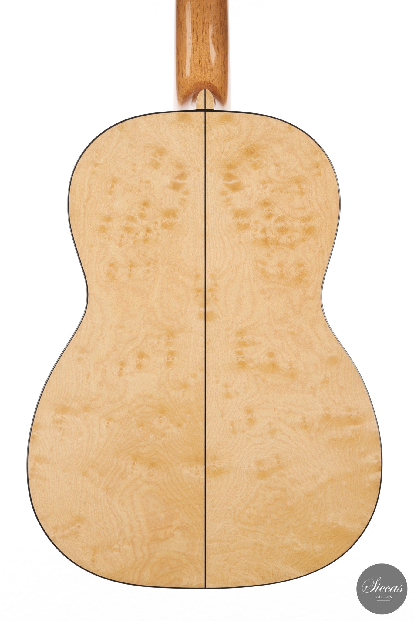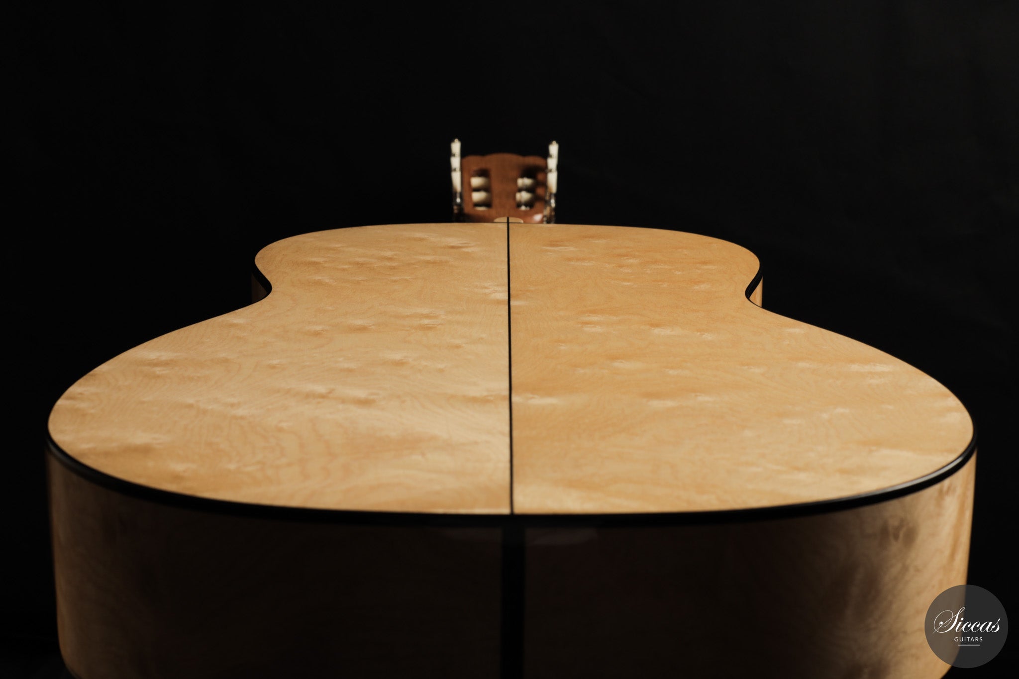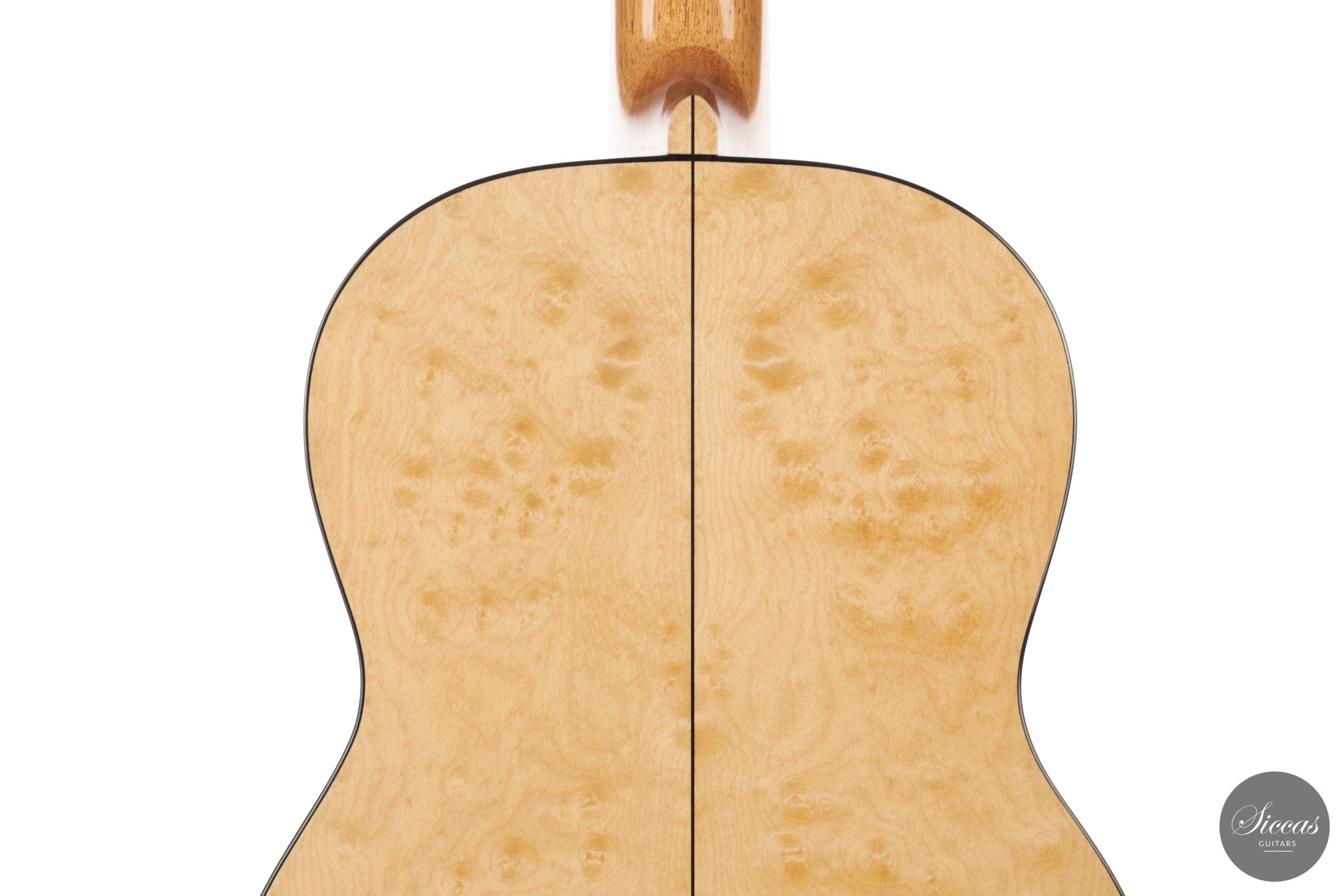 Dieses Arias Modell aus dem Jahr 2026 ist ein traditionell gebautes Instrument mit einer Decke aus Fichte und Boden und Zargen aus geflammtem Ahorn, vollständig mit Schellack poliert. Der Ahorn ist optisch besonders charaktervoll und verbindet die lebendige Zeichnung von Birdseye Maple mit dem besonderen Ausdruck speziell geschnittenen Muschelahorns. Auch visuell hebt sich die Gitarre durch die außerordentliche Feinheit ihrer Ornamentik hervor. Rosette, Einfassungen und kleine dekorative Details sind mit bemerkenswerter Präzision ausgeführt und verleihen dem Instrument eine starke individuelle Präsenz, ohne seine historische Geschlossenheit zu stören.