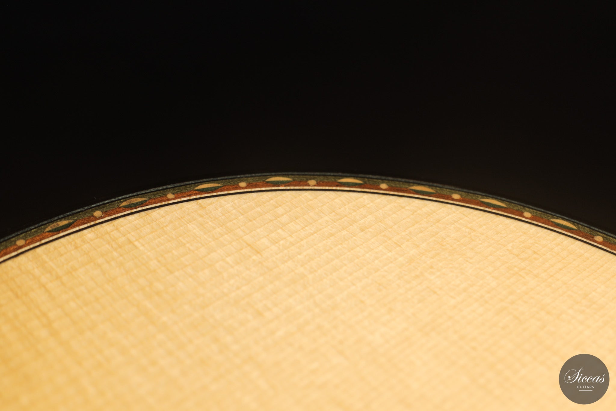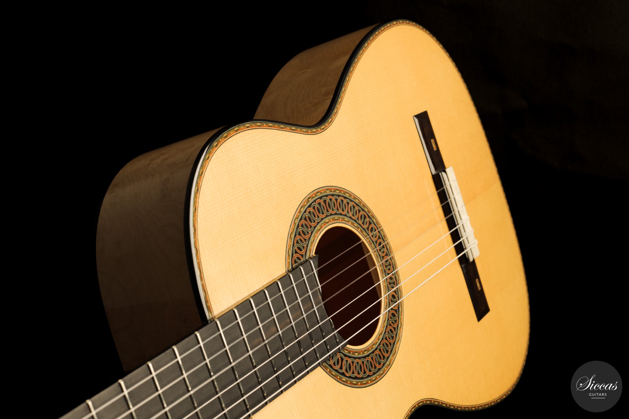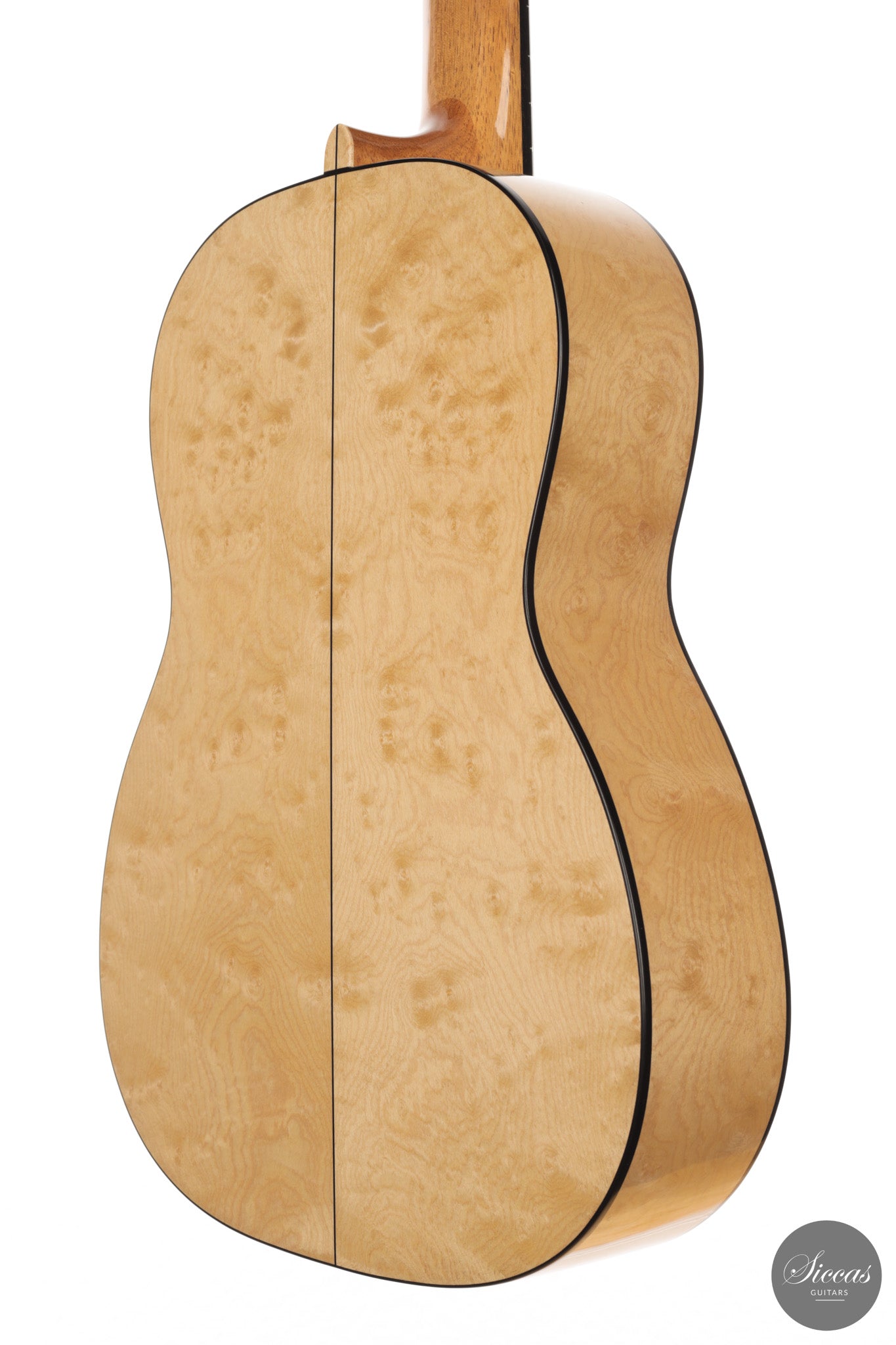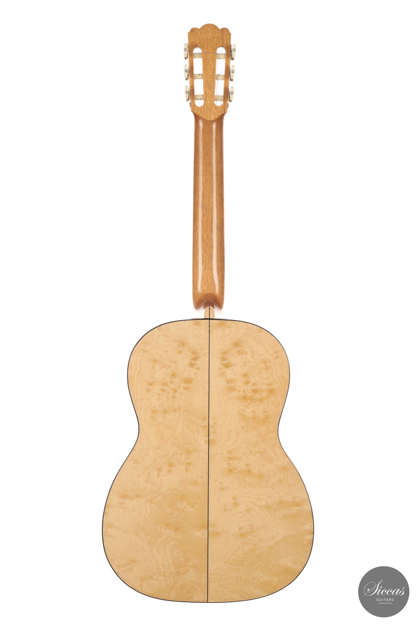 Dieses Arias Modell aus dem Jahr 2026 ist ein traditionell gebautes Instrument mit einer Decke aus Fichte und Boden und Zargen aus geflammtem Ahorn, vollständig mit Schellack poliert. Der Ahorn ist optisch besonders charaktervoll und verbindet die lebendige Zeichnung von Birdseye Maple mit dem besonderen Ausdruck speziell geschnittenen Muschelahorns. Auch visuell hebt sich die Gitarre durch die außerordentliche Feinheit ihrer Ornamentik hervor. Rosette, Einfassungen und kleine dekorative Details sind mit bemerkenswerter Präzision ausgeführt und verleihen dem Instrument eine starke individuelle Präsenz, ohne seine historische Geschlossenheit zu stören.