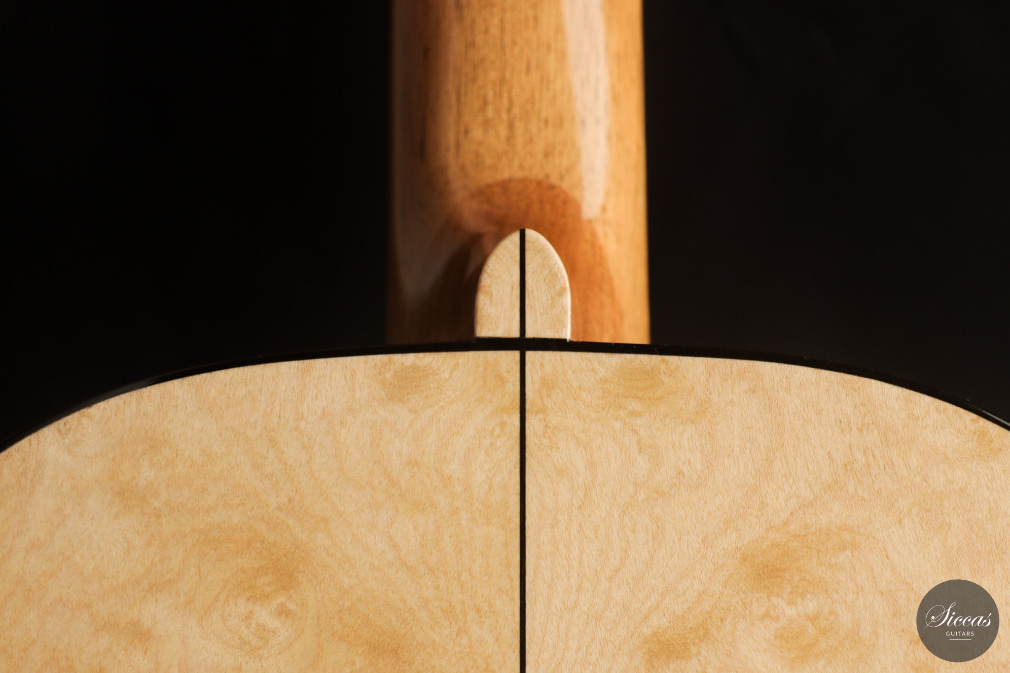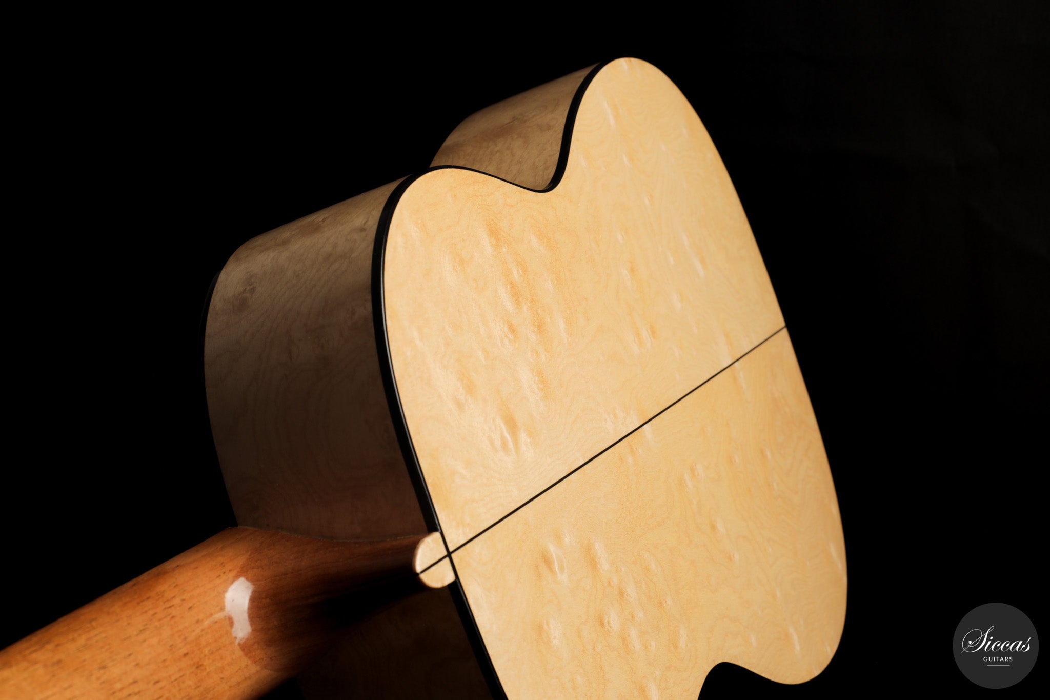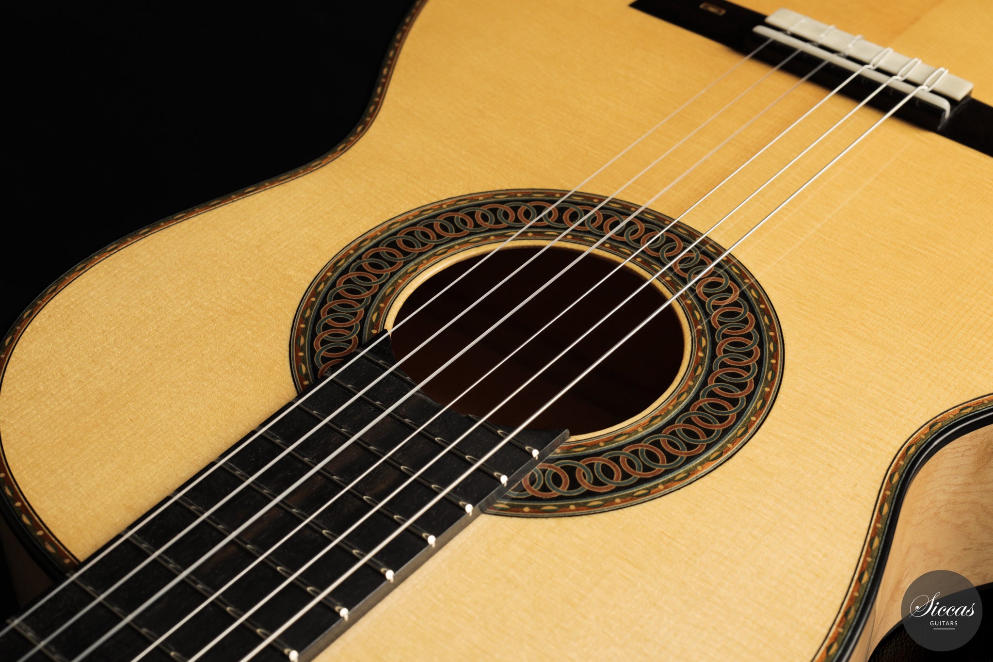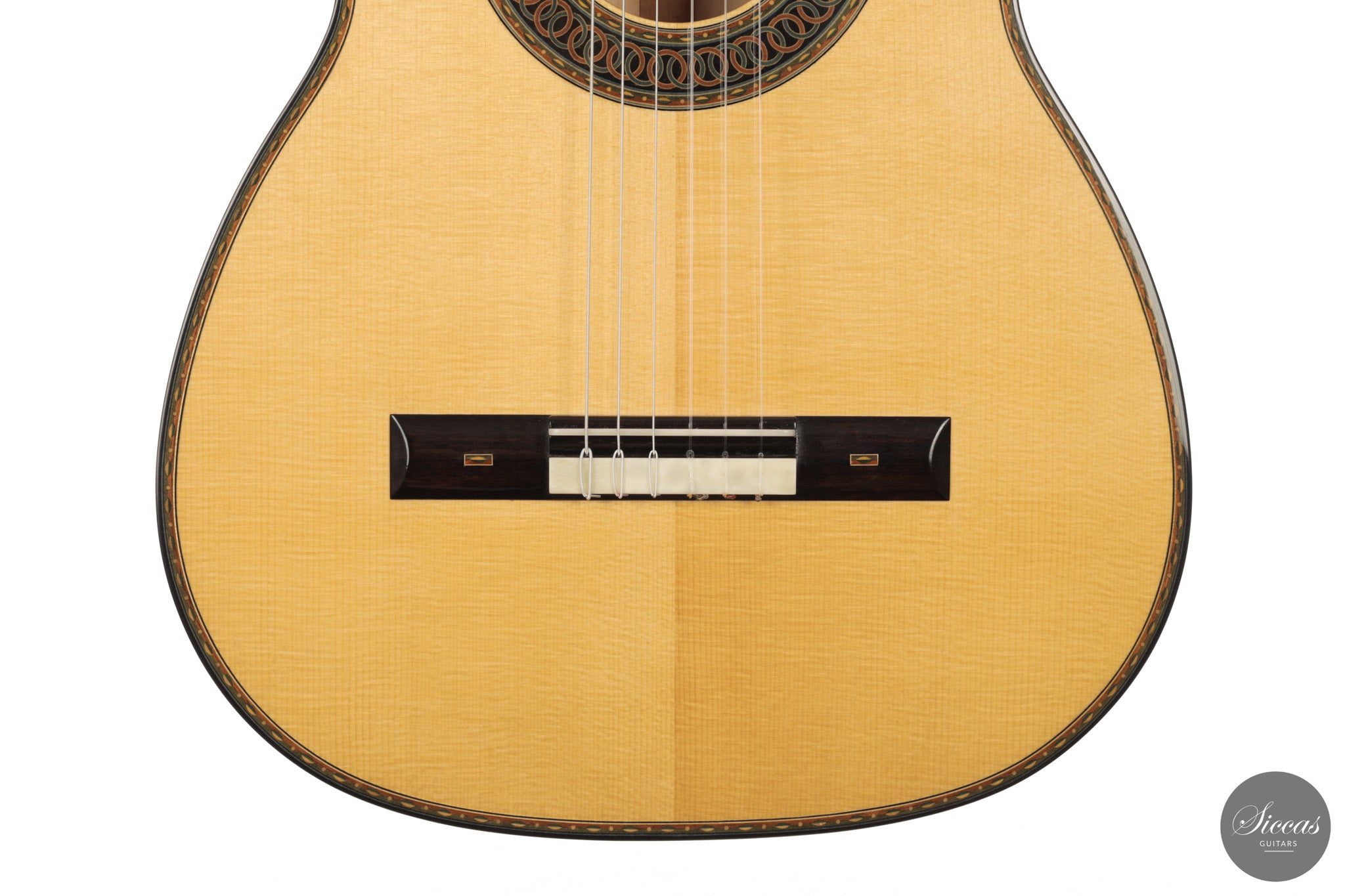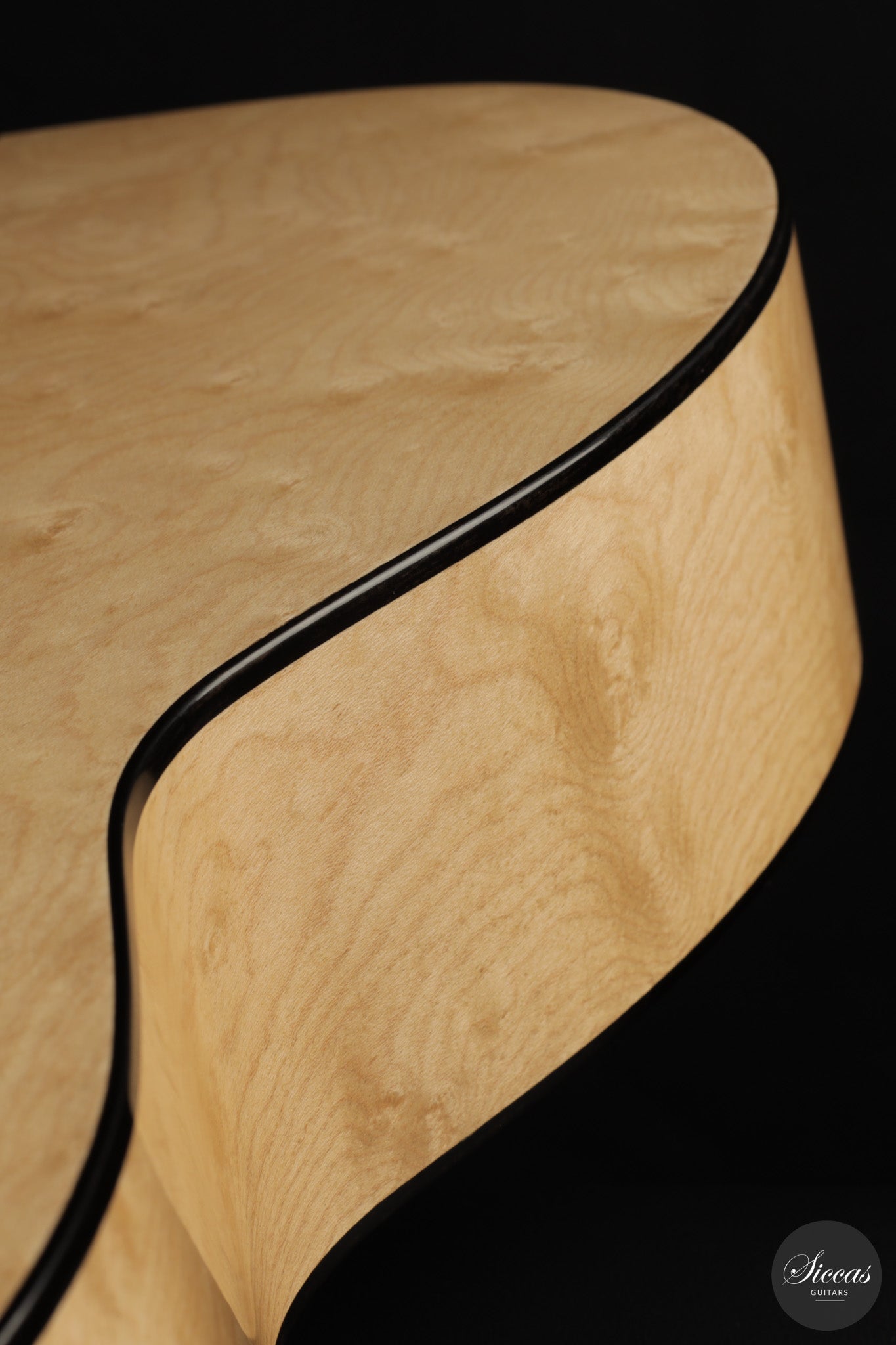 Dieses Arias Modell aus dem Jahr 2026 ist ein traditionell gebautes Instrument mit einer Decke aus Fichte und Boden und Zargen aus geflammtem Ahorn, vollständig mit Schellack poliert. Der Ahorn ist optisch besonders charaktervoll und verbindet die lebendige Zeichnung von Birdseye Maple mit dem besonderen Ausdruck speziell geschnittenen Muschelahorns. Auch visuell hebt sich die Gitarre durch die außerordentliche Feinheit ihrer Ornamentik hervor. Rosette, Einfassungen und kleine dekorative Details sind mit bemerkenswerter Präzision ausgeführt und verleihen dem Instrument eine starke individuelle Präsenz, ohne seine historische Geschlossenheit zu stören.