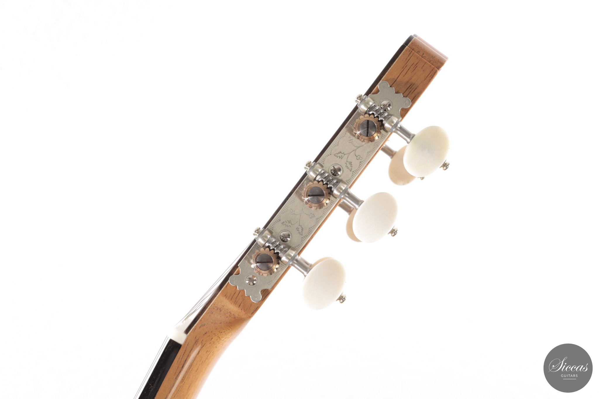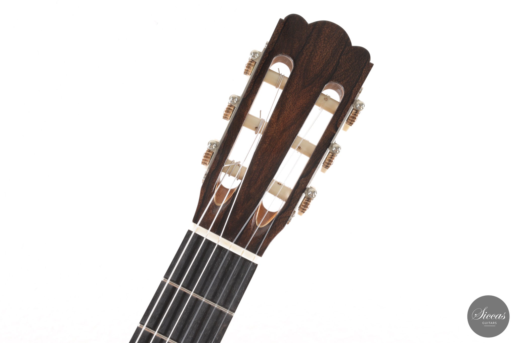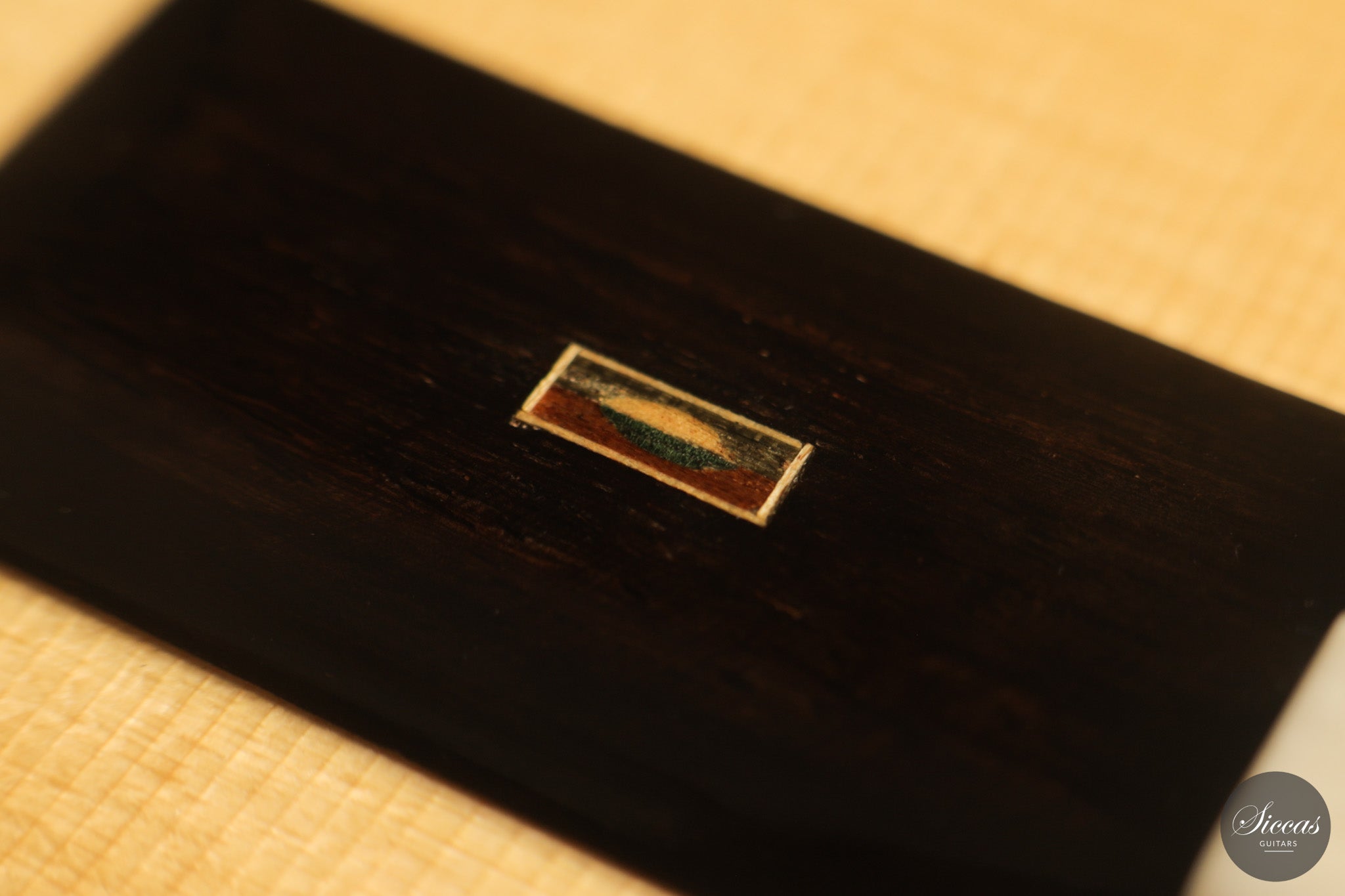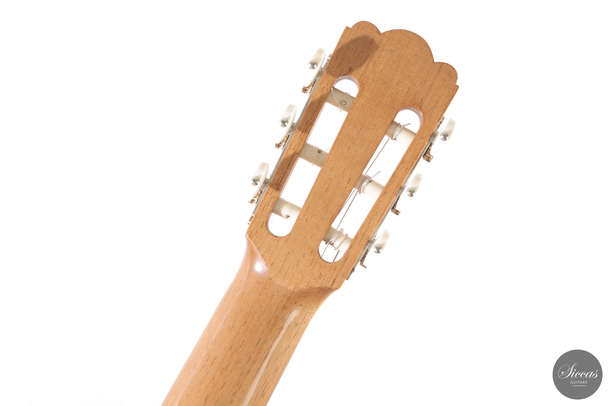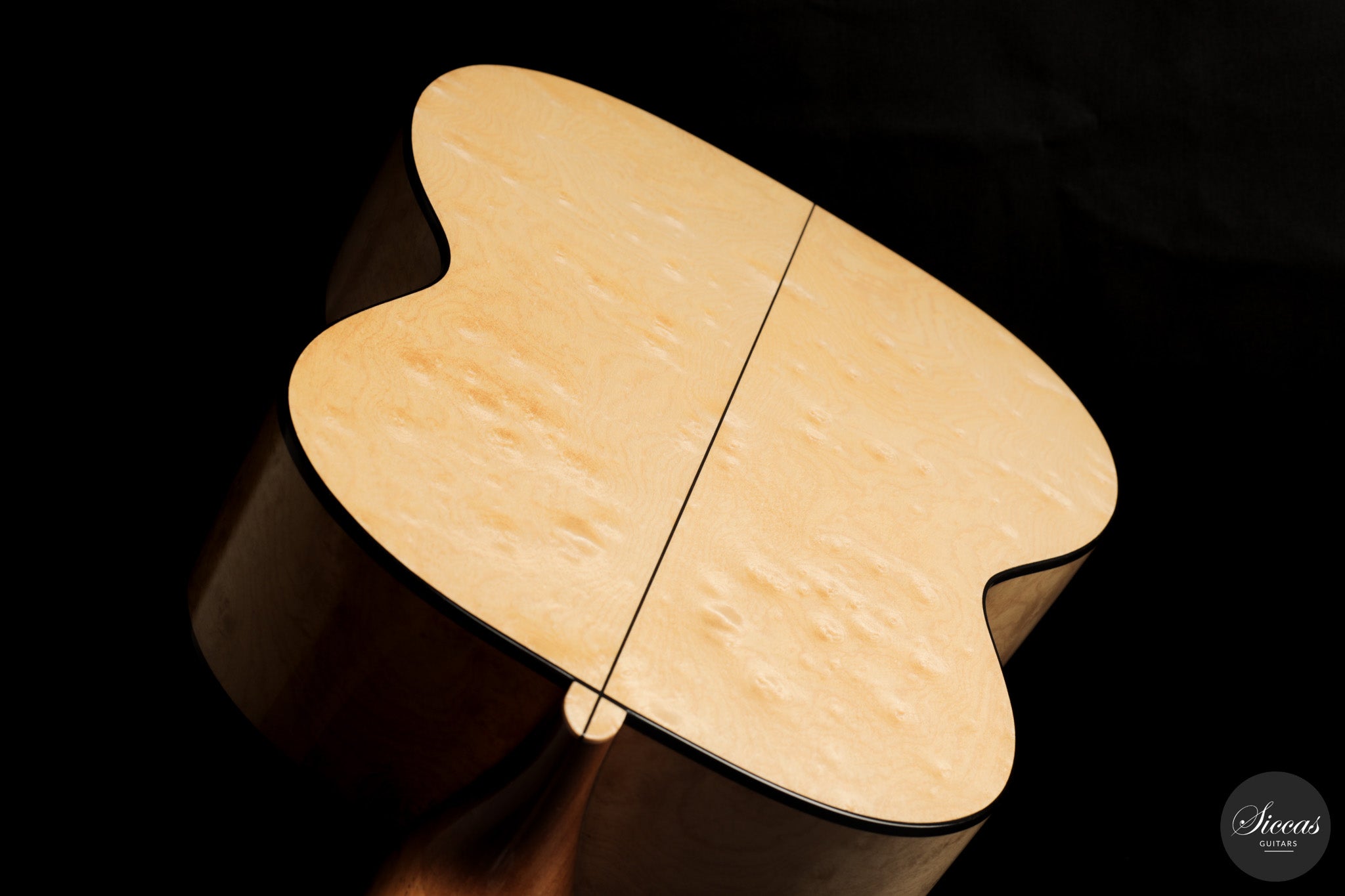 Dieses Arias Modell aus dem Jahr 2026 ist ein traditionell gebautes Instrument mit einer Decke aus Fichte und Boden und Zargen aus geflammtem Ahorn, vollständig mit Schellack poliert. Der Ahorn ist optisch besonders charaktervoll und verbindet die lebendige Zeichnung von Birdseye Maple mit dem besonderen Ausdruck speziell geschnittenen Muschelahorns. Auch visuell hebt sich die Gitarre durch die außerordentliche Feinheit ihrer Ornamentik hervor. Rosette, Einfassungen und kleine dekorative Details sind mit bemerkenswerter Präzision ausgeführt und verleihen dem Instrument eine starke individuelle Präsenz, ohne seine historische Geschlossenheit zu stören.