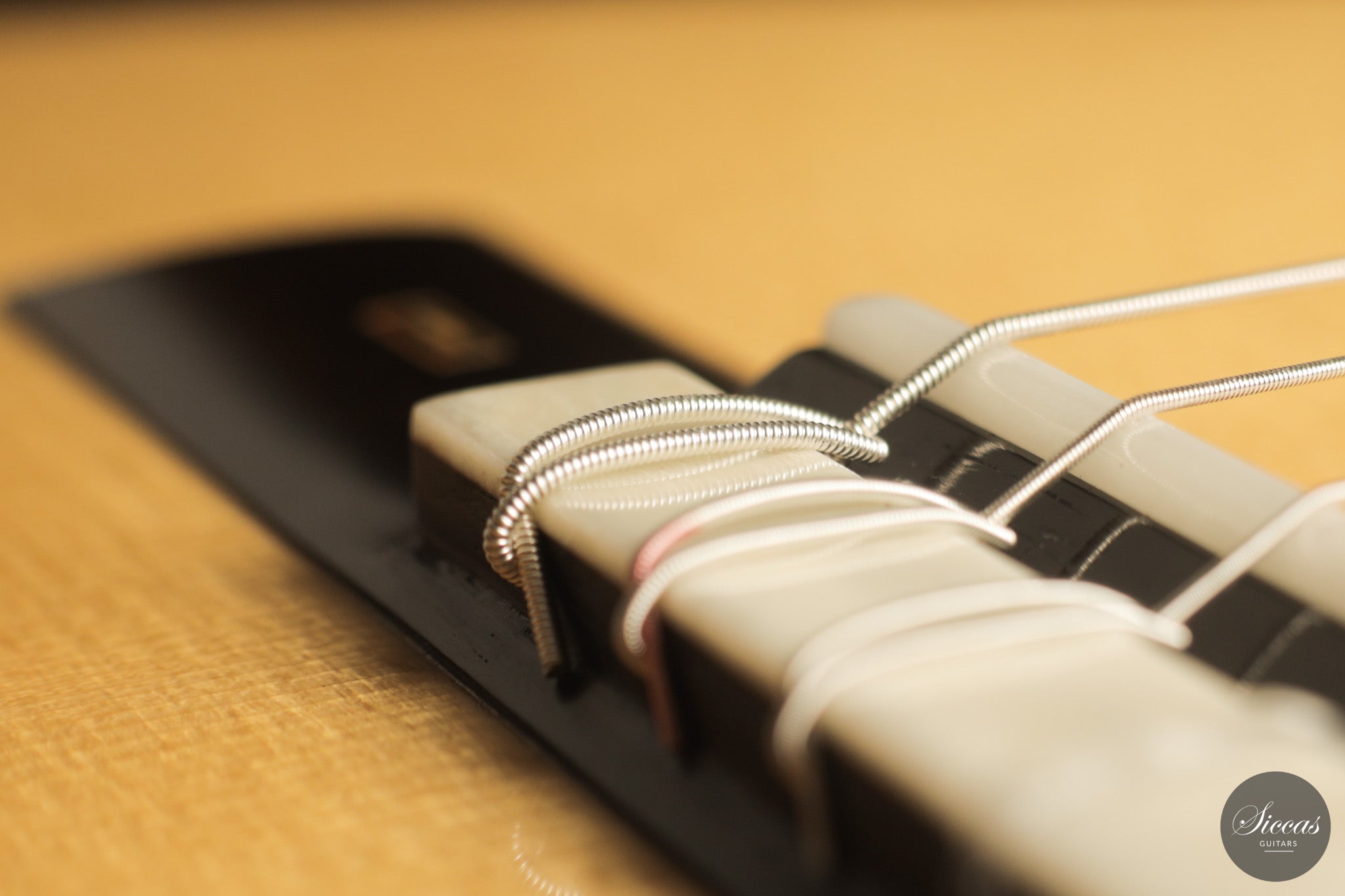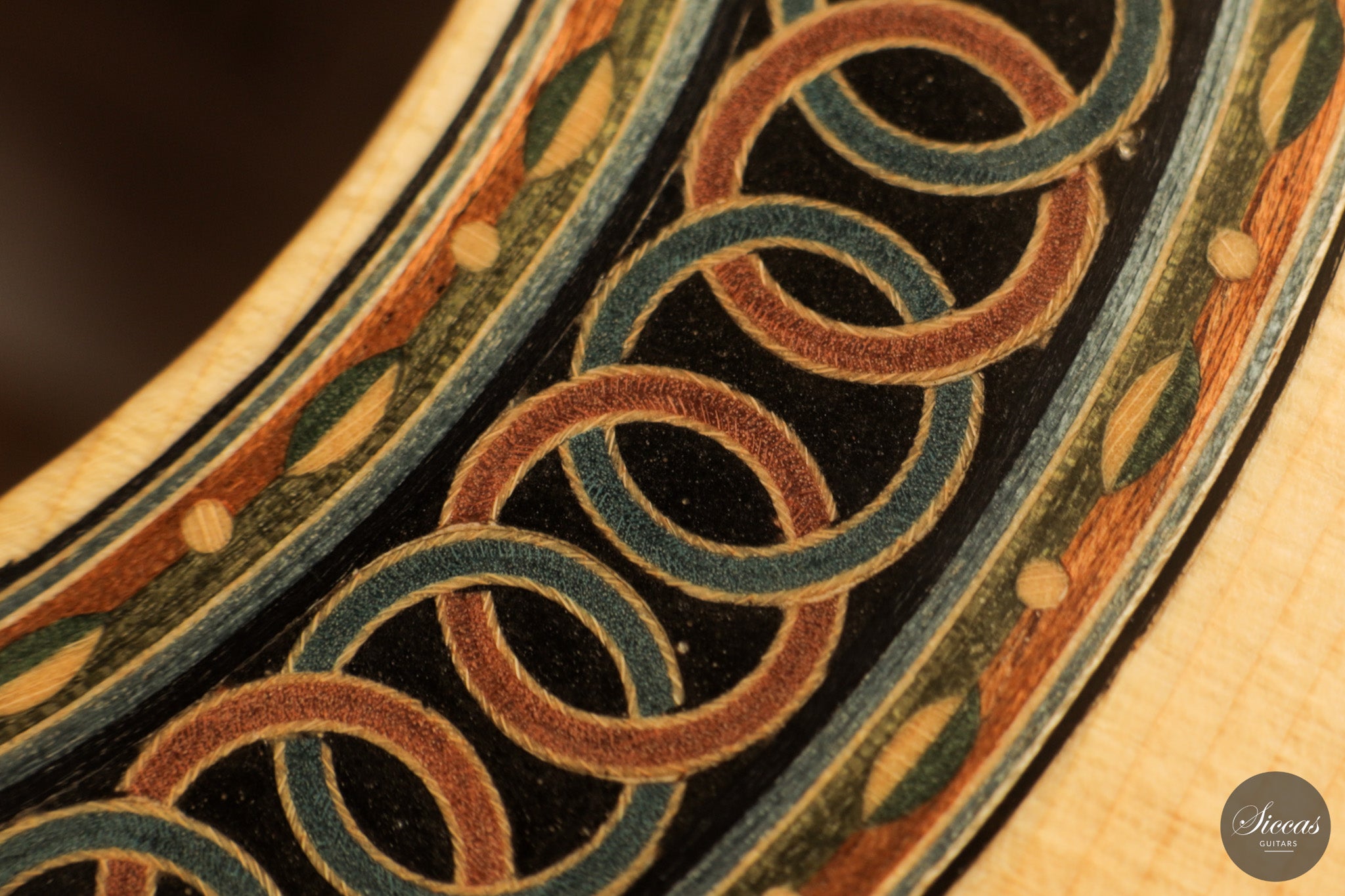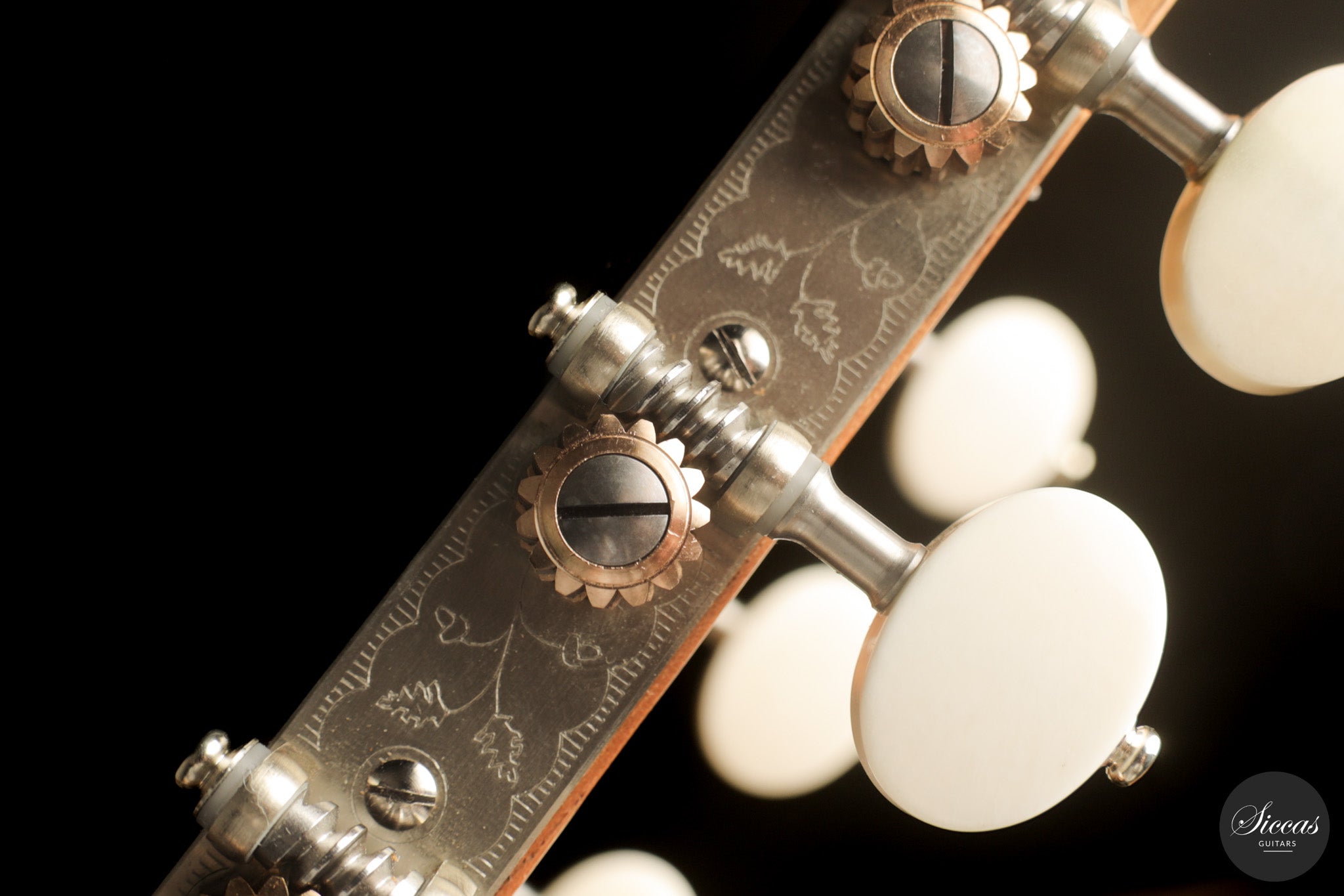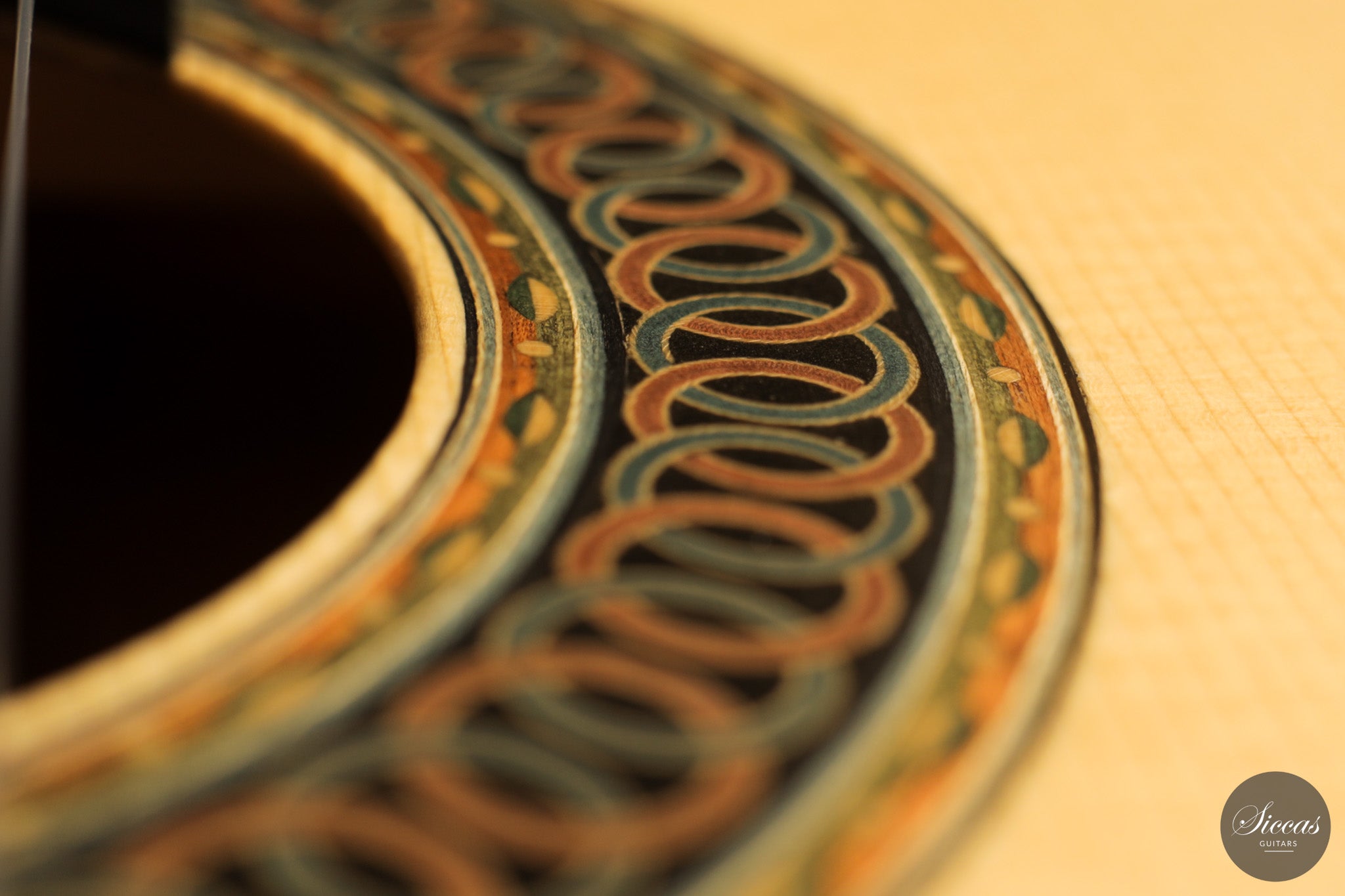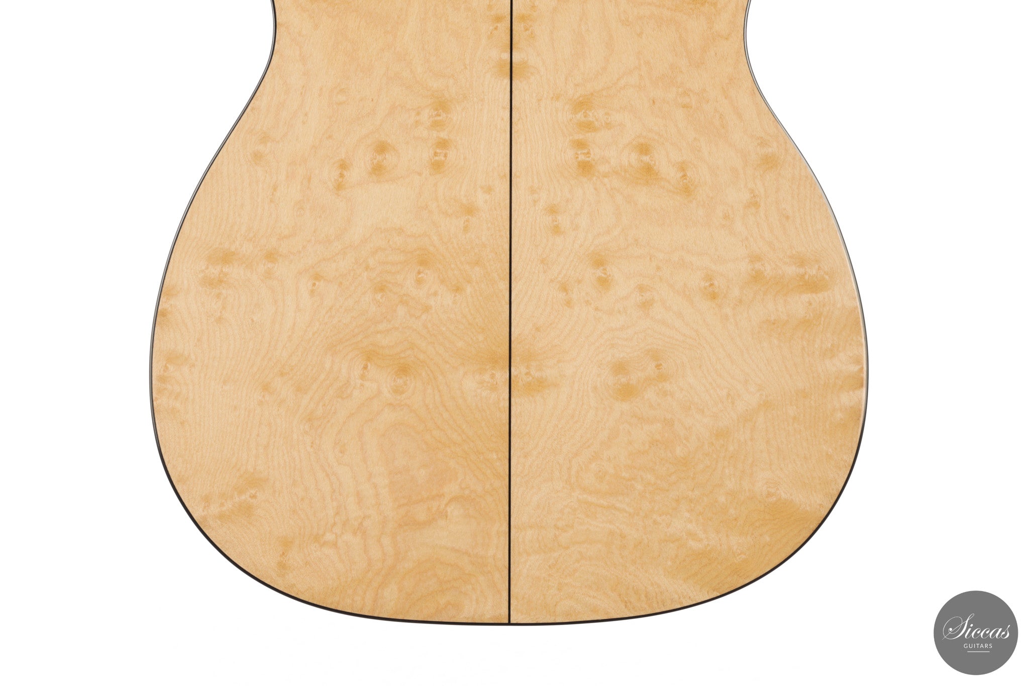 Dieses Arias Modell aus dem Jahr 2026 ist ein traditionell gebautes Instrument mit einer Decke aus Fichte und Boden und Zargen aus geflammtem Ahorn, vollständig mit Schellack poliert. Der Ahorn ist optisch besonders charaktervoll und verbindet die lebendige Zeichnung von Birdseye Maple mit dem besonderen Ausdruck speziell geschnittenen Muschelahorns. Auch visuell hebt sich die Gitarre durch die außerordentliche Feinheit ihrer Ornamentik hervor. Rosette, Einfassungen und kleine dekorative Details sind mit bemerkenswerter Präzision ausgeführt und verleihen dem Instrument eine starke individuelle Präsenz, ohne seine historische Geschlossenheit zu stören.
