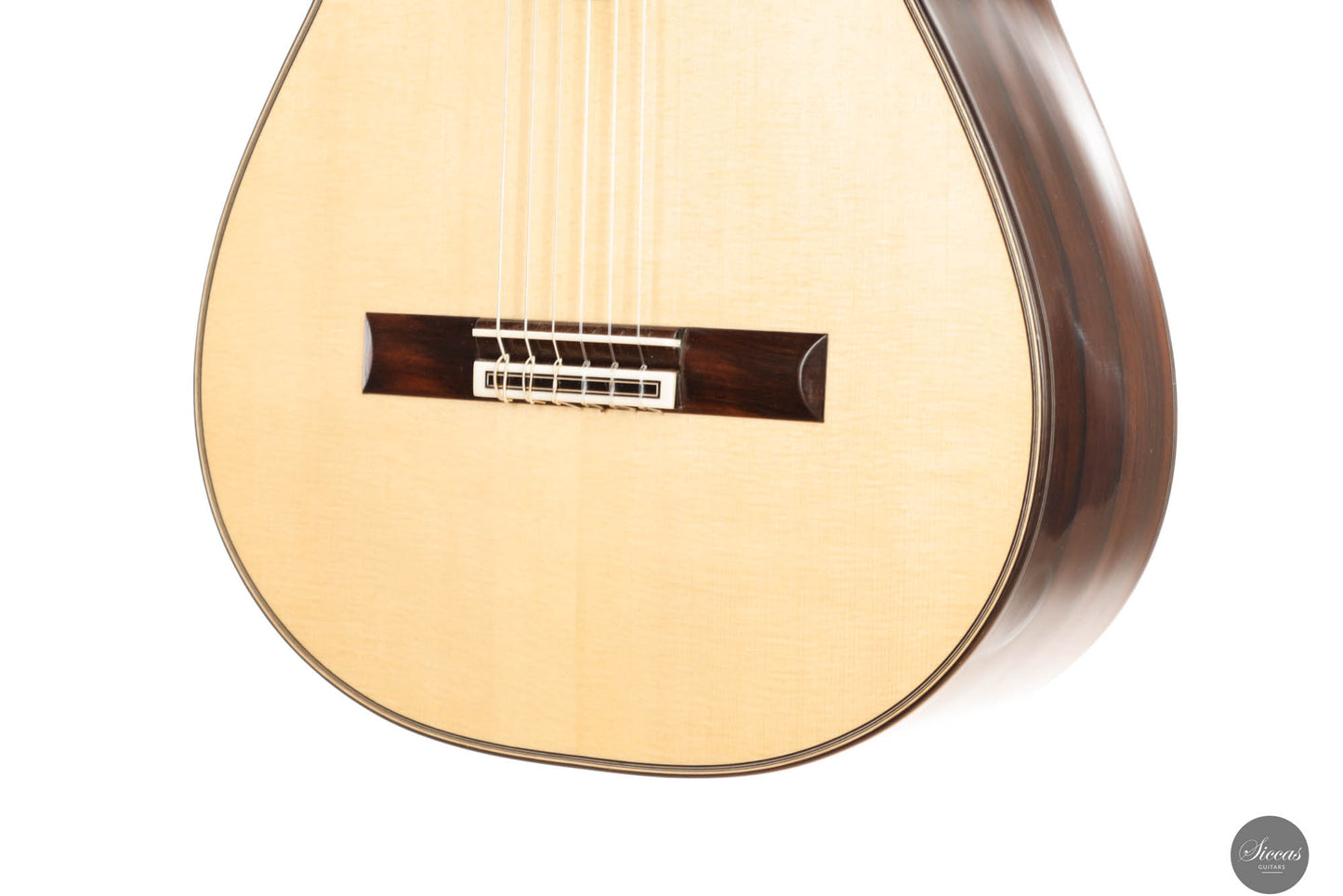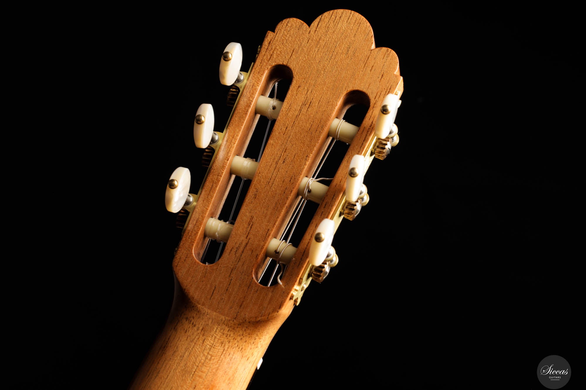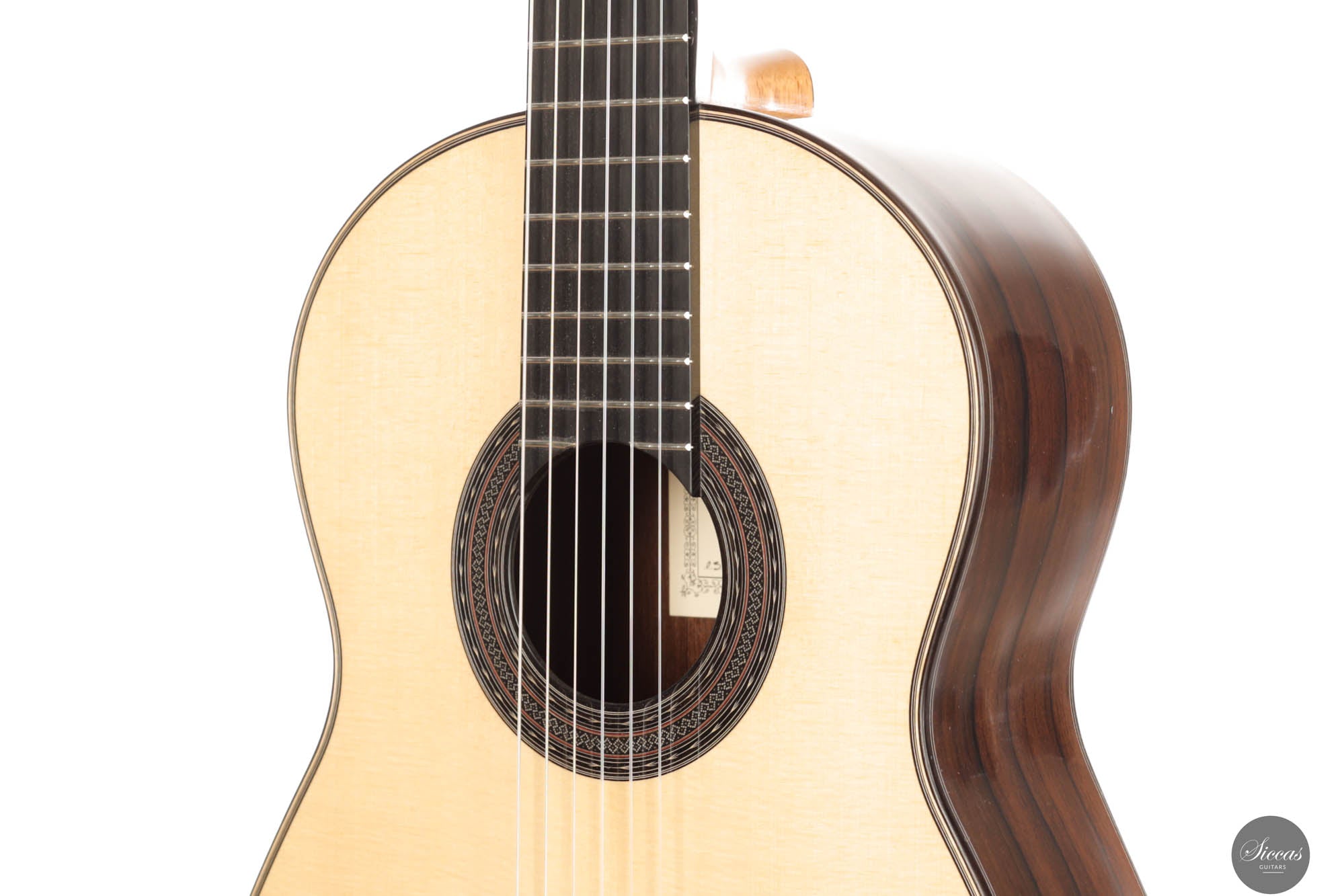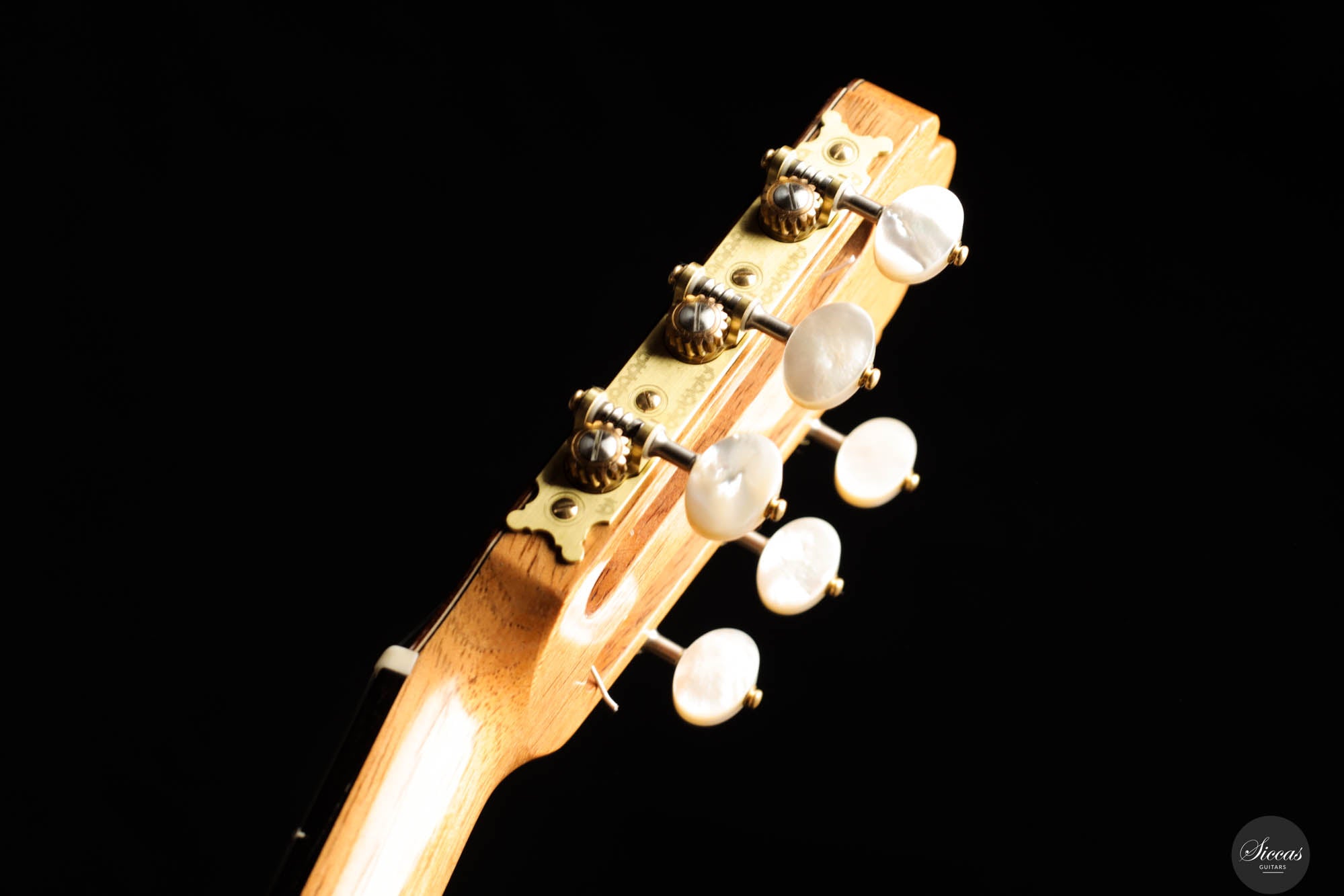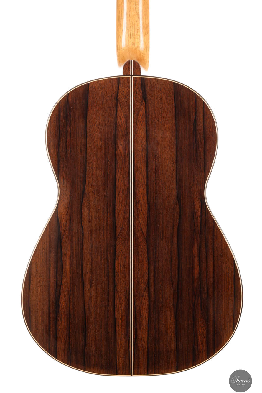 Diese Gitarre, gefertigt von Karel, ist eine akribisch genaue Nachbildung einer atemberaubenden Enrique Garcia aus dem Jahr 1912, ein Original, das Karel das Privileg hatte, im Detail zu studieren und zu untersuchen. Dieses Instrument fängt nicht nur die Essenz und den Geist der Garcia-Gitarre ein, sondern repliziert auch perfekt ihre akustischen und ästhetischen Eigenschaften. Karels Interpretation dieser Gitarre ist treffsicher, mit Höhen, die eine klare, singende Qualität haben, und direkten Bässen, die eine solide Grundlage für den Gesamtklang legen. Diese Kombination gewährleistet ein harmonisches Gleichgewicht und eine reiche Klangfärbung, was sie zu einer wahren Hommage an das Können von Enrique Garcia und ein Zeugnis für Karels Fähigkeiten als Gitarrenbauer macht.