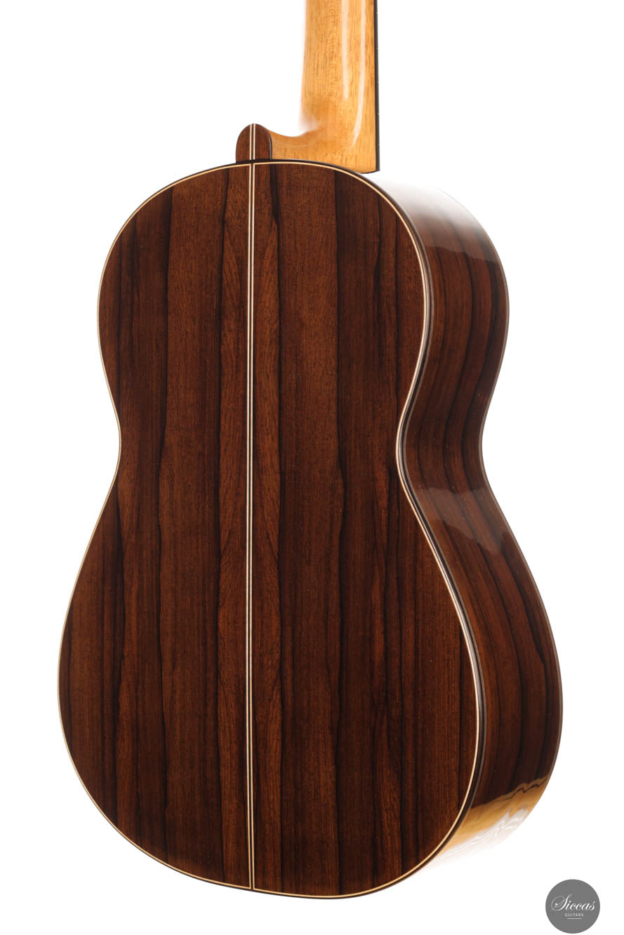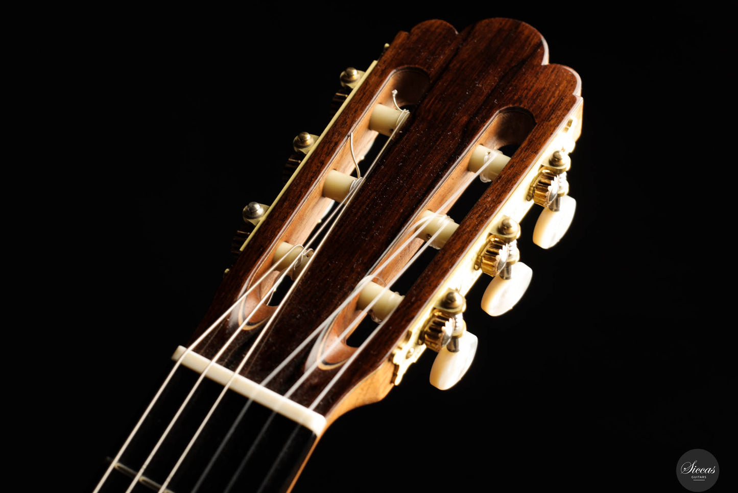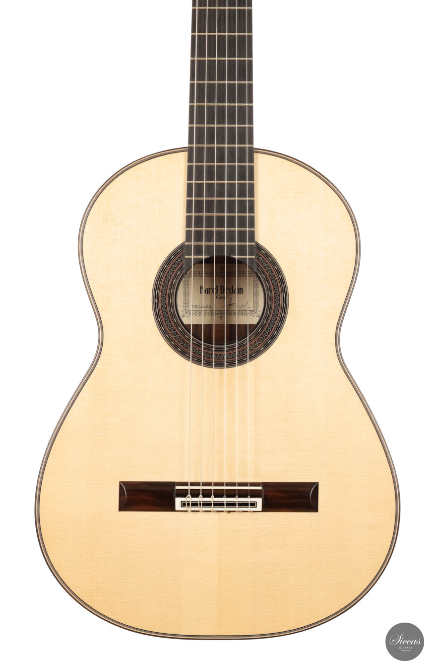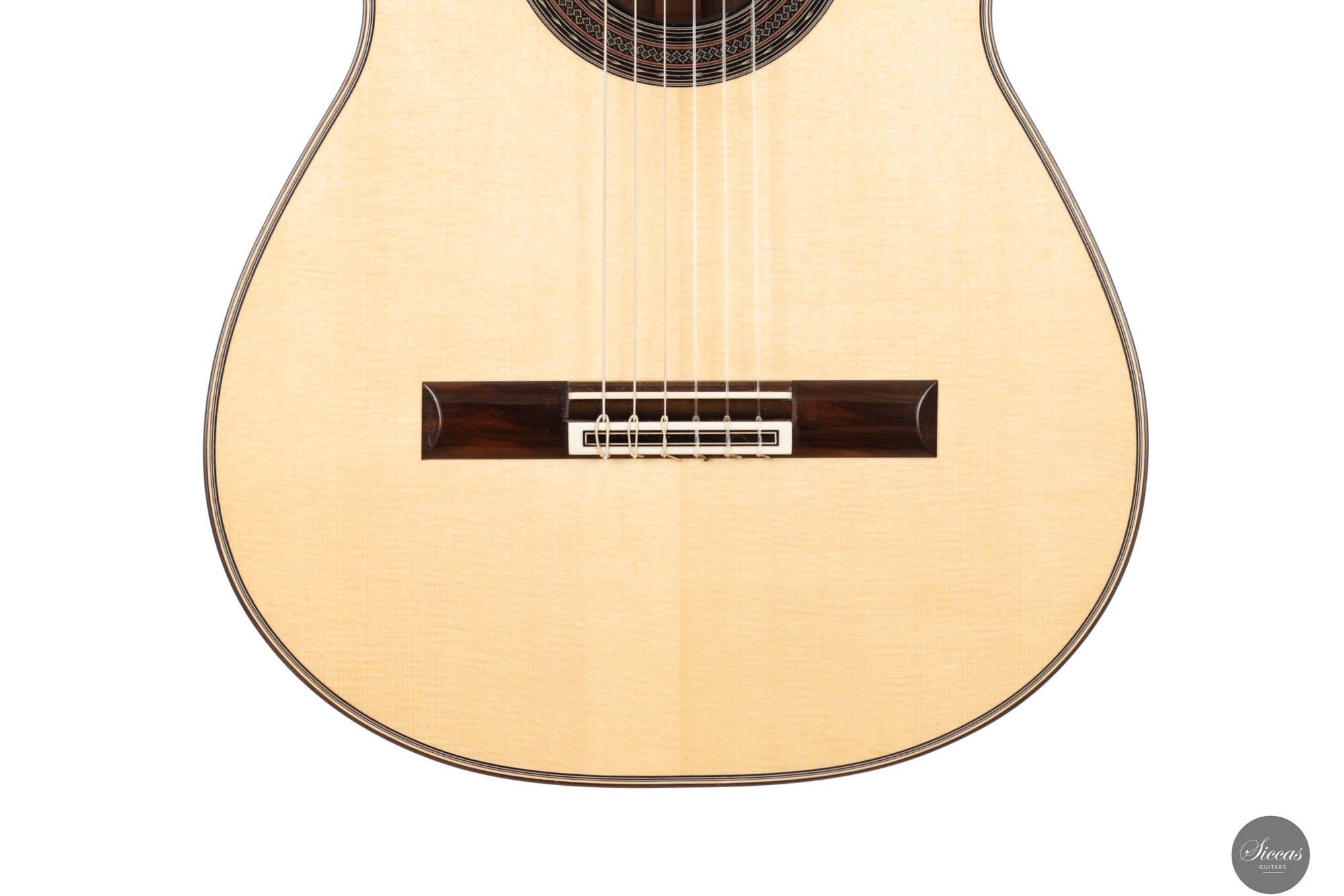 Diese Gitarre, gefertigt von Karel, ist eine akribisch genaue Nachbildung einer atemberaubenden Enrique Garcia aus dem Jahr 1912, ein Original, das Karel das Privileg hatte, im Detail zu studieren und zu untersuchen. Dieses Instrument fängt nicht nur die Essenz und den Geist der Garcia-Gitarre ein, sondern repliziert auch perfekt ihre akustischen und ästhetischen Eigenschaften. Karels Interpretation dieser Gitarre ist treffsicher, mit Höhen, die eine klare, singende Qualität haben, und direkten Bässen, die eine solide Grundlage für den Gesamtklang legen. Diese Kombination gewährleistet ein harmonisches Gleichgewicht und eine reiche Klangfärbung, was sie zu einer wahren Hommage an das Können von Enrique Garcia und ein Zeugnis für Karels Fähigkeiten als Gitarrenbauer macht.
