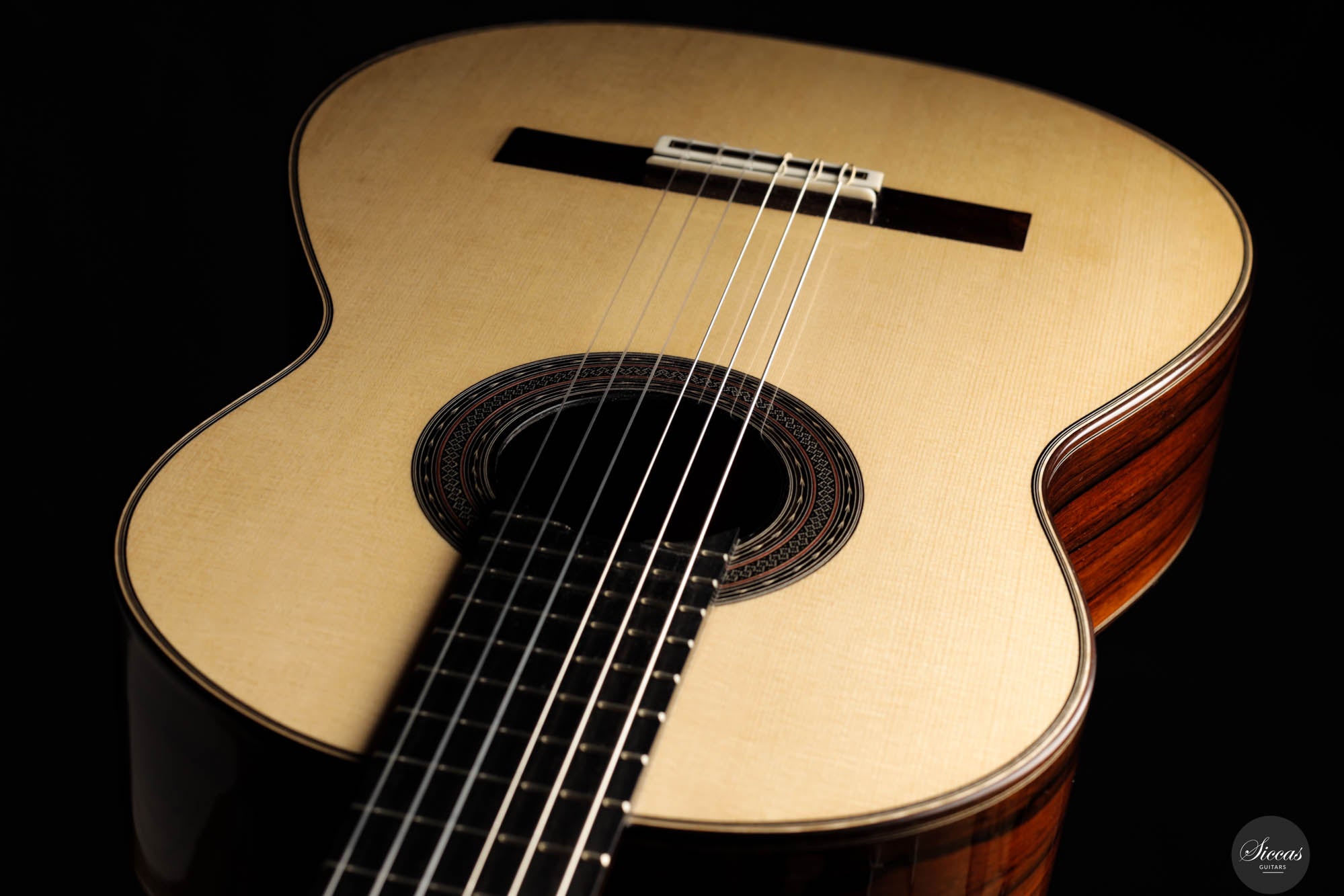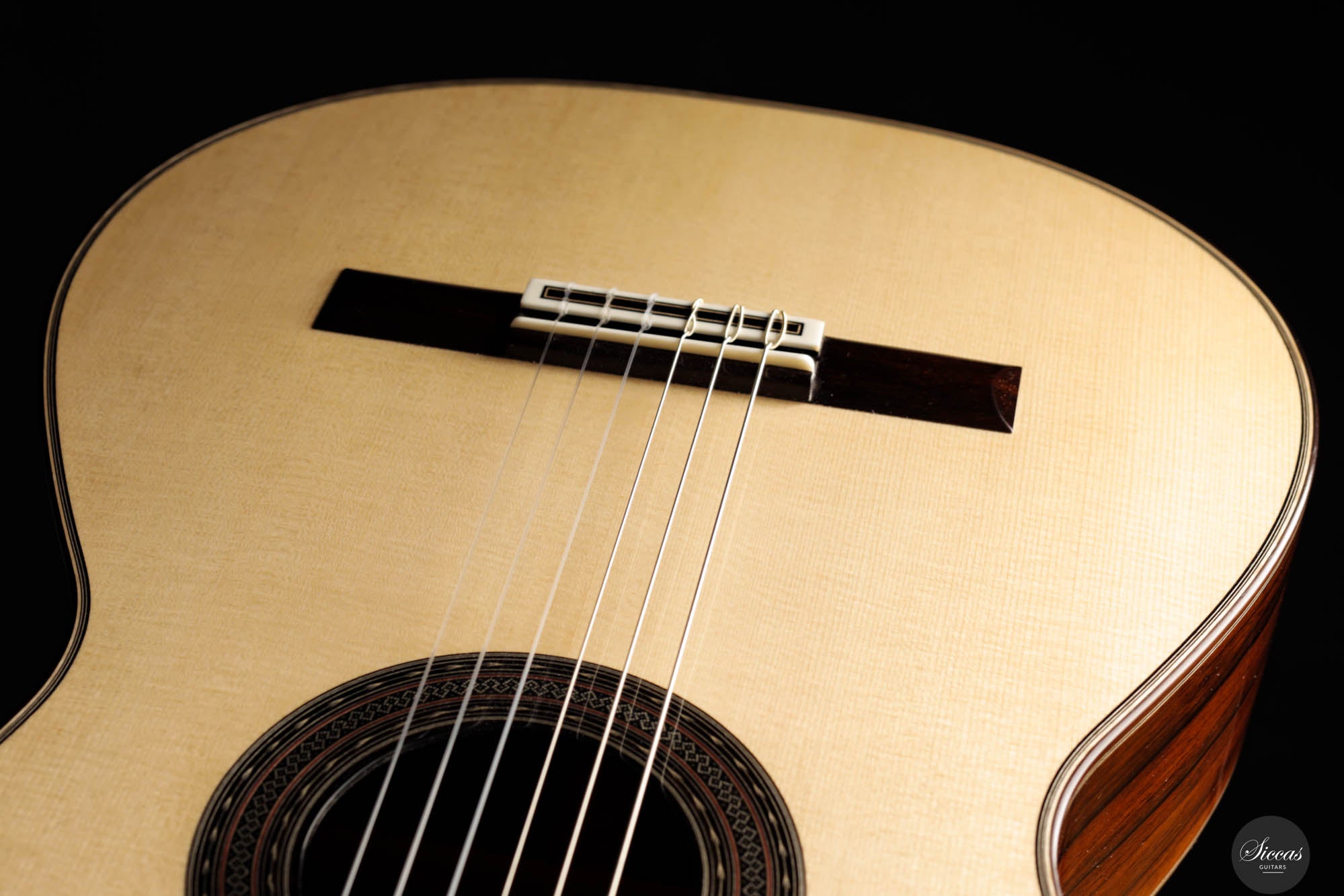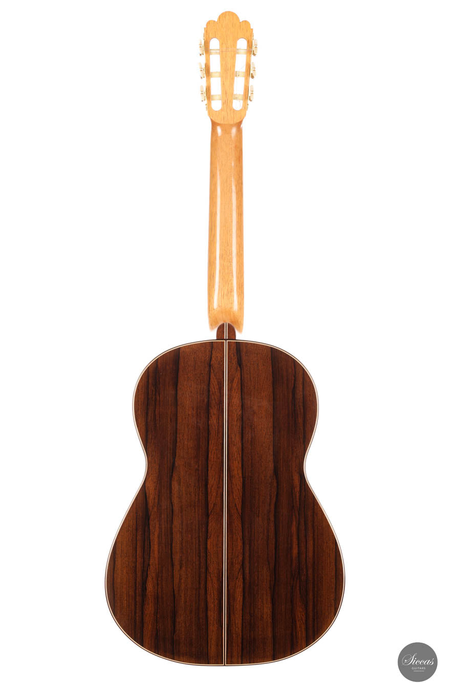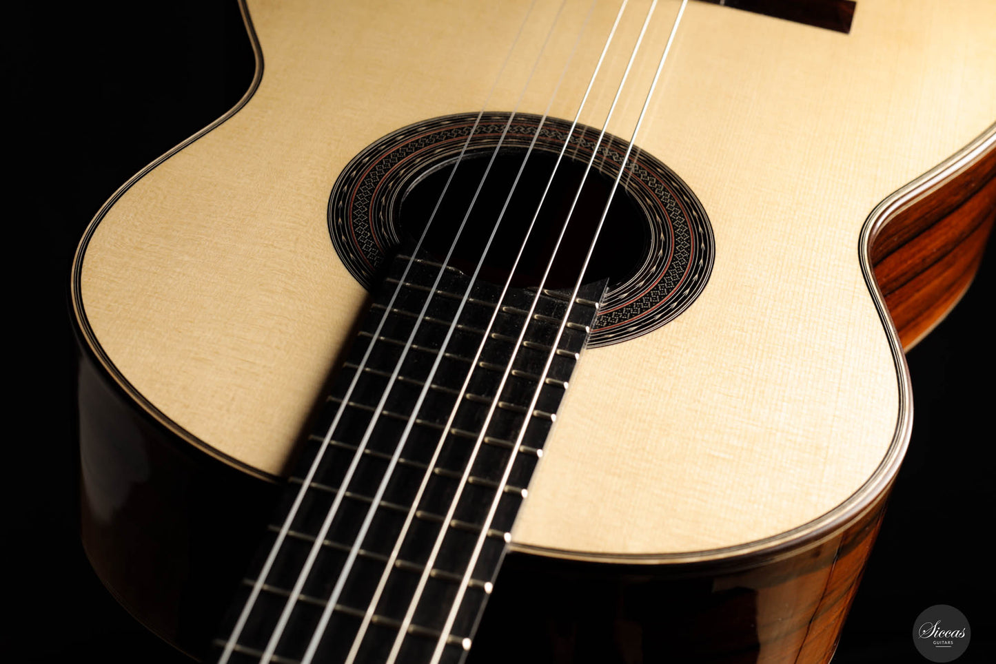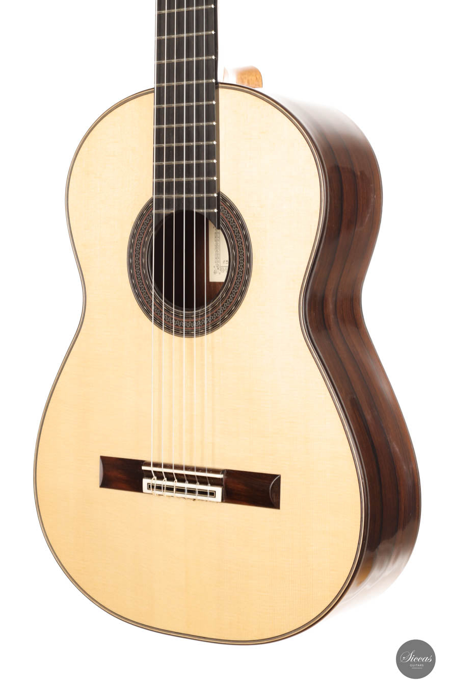 Diese Gitarre, gefertigt von Karel, ist eine akribisch genaue Nachbildung einer atemberaubenden Enrique Garcia aus dem Jahr 1912, ein Original, das Karel das Privileg hatte, im Detail zu studieren und zu untersuchen. Dieses Instrument fängt nicht nur die Essenz und den Geist der Garcia-Gitarre ein, sondern repliziert auch perfekt ihre akustischen und ästhetischen Eigenschaften. Karels Interpretation dieser Gitarre ist treffsicher, mit Höhen, die eine klare, singende Qualität haben, und direkten Bässen, die eine solide Grundlage für den Gesamtklang legen. Diese Kombination gewährleistet ein harmonisches Gleichgewicht und eine reiche Klangfärbung, was sie zu einer wahren Hommage an das Können von Enrique Garcia und ein Zeugnis für Karels Fähigkeiten als Gitarrenbauer macht.