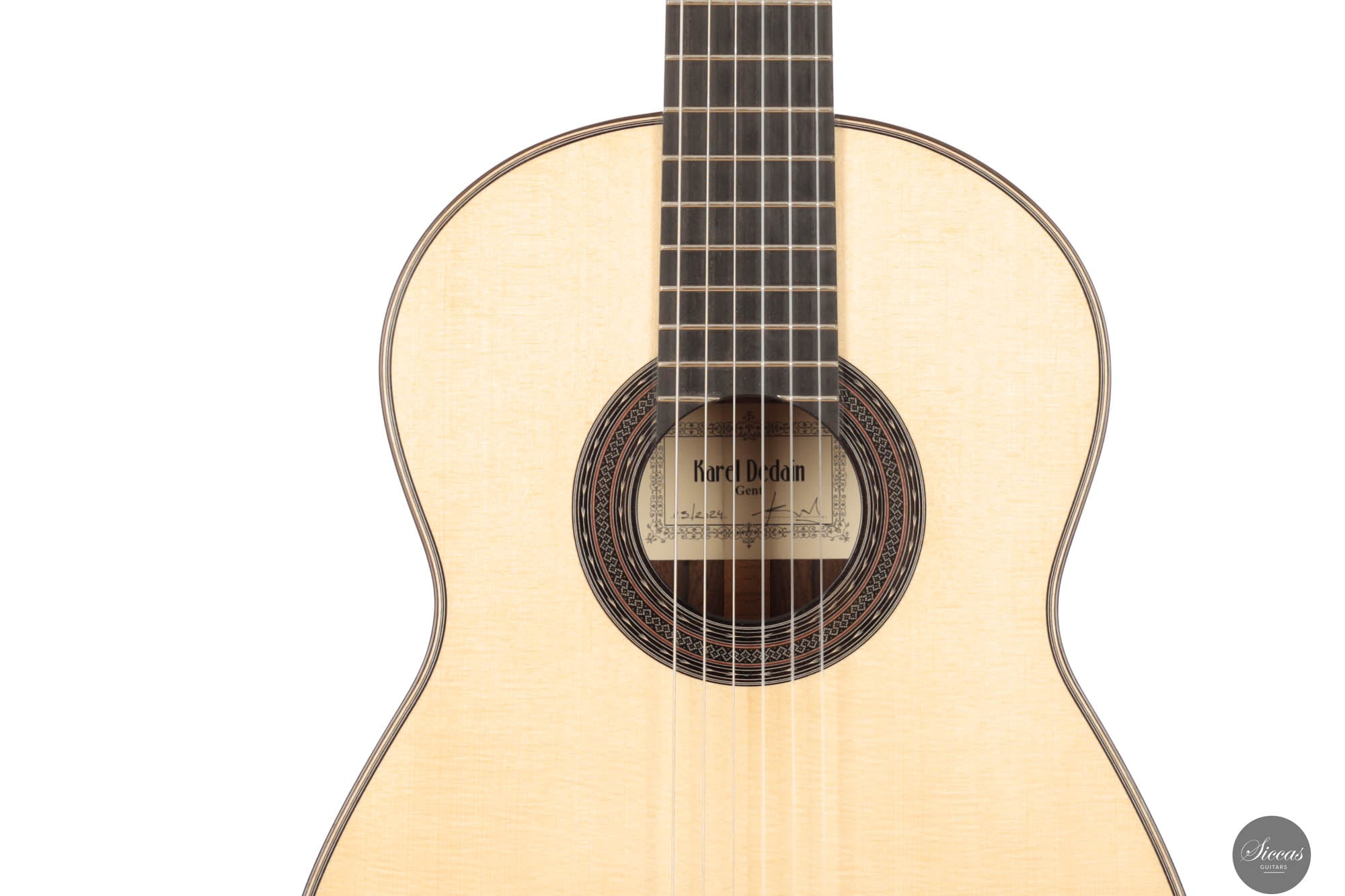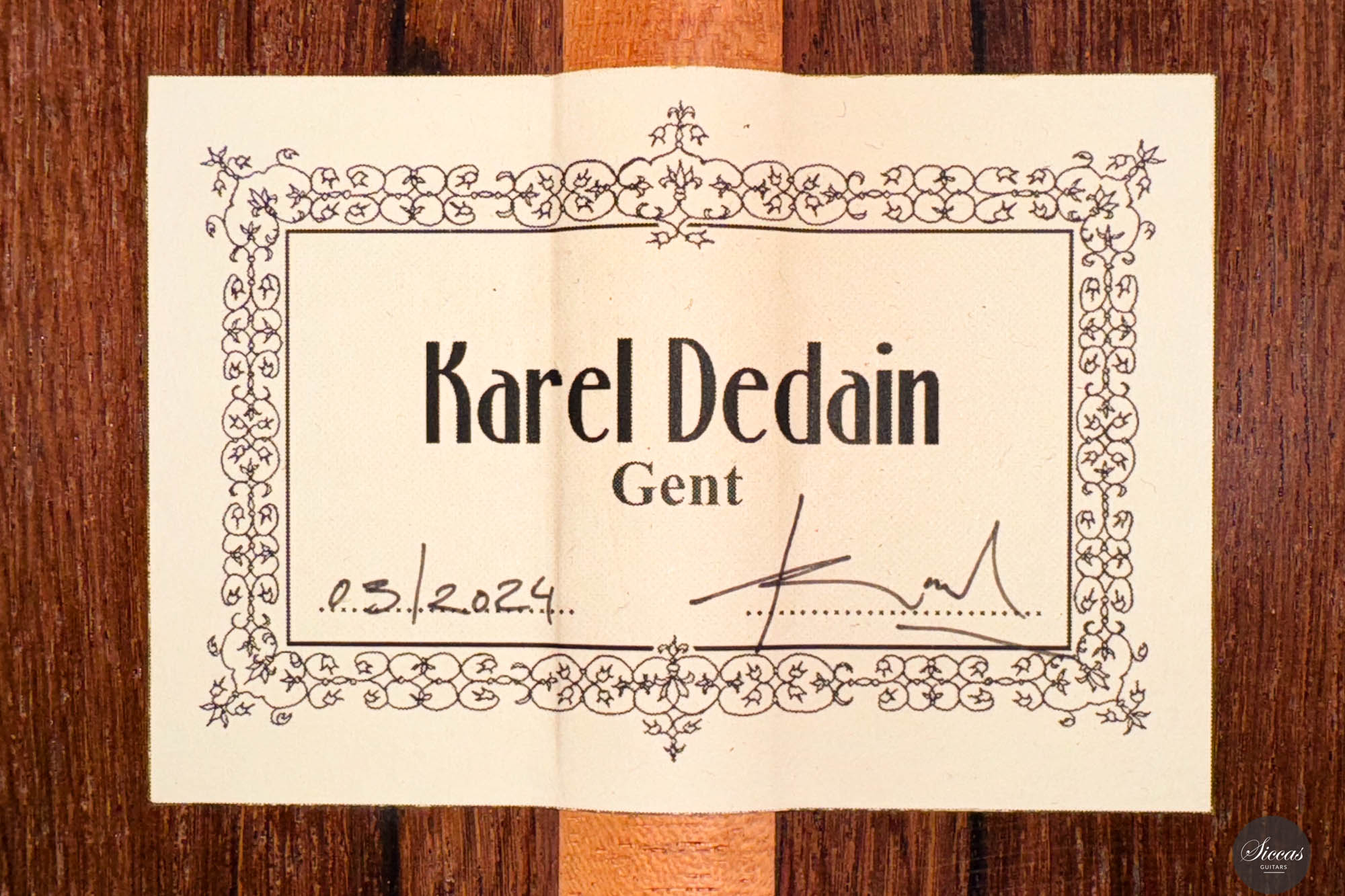 Karel Dedain wurde 1976 geboren und baute seine erste Gitarre im Jahr 1998. Er lebt und arbeitet in Gent, Belgien. Die Leidenschaft für das Flamencogitarrenspiel weckte sein Interesse am Gitarrenbau. So wurde er an der CMB (Centrum voor Muziekinstrumentenbouw) durch Walter Verreydt ausgebildet und baut seit 2006 hauptberuflich Gitarren. Spezialisiert ist Karel vor allem auf den Bau von klassischen und Flamencogitarren. Zudem lehrt er Gitarrenbau am Zentrum für Musikinstrumentenbau in Puurs, Belgien, zusammen mit Walter Verreydt. Karel baut etwa zehn Gitarren im Jahr, alle komplett in Handarbeit. Eine seiner Spezialitäten ist die Schellackpolitur. Seine Philosophie im Gitarrenbau ist, nicht alles neu zu erfinden, sondern sich der besten Ideen von historischen Gitarrenbauern wie Torres, Garcia, Arias und Hernandez zu bedienen und daraus wunderschöne Instrumente zu schaffen.