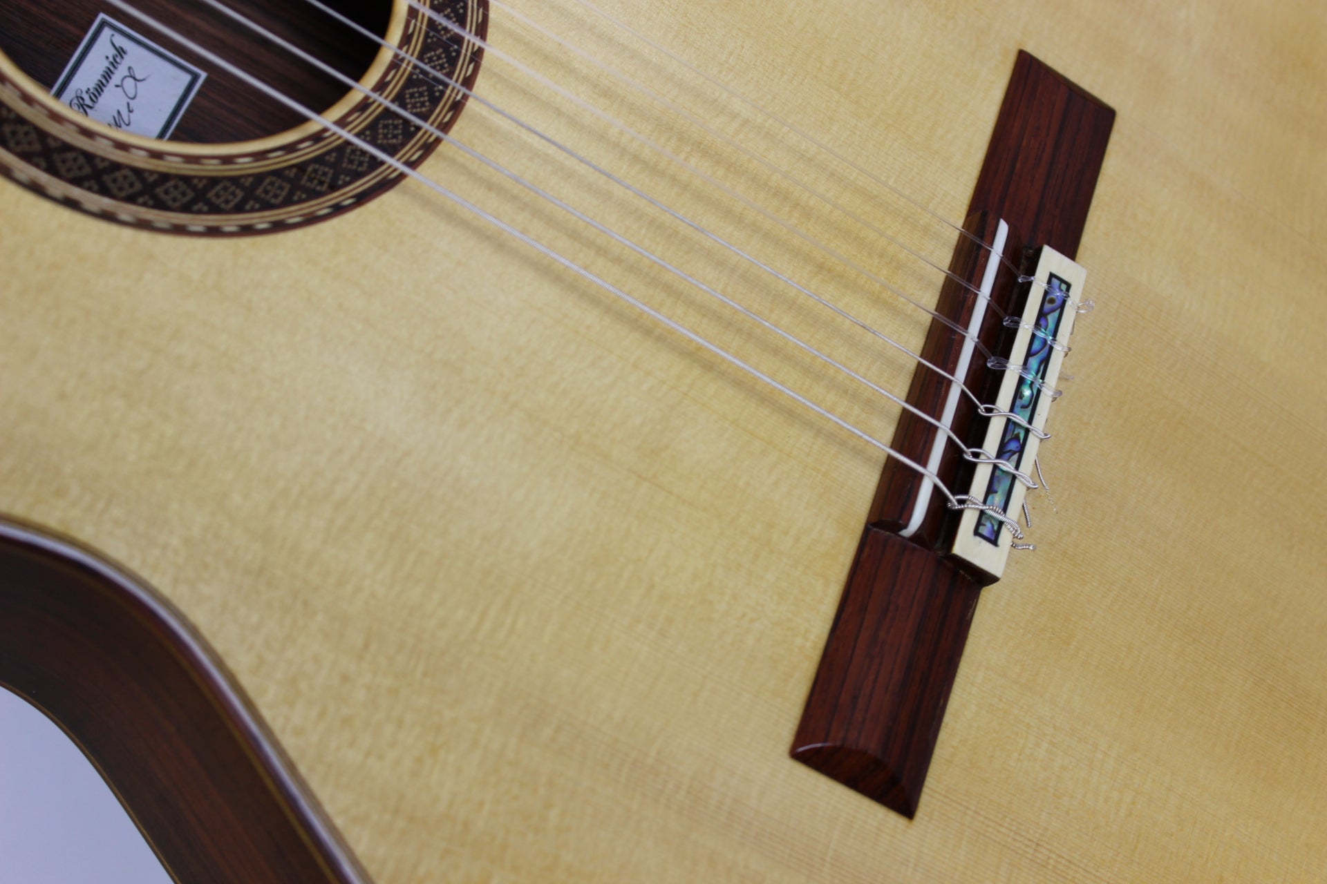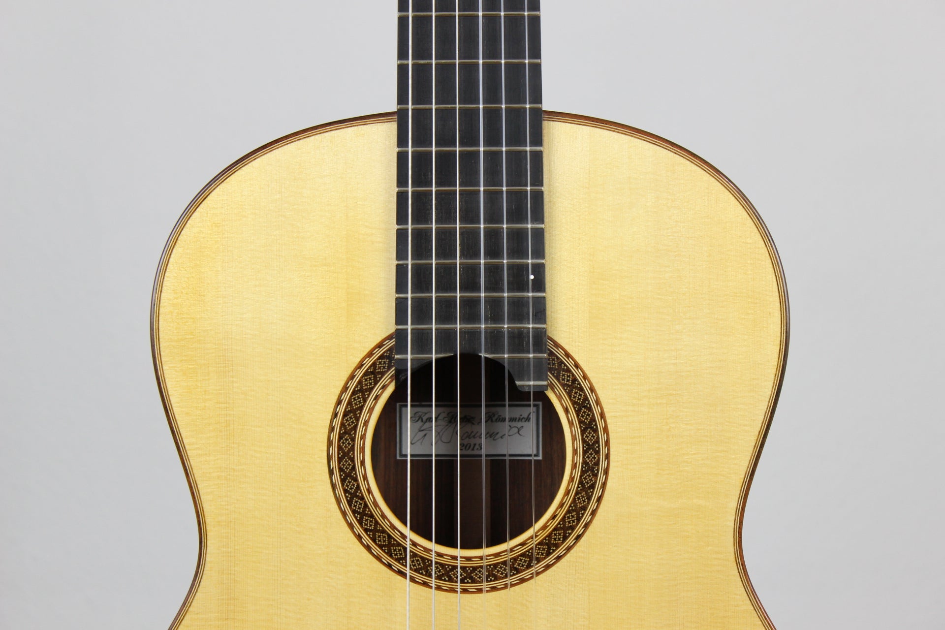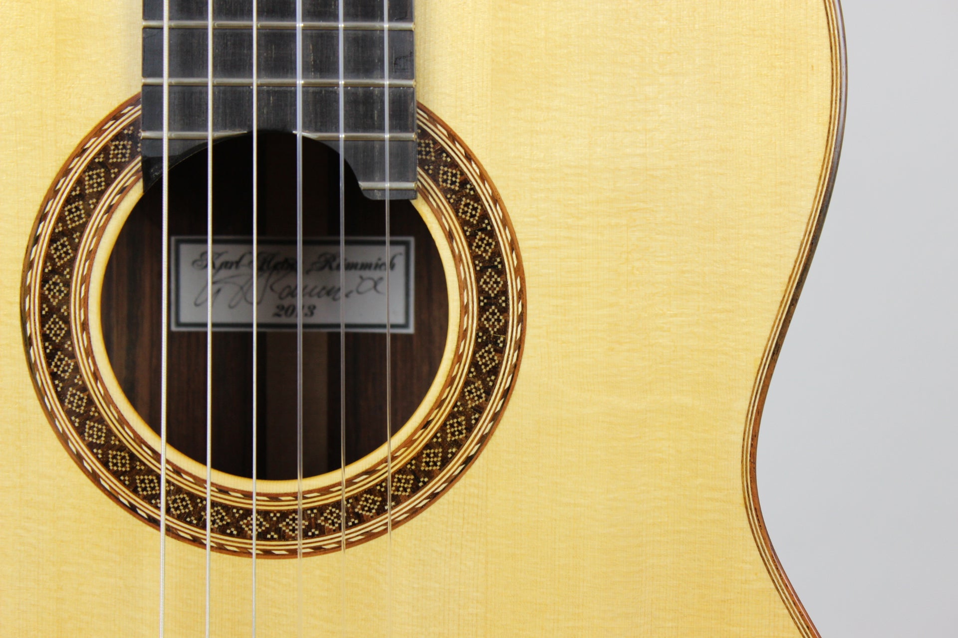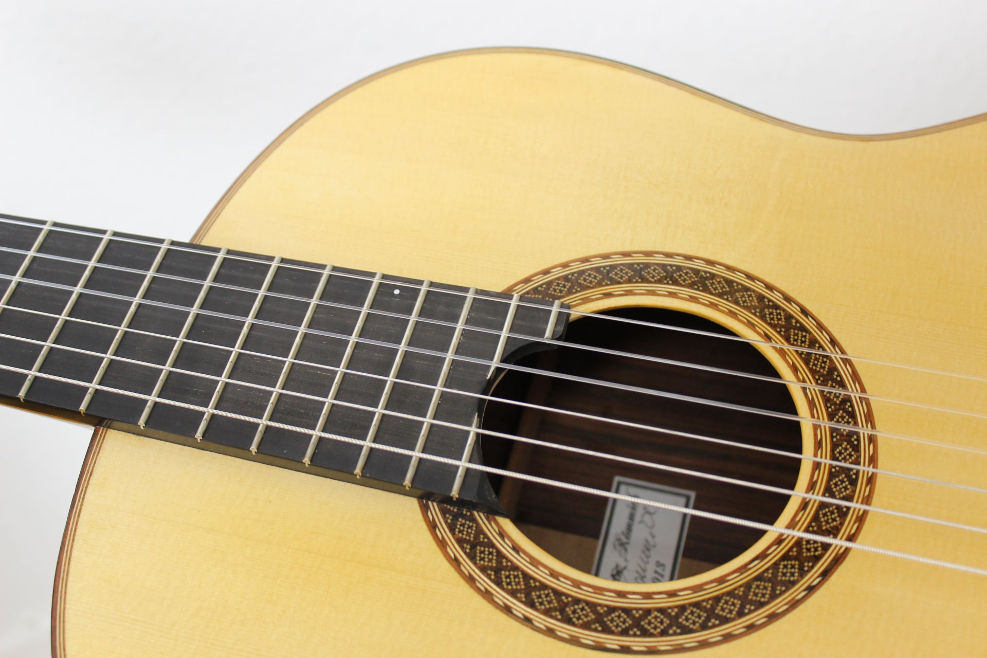 Karl-Heinz Römmich wurde 1953 geboren und baut seit über 30 Jahren Gitarren. Berühmte Gitarristen wie Xuefei Yang und Roman Viazovskiy spielen seine Gitarren. Karl-Heinzs Gitarren sind ganz dem spanischen Gitarrenbaustil gewidmet. Beste natürliche Materialien und nur beste Hölzer, die über 40 Jahre lang gelagert wurden verwendet Karl-Heinz für seine Gitarren. Veredelt werden alle seine Gitarren mit einer Schellackpolitur. Die Decke dieser Gitarre besteht aus feinster Fichte und der Boden sowie die Zargen sind aus indischem Palisander. Die Mechaniken sind von Fustero. Die Gitarre ist wie neu, da sie von Karl-Heinz Römmich mit einem neuen Schellack versehen wurde.