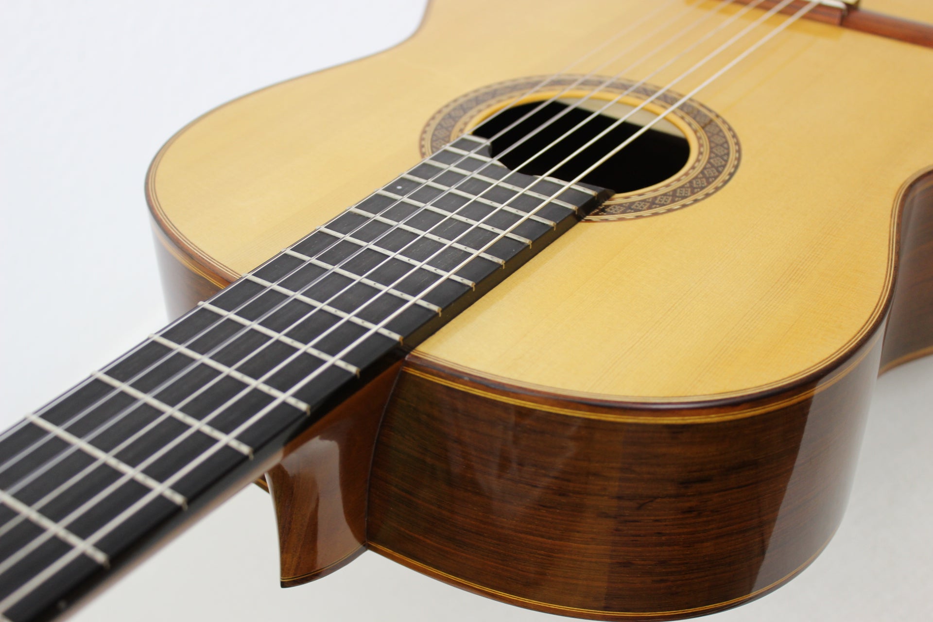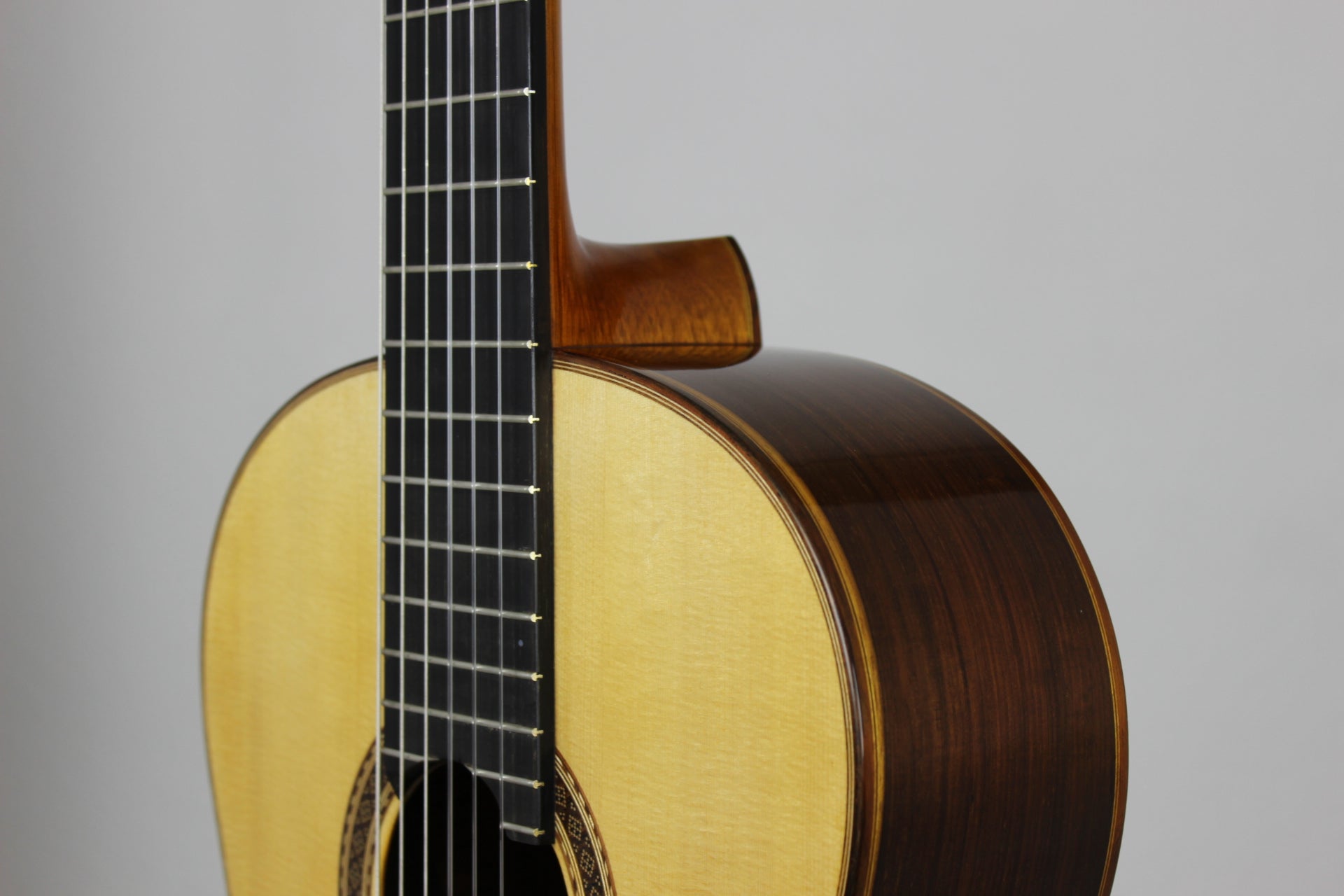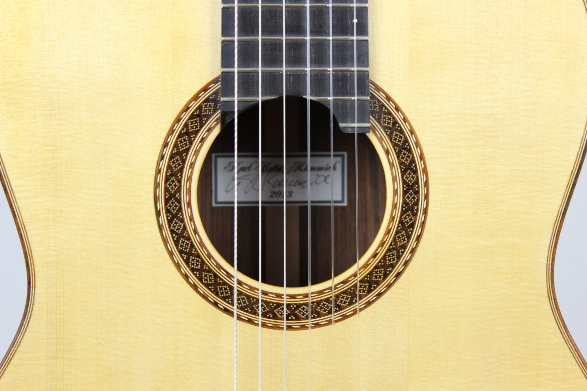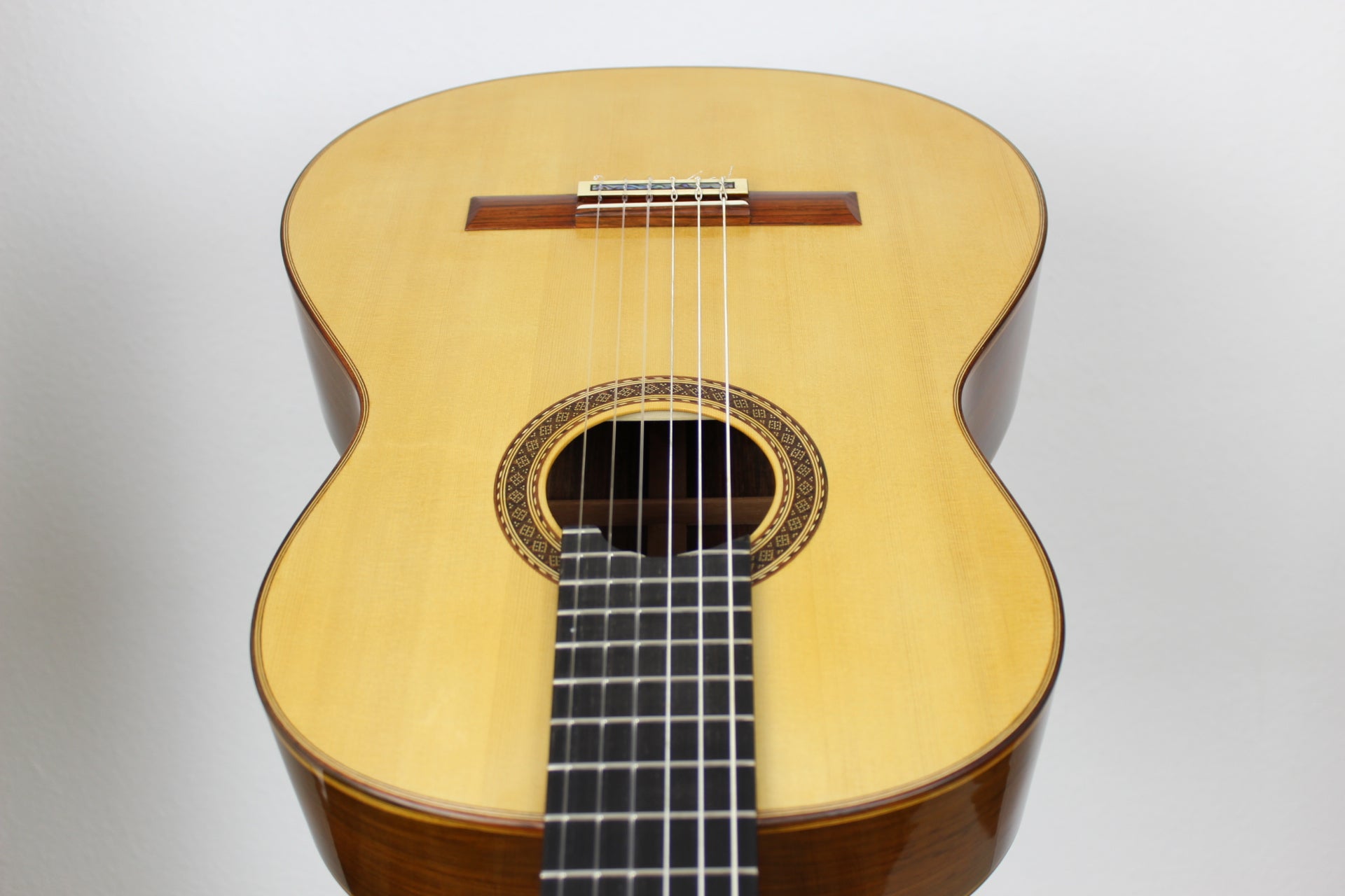 Karl-Heinz Römmich wurde 1953 geboren und baut seit über 30 Jahren Gitarren. Berühmte Gitarristen wie Xuefei Yang und Roman Viazovskiy spielen seine Gitarren. Karl-Heinzs Gitarren sind ganz dem spanischen Gitarrenbaustil gewidmet. Beste natürliche Materialien und nur beste Hölzer, die über 40 Jahre lang gelagert wurden verwendet Karl-Heinz für seine Gitarren. Veredelt werden alle seine Gitarren mit einer Schellackpolitur. Die Decke dieser Gitarre besteht aus feinster Fichte und der Boden sowie die Zargen sind aus indischem Palisander. Die Mechaniken sind von Fustero. Die Gitarre ist wie neu, da sie von Karl-Heinz Römmich mit einem neuen Schellack versehen wurde.