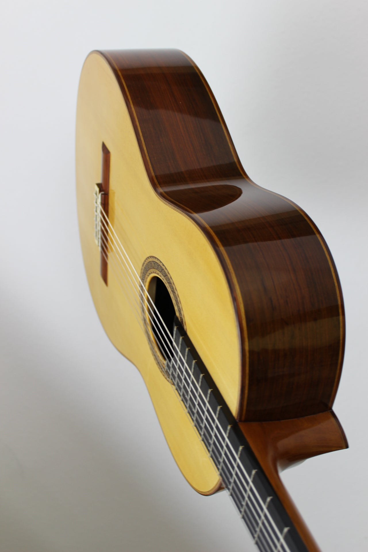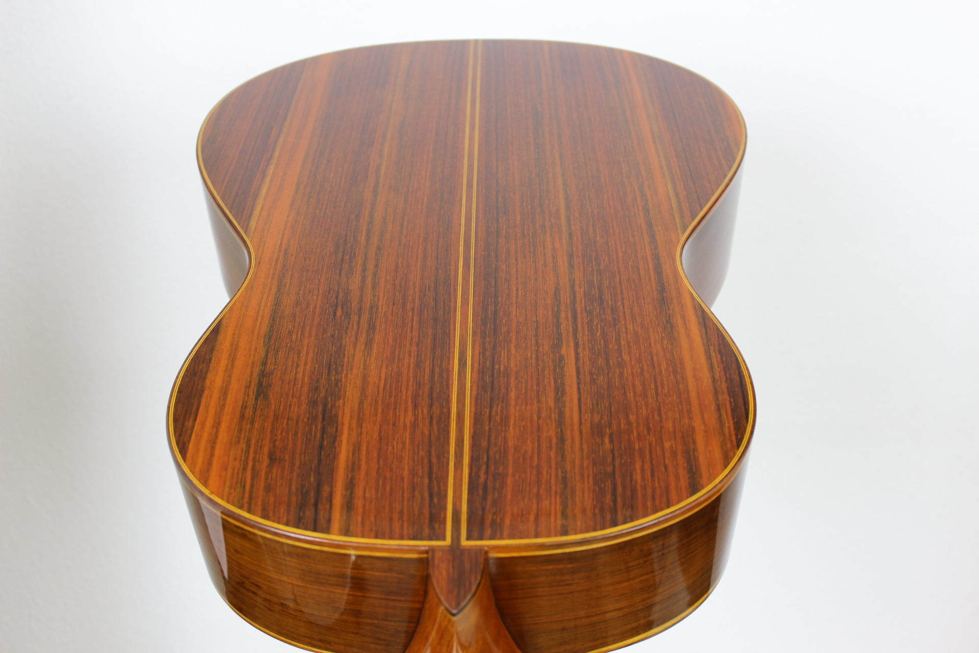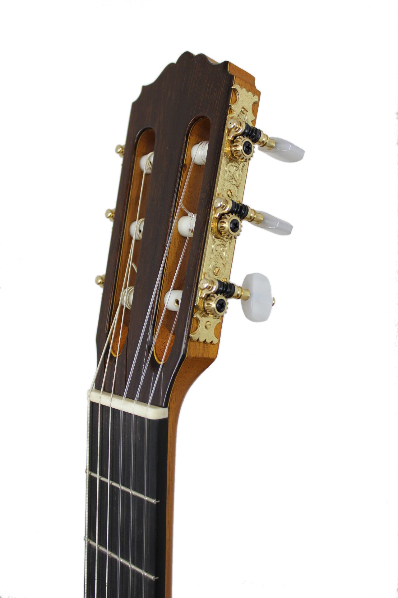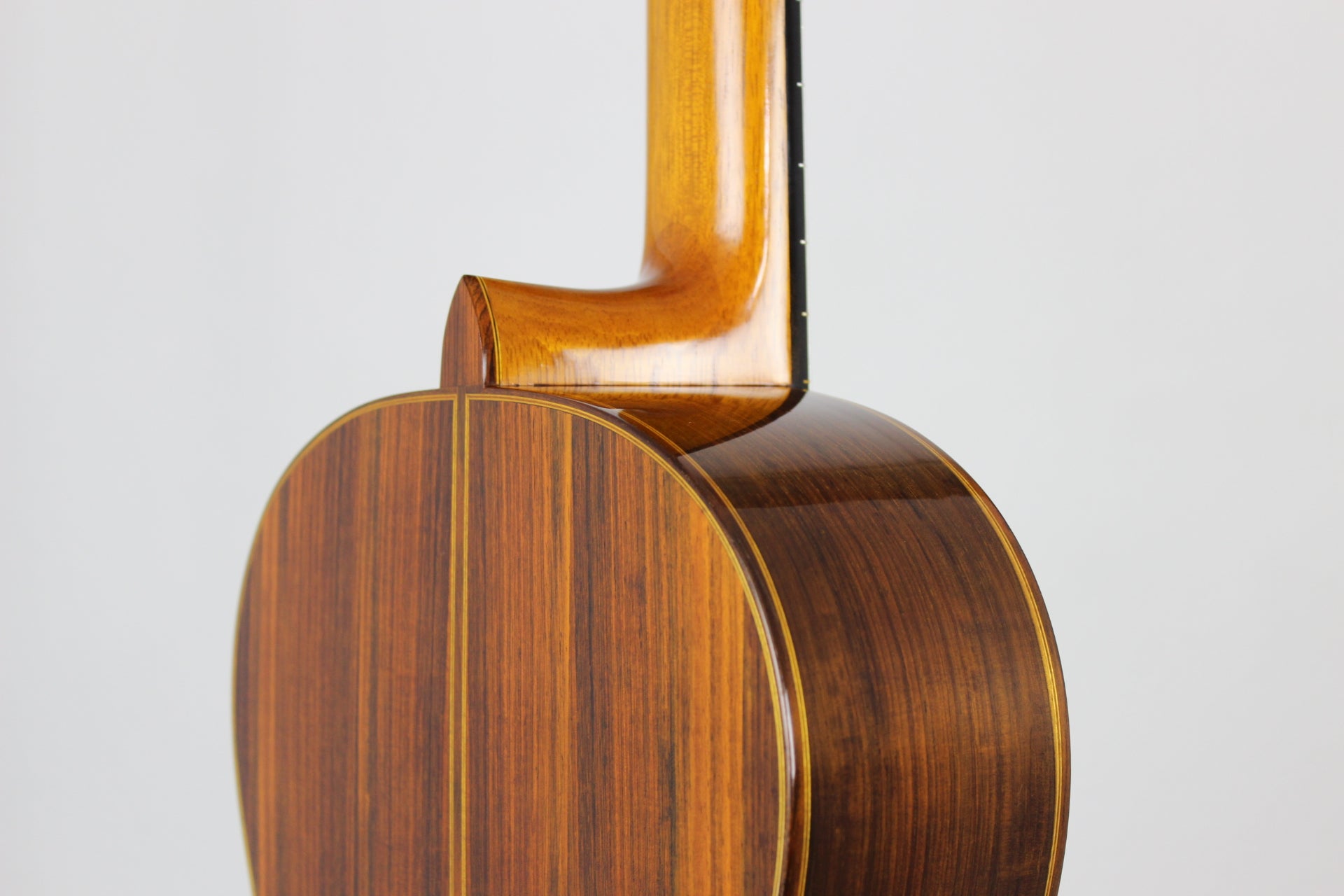 Karl-Heinz Römmich wurde 1953 geboren und baut seit über 30 Jahren Gitarren. Berühmte Gitarristen wie Xuefei Yang und Roman Viazovskiy spielen seine Gitarren. Karl-Heinzs Gitarren sind ganz dem spanischen Gitarrenbaustil gewidmet. Beste natürliche Materialien und nur beste Hölzer, die über 40 Jahre lang gelagert wurden verwendet Karl-Heinz für seine Gitarren. Veredelt werden alle seine Gitarren mit einer Schellackpolitur. Die Decke dieser Gitarre besteht aus feinster Fichte und der Boden sowie die Zargen sind aus indischem Palisander. Die Mechaniken sind von Fustero. Die Gitarre ist wie neu, da sie von Karl-Heinz Römmich mit einem neuen Schellack versehen wurde.