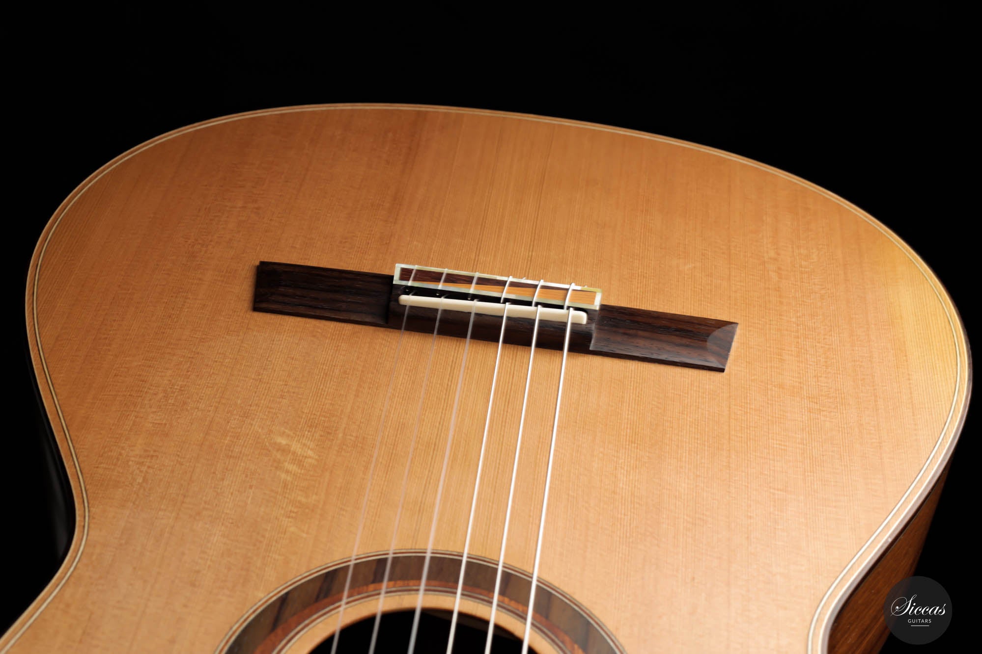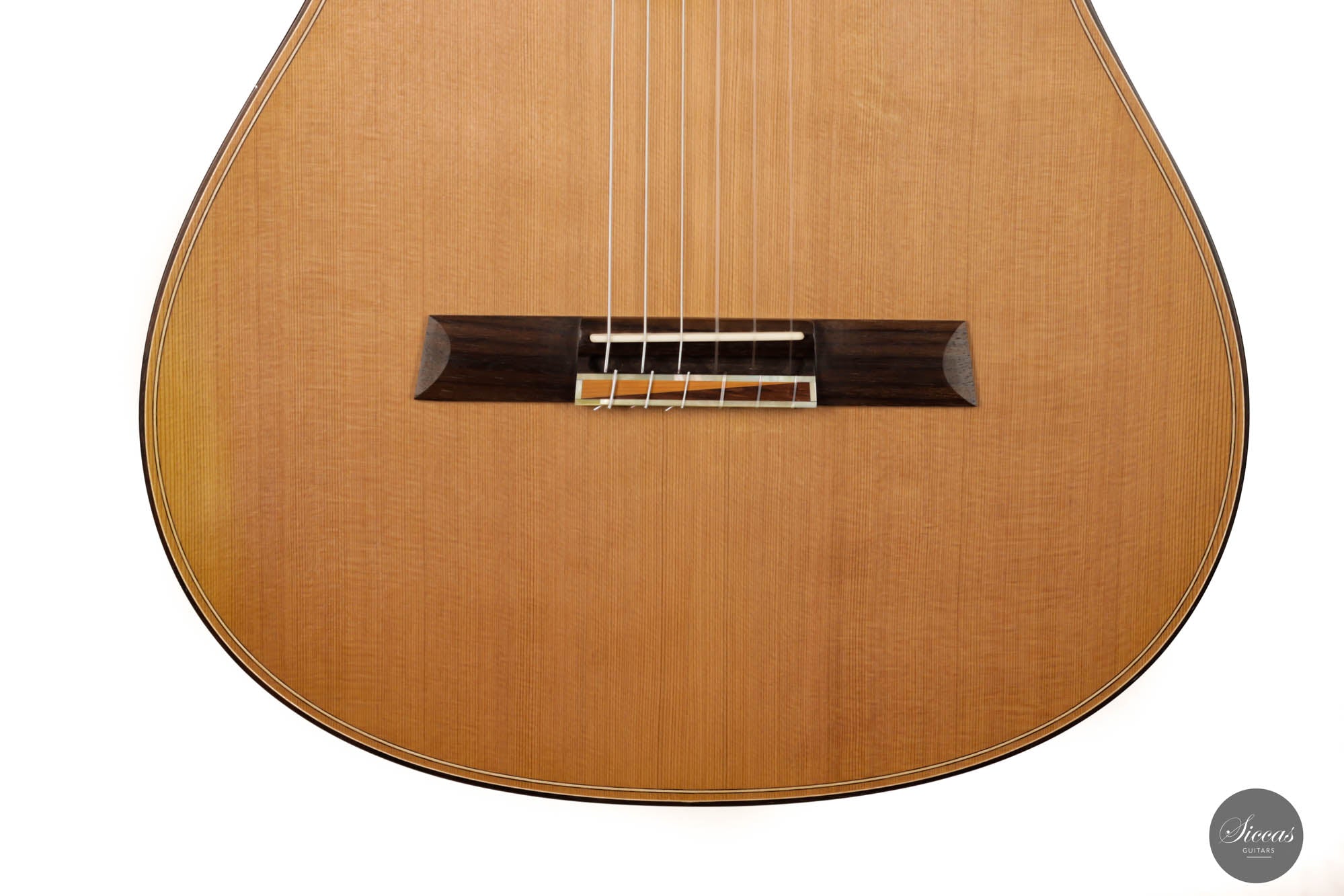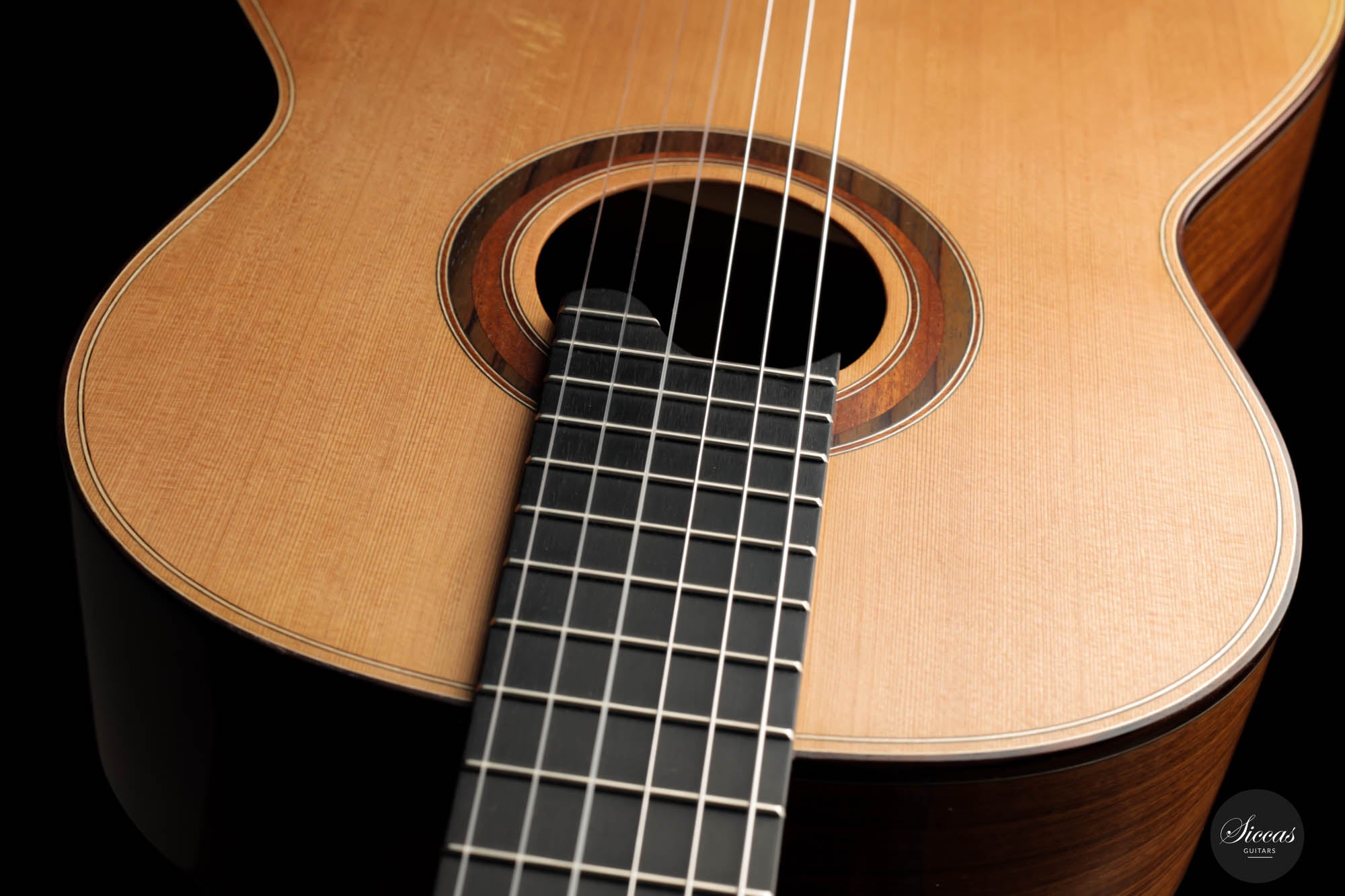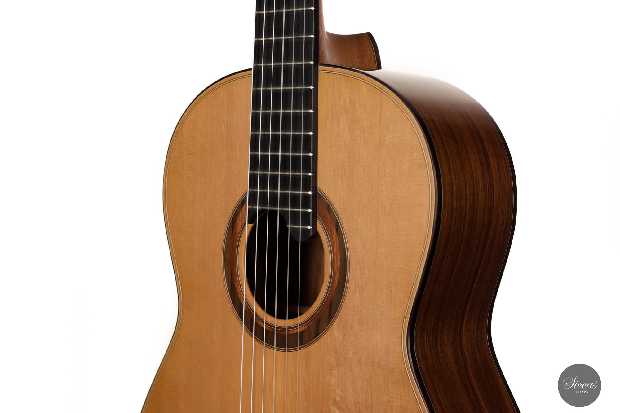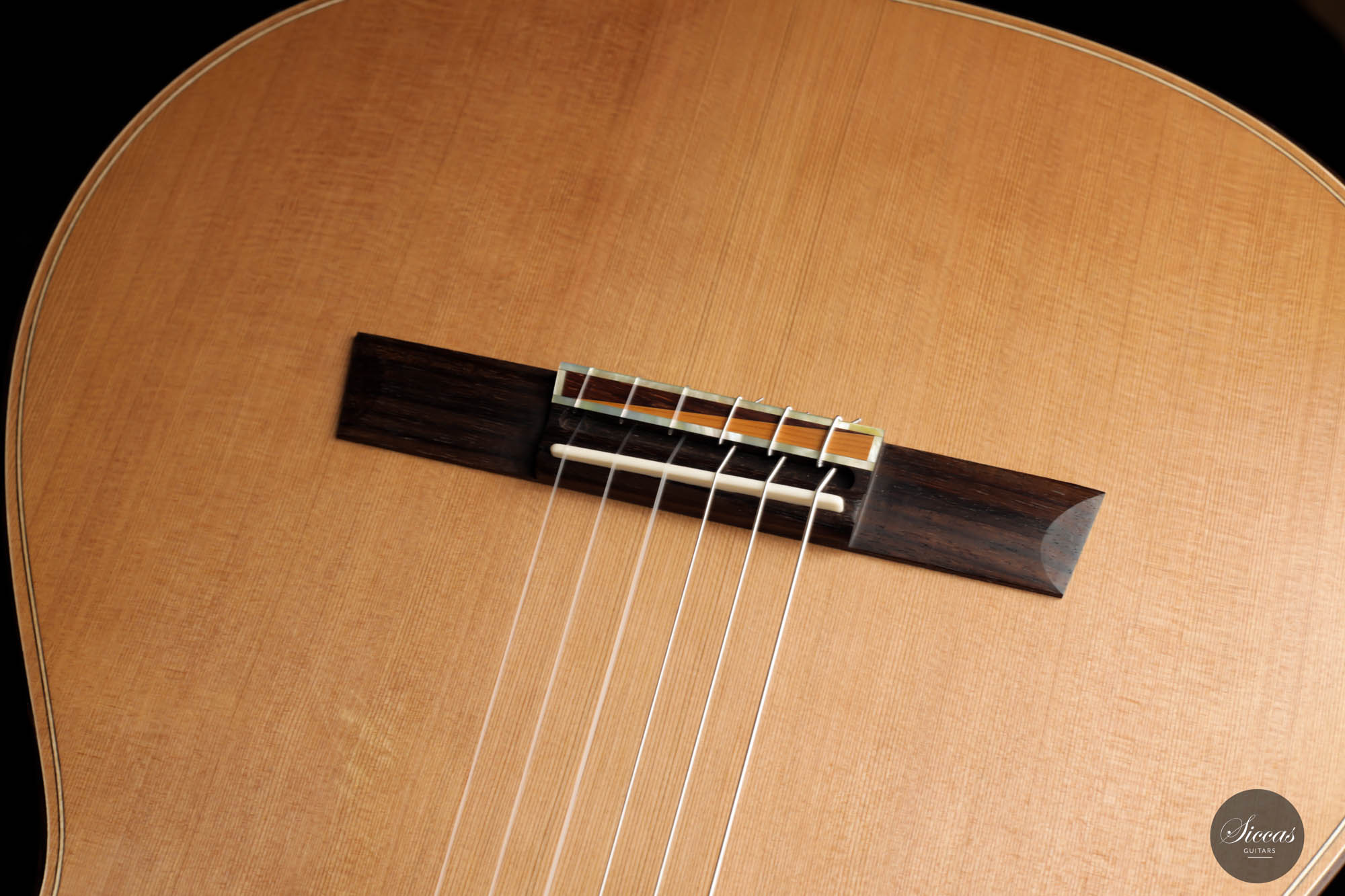 Die Karl Höfner HM 92 Sarabande Gitarre ist ein großartiges Instrument. Ihr Korpus ist aus feinstem Santos-Palisander gefertigt, der bis zur Perfektion poliert wurde. Die Zederndecke wurde über viele Jahre luftgetrocknet, was ihr einen einzigartigen Charakter und Ton verleiht. Die Decke ist mit einem sehr dünnen Oberflächenfinish versiegelt, das den natürlichen Klang des Holzes durchscheinen lässt. Der Hals ist mit einem matten Finish versehen, das einen angenehmen Griff ermöglicht und das Spielerlebnis insgesamt verbessert. Die HM 92 Sarabande-Gitarre bietet eine hervorragende Ausgewogenheit und ist für eine Vielzahl von Gitarristen geeignet, vom Schüler bis zum Profi. Ihr satter und warmer Ton, kombiniert mit ihrer außergewöhnlichen Bespielbarkeit, macht das Spielen zu einer Freude. Diese Gitarre ist ein echtes Zeugnis für das Fachwissen und die Hingabe von Karl Höfner, ein Erbe, das von der Firma seit über einem Jahrhundert weitergeführt wird. Als gebrauchtes Instrument ist diese Gitarre in gutem Zustand mit einigen Spielspuren. Diese sind jedoch rein kosmetischer Natur und beeinträchtigen den Klang der Gitarre in keiner Weise.