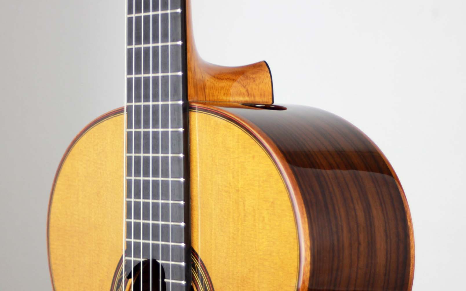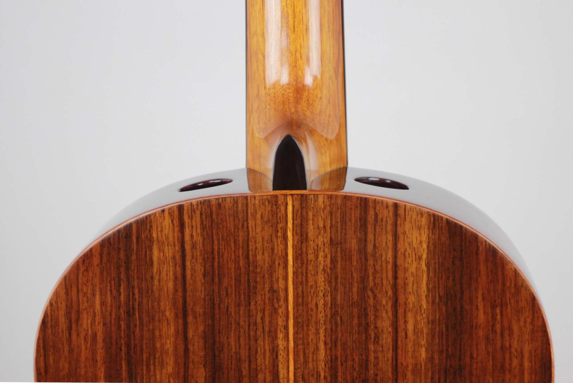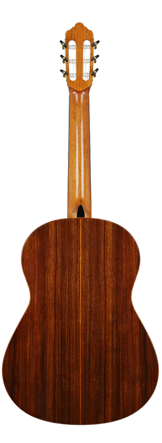 As President of Hill Guitar Company,Inc., Kenny continues to develop the Hill Guitar line in Santa Cruz building fine classical guitars for the world market. This is the location where luthiers are making the entire range of Signature, and Performance model guitars. Kenny Hill has written many articles for various guitar publications, including Acoustic Guitar, Soundboard, and American Lutherie. This guitar is designed for the player desiring a nylon string instrument with easy left hand reach. It has a double top made of two very thin layers of cedar, Nomex and spruce. In this case the cedar is facing out and gives the sound its dominant character, while the inner layer flavours it.