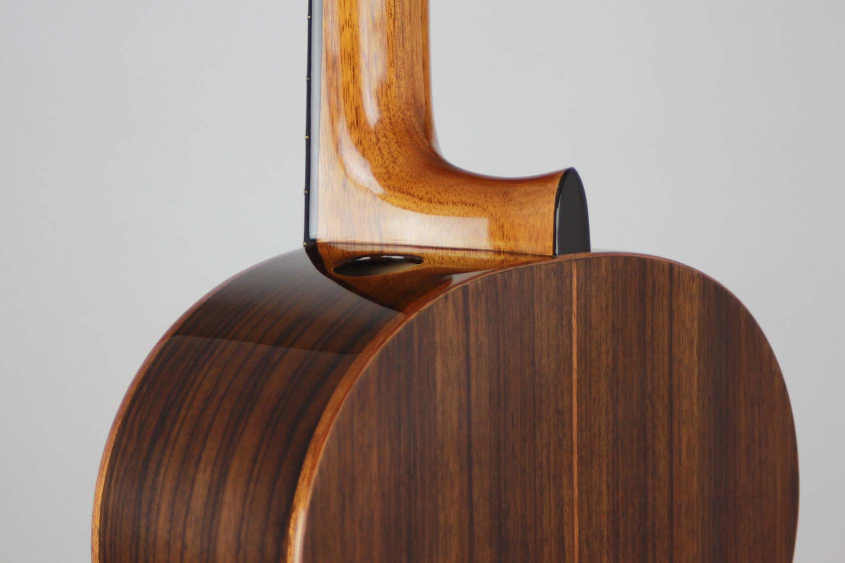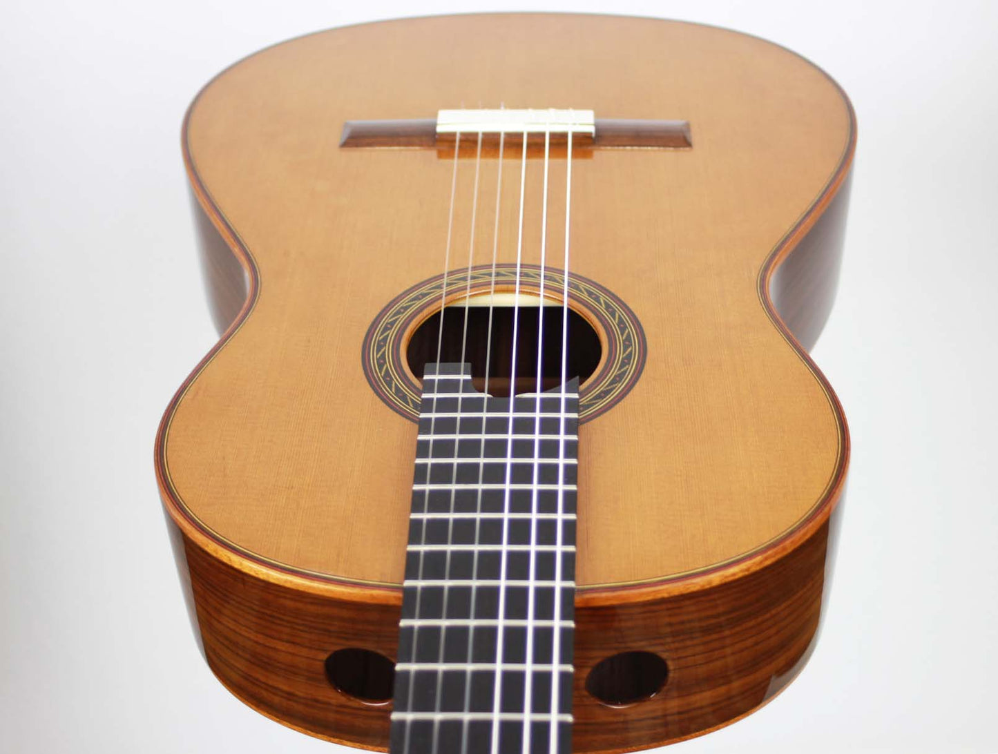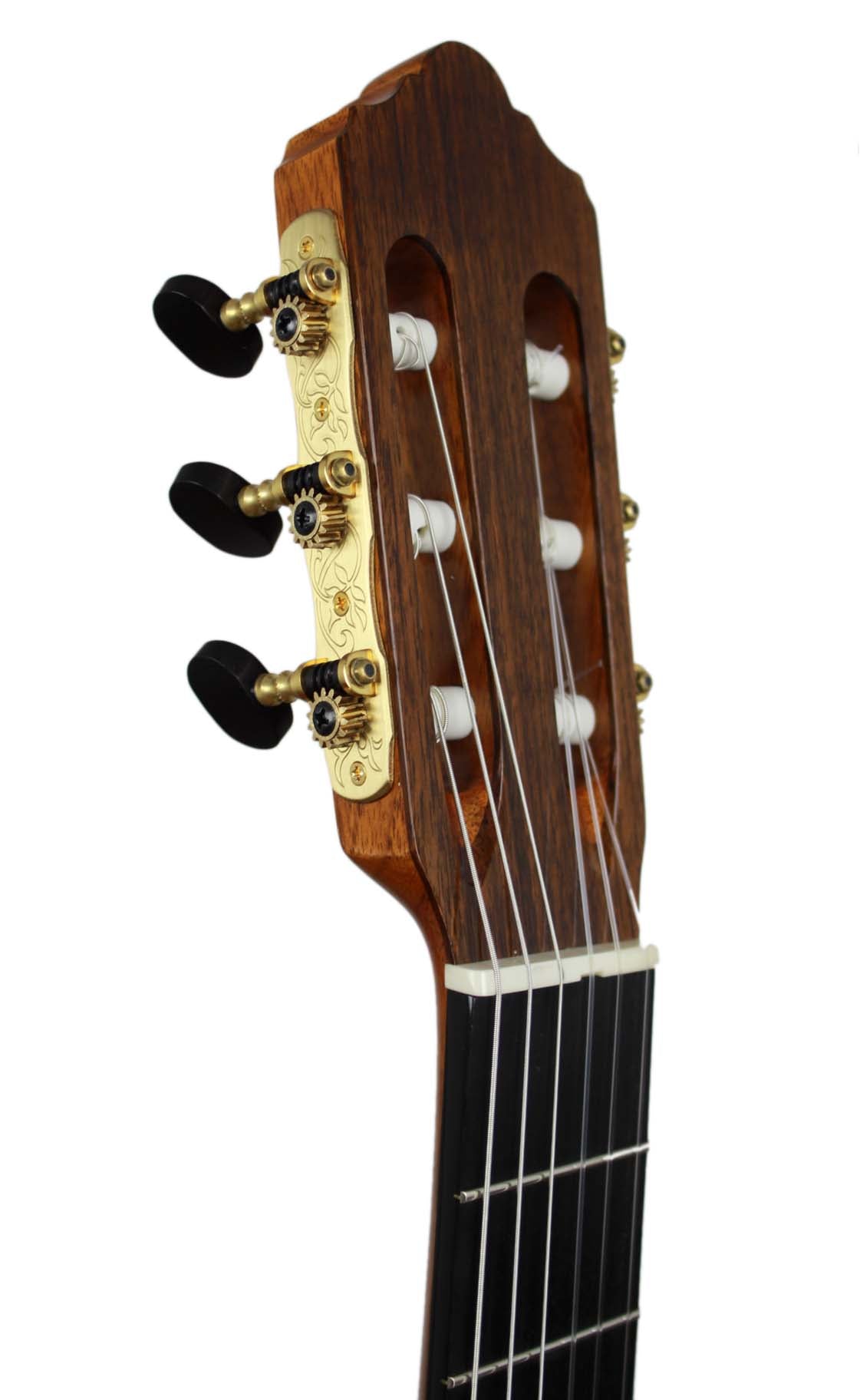 As President of Hill Guitar Company,Inc., Kenny continues to develop the Hill Guitar line in Santa Cruz building fine classical guitars for the world market. This is the location where luthiers are making the entire range of Signature, and Performance model guitars. Kenny Hill has written many articles for various guitar publications, including Acoustic Guitar, Soundboard, and American Lutherie. This guitar is designed for the player desiring a nylon string instrument with easy left hand reach. It has a double top made of two very thin layers of cedar, Nomex and spruce. In this case the cedar is facing out and gives the sound its dominant character, while the inner layer flavours it.