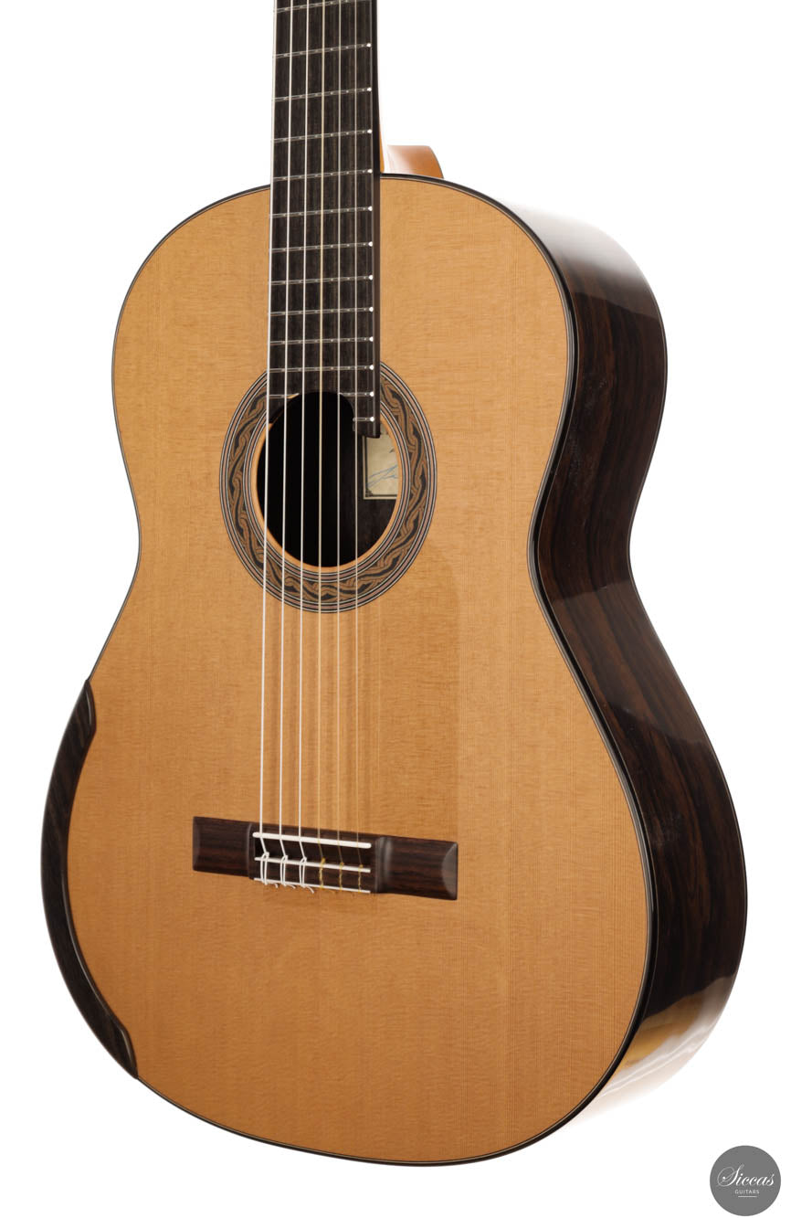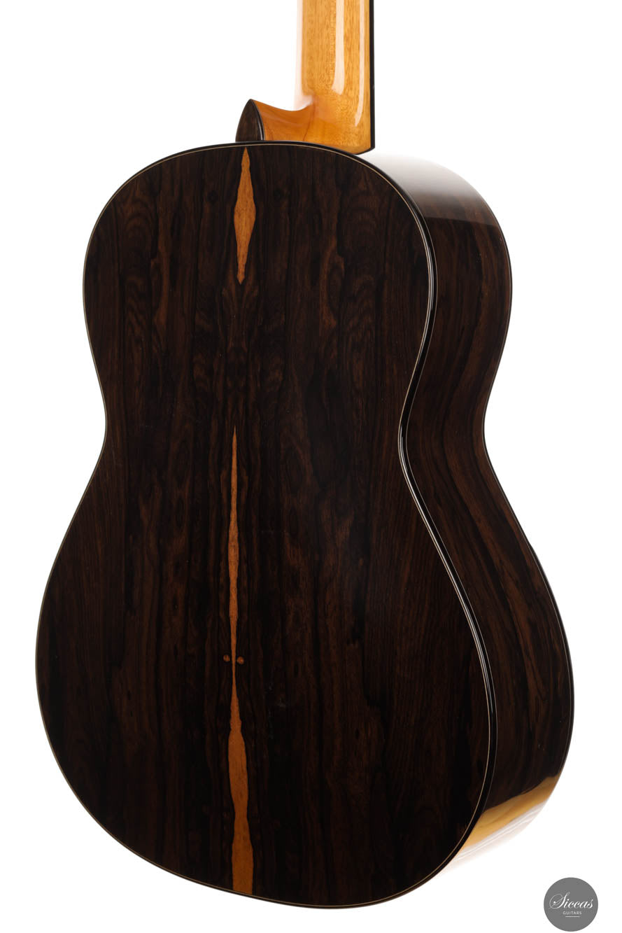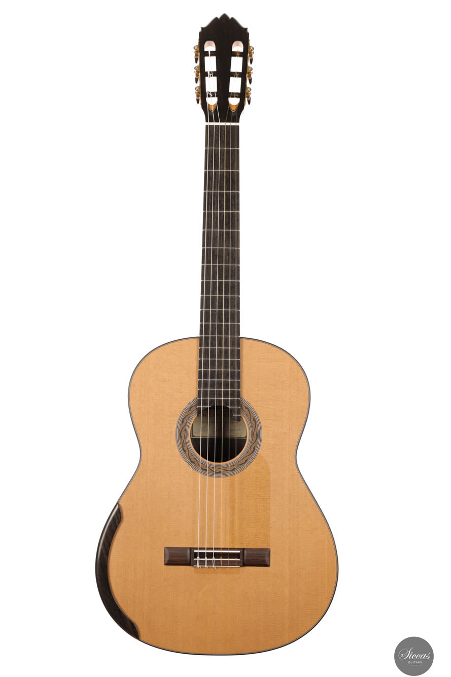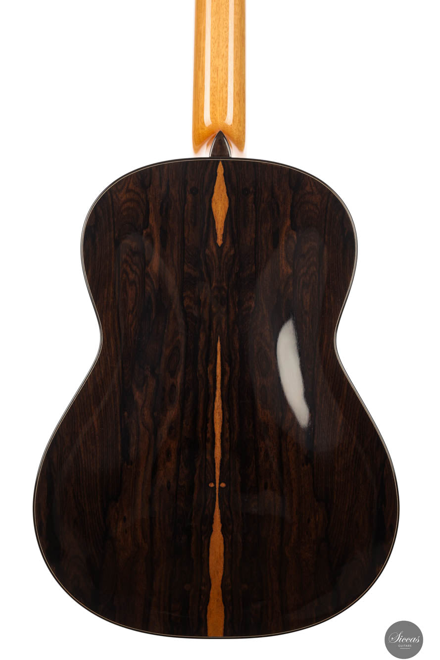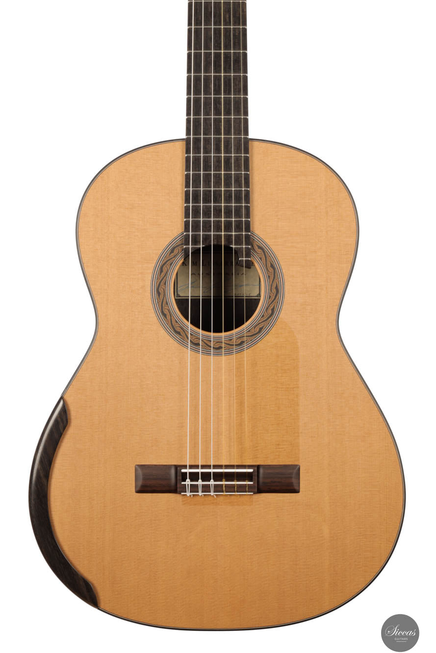 Die 2024 Kim Lissarrague Gitarre, nummeriert mit 415, zeichnet sich als wahre Kraftmaschine unter den zeitgenössischen klassischen Gitarren aus. Dieses Instrument strahlt eine ausdrucksstarke Energie aus, die es unter die Top 5 der leistungsstärksten Gitarren in seiner Kategorie platziert. Sein bemerkenswertes Klangvolumen wird durch einen reichen und flexiblen Ton ergänzt, der eine breite Palette an dynamischen Möglichkeiten bietet. Gefertigt mit einer dünnen, gitterverstärkten Zederndecke und ergänzt durch Ziricote für Rücken und Seiten, kombiniert sie kraftvolle Klangprojektion mit warmem, präzisem Klangcharakter. Diese Gitarre ist nicht nur ein Zeugnis hochwertiger Handwerkskunst, sondern auch eine vorbildliche Darstellung der innovativen Designansätze von Kim Lissarrague.