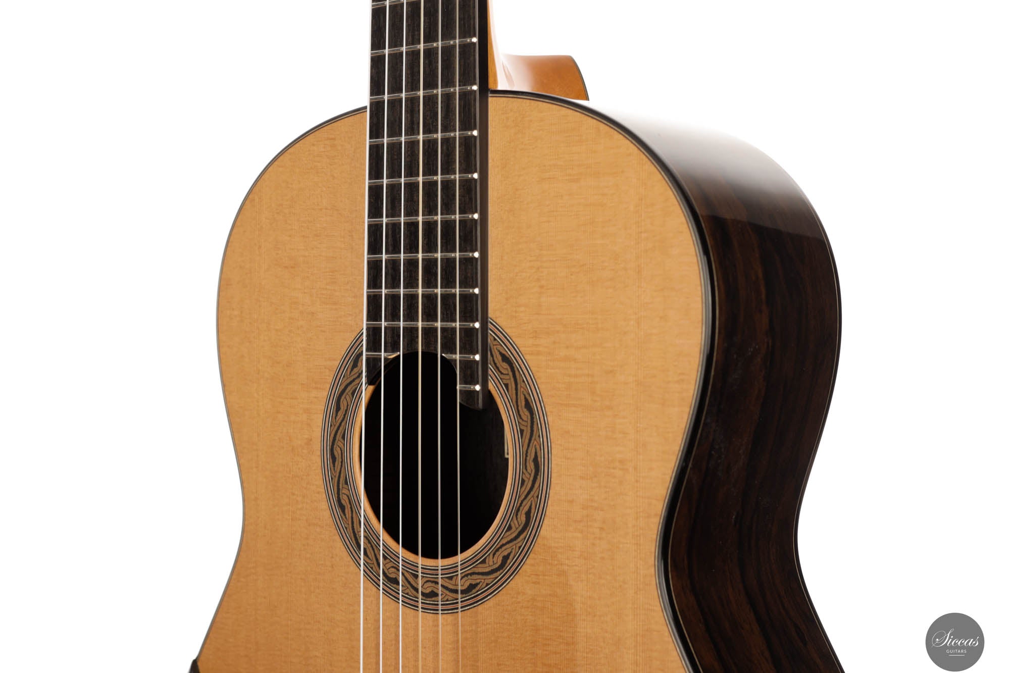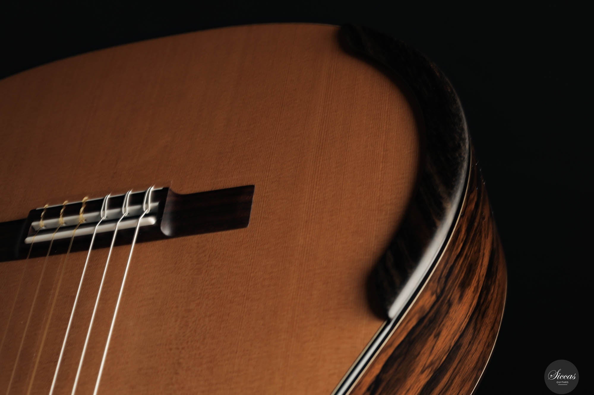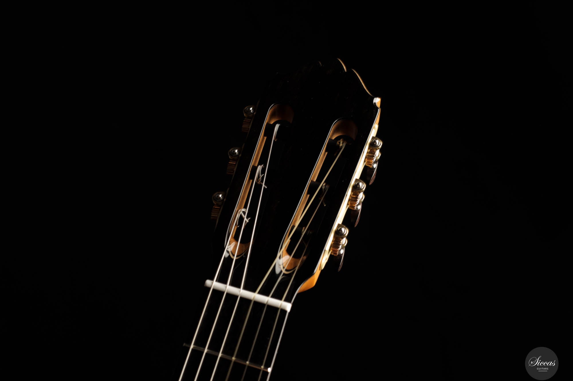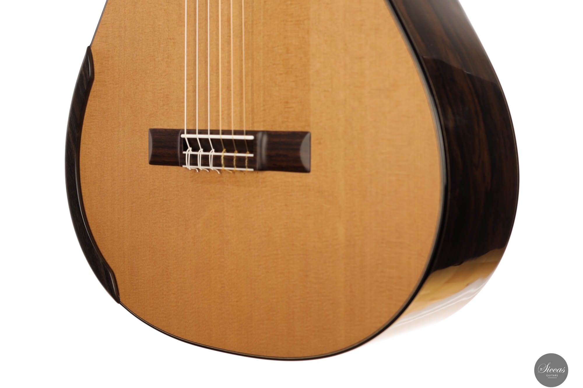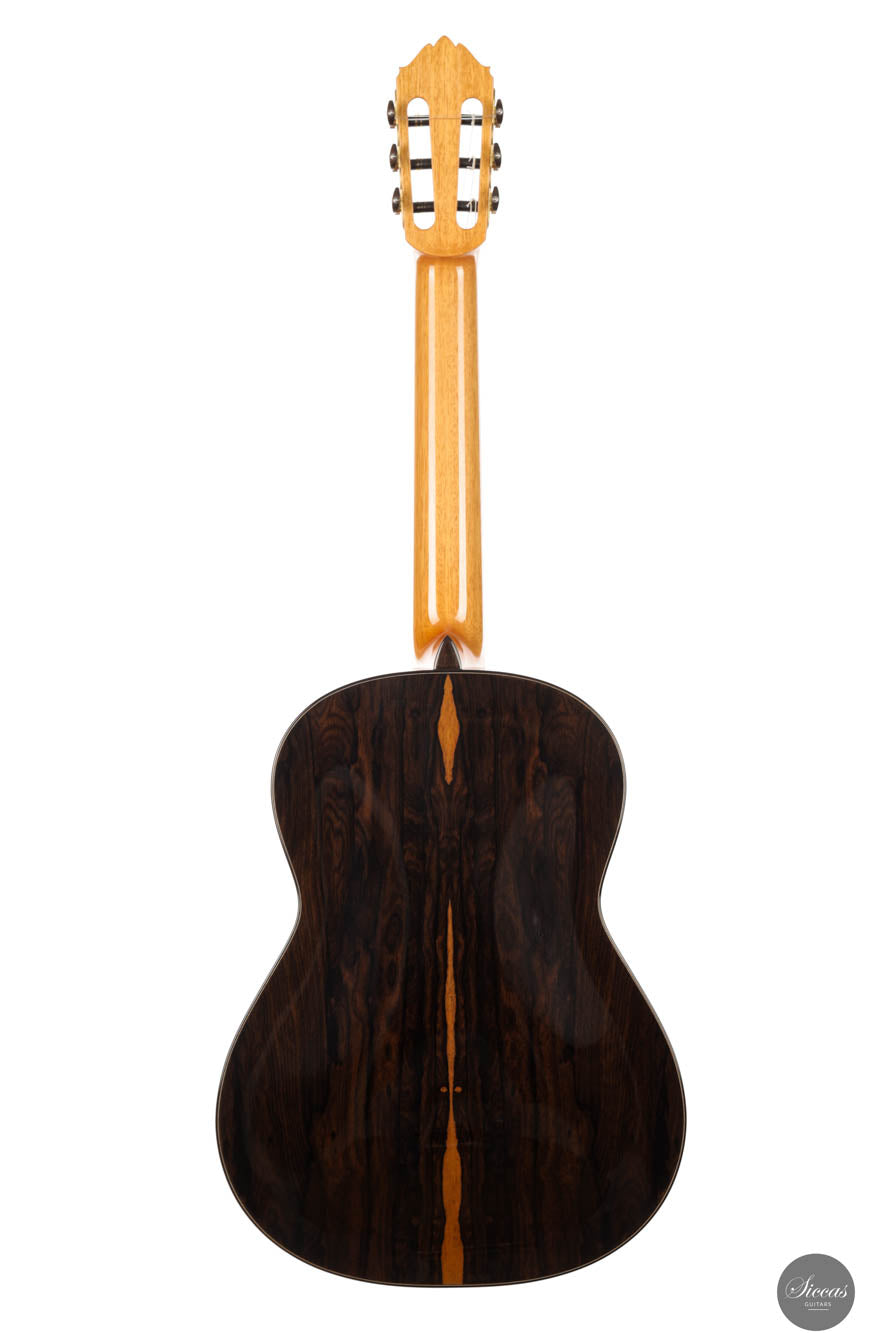 Die 2024 Kim Lissarrague Gitarre, nummeriert mit 415, zeichnet sich als wahre Kraftmaschine unter den zeitgenössischen klassischen Gitarren aus. Dieses Instrument strahlt eine ausdrucksstarke Energie aus, die es unter die Top 5 der leistungsstärksten Gitarren in seiner Kategorie platziert. Sein bemerkenswertes Klangvolumen wird durch einen reichen und flexiblen Ton ergänzt, der eine breite Palette an dynamischen Möglichkeiten bietet. Gefertigt mit einer dünnen, gitterverstärkten Zederndecke und ergänzt durch Ziricote für Rücken und Seiten, kombiniert sie kraftvolle Klangprojektion mit warmem, präzisem Klangcharakter. Diese Gitarre ist nicht nur ein Zeugnis hochwertiger Handwerkskunst, sondern auch eine vorbildliche Darstellung der innovativen Designansätze von Kim Lissarrague.