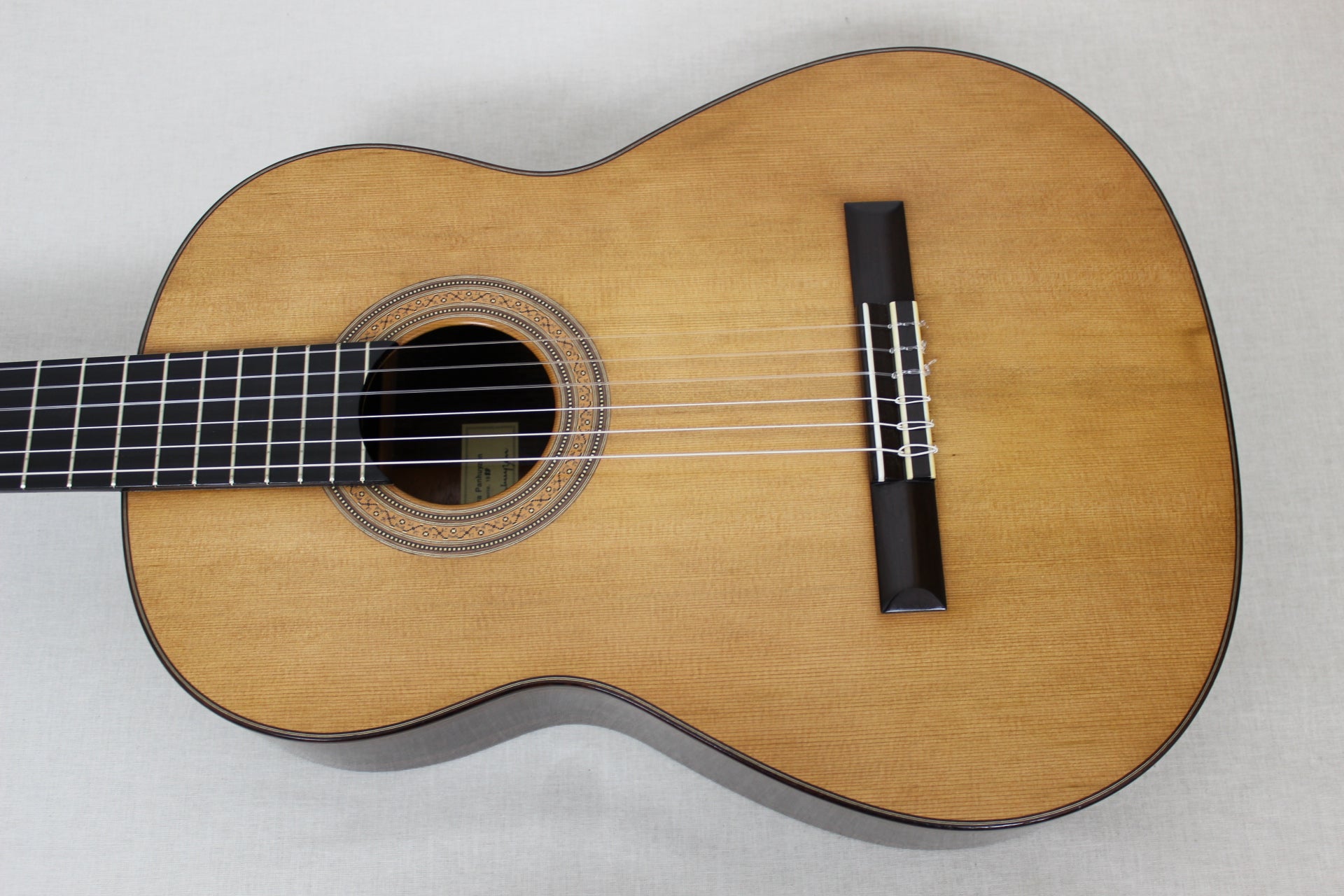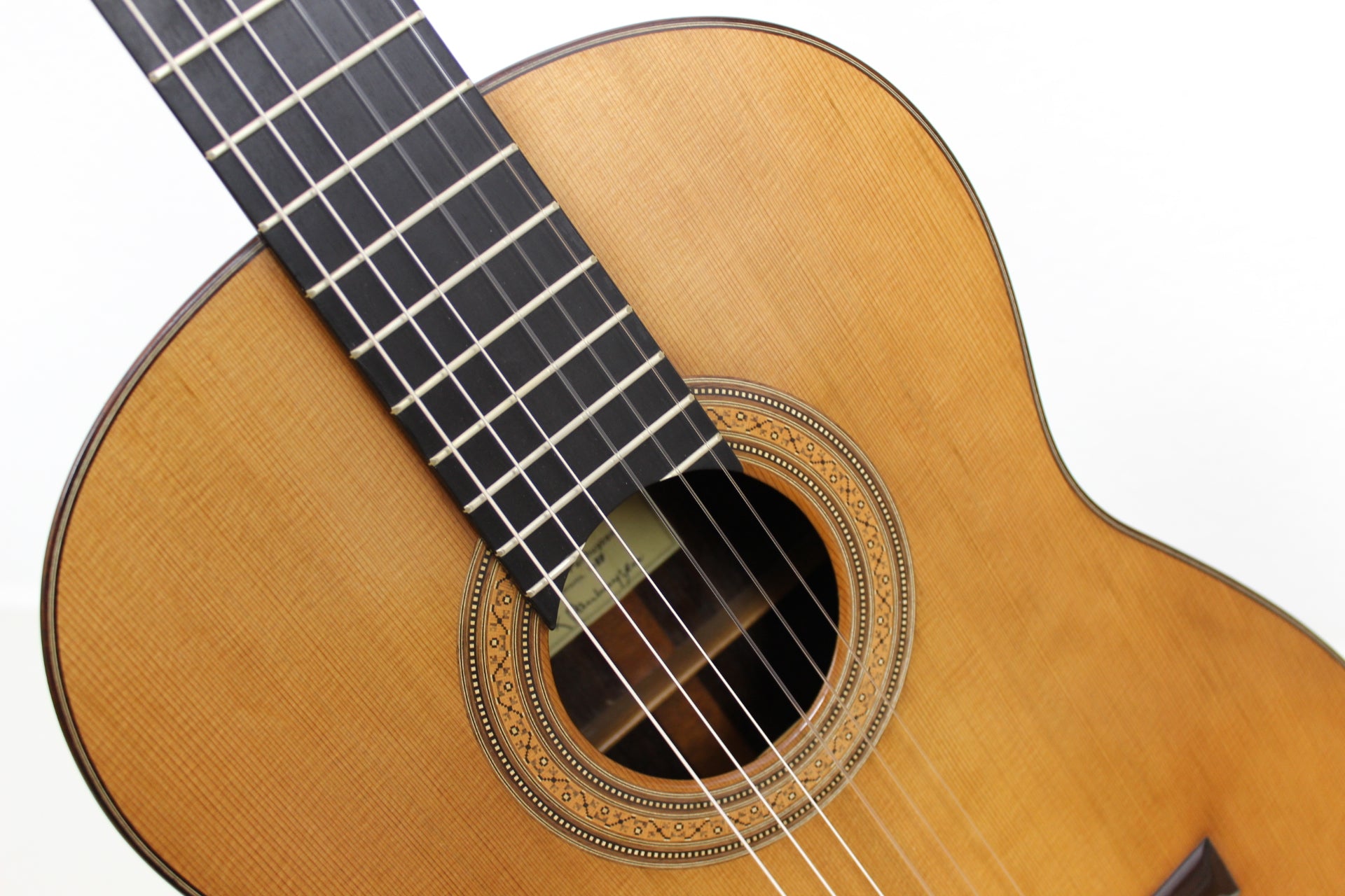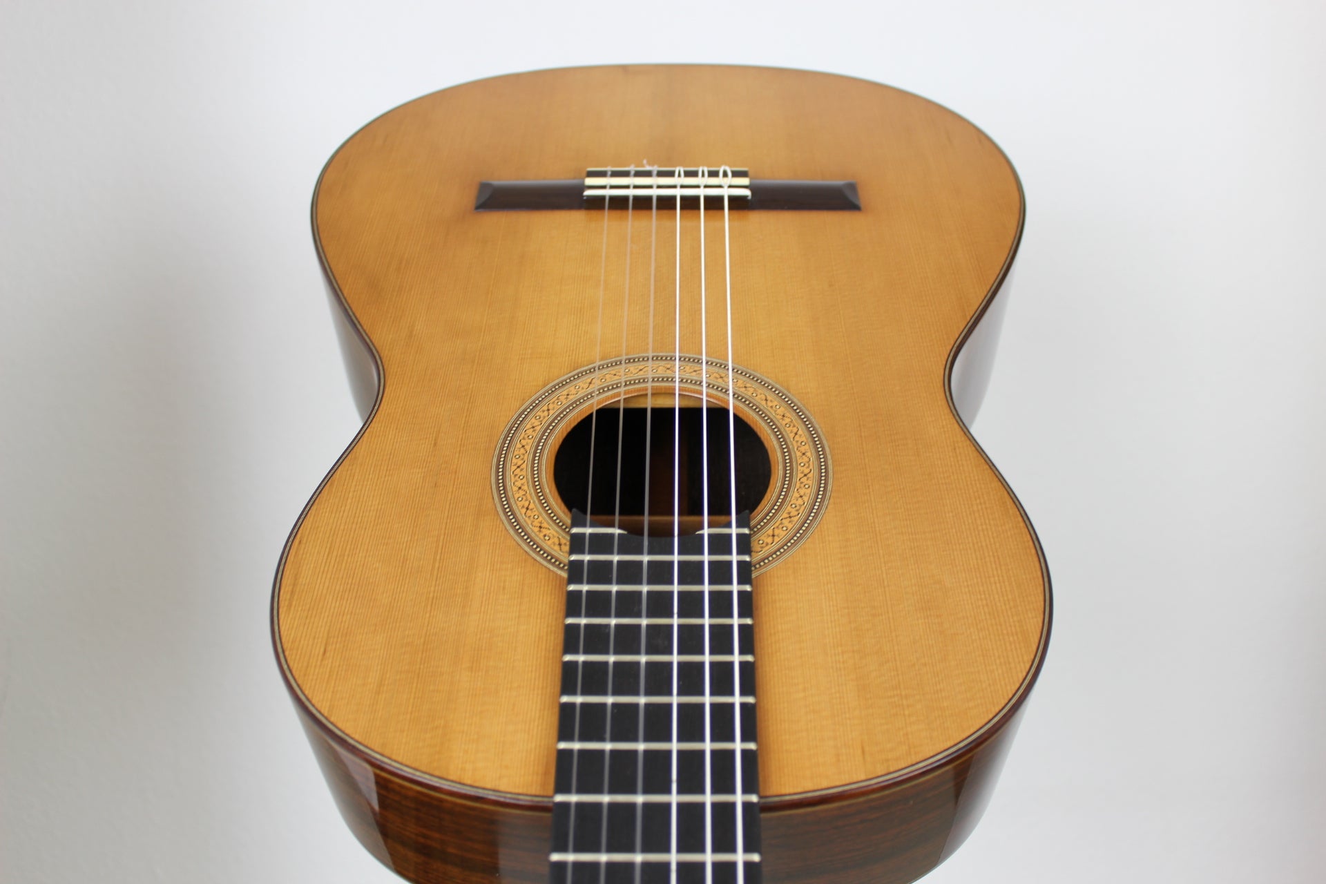 This classical guitar was built in 1988 by Kolya Panhuyzen. The two-piece cedar top of this guitar is framed by beautiful dark and light purflings. The two-piece back and the sides are made of Indian rosewood. The guitar is in very good condition and has only some minor traces on the back and the sides. The sound is typical for Panhuyzen guitars: Very balanced, superior sustain, impressive basses.