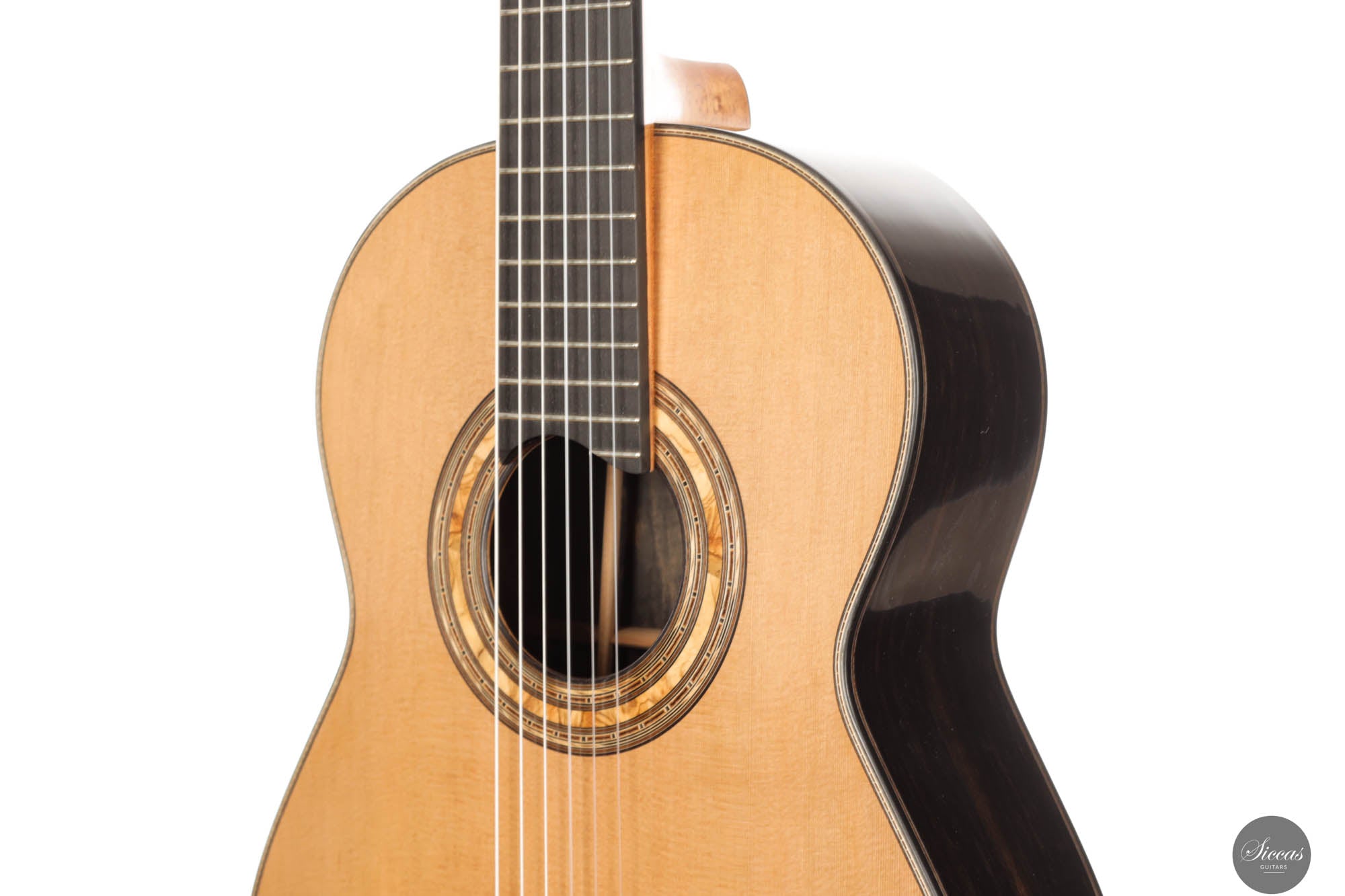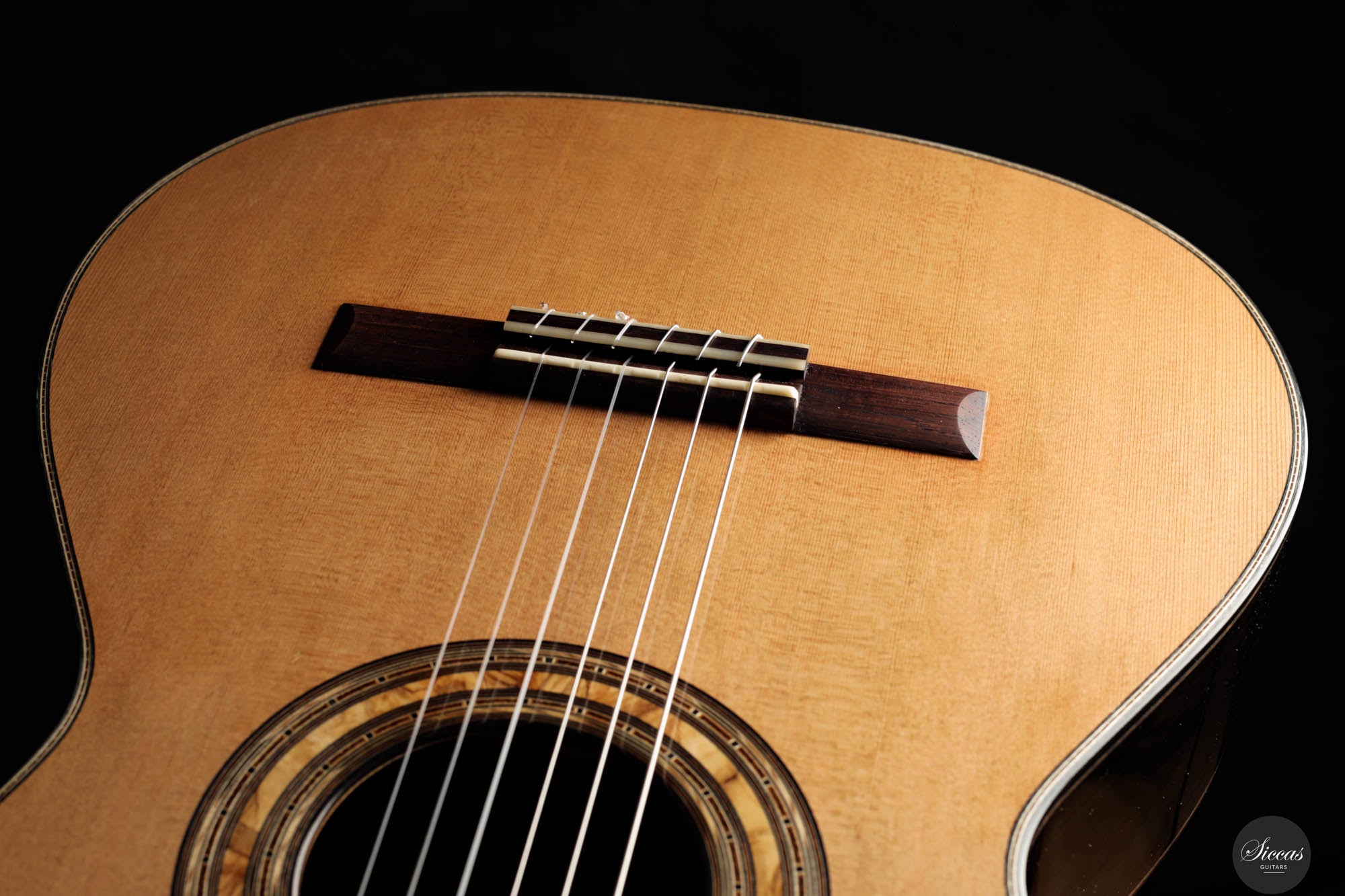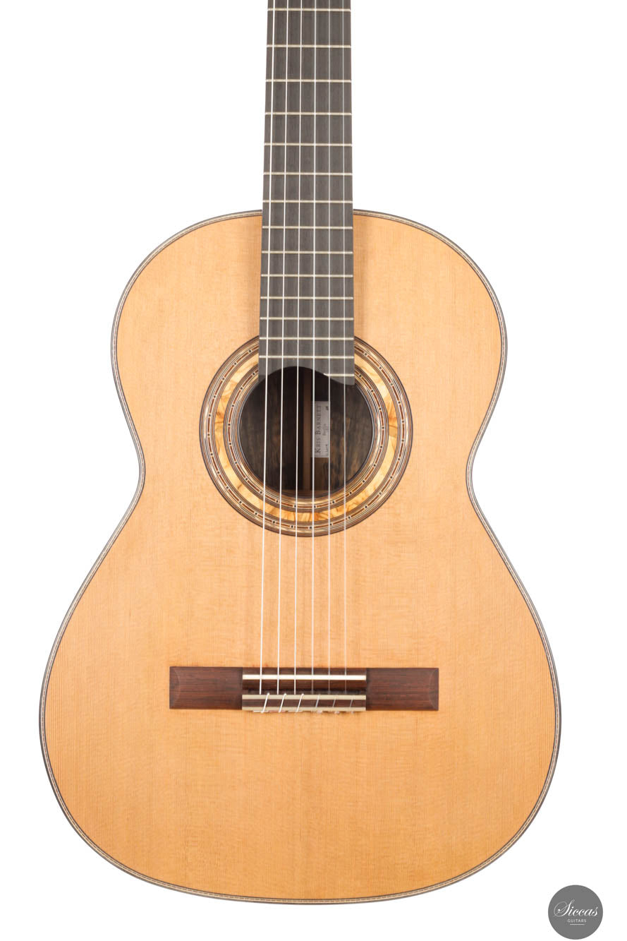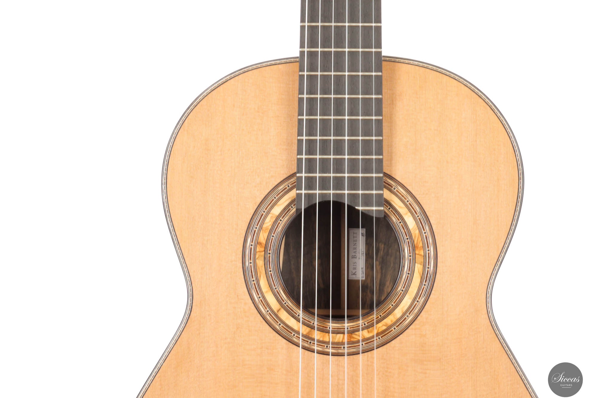 Die Gitarren von Kris Barnett verwenden ein Verstrebungssystem, das auf der Fibonacci-Sequenz basiert. Dieses Verhältnis, das in der Natur, Musik, Architektur und Kunst allgegenwärtig ist, hat Kris in den Gitarrenbau integriert, um seine Klangideale zu verwirklichen. Seine „Phi“-Verstrebung kombiniert Zeder und Fichte, was ihm große Flexibilität bei der Gestaltung von Klang und Struktur seiner Gitarren verleiht. Seine Instrumente zeichnen sich durch eine sehr gute Balance, einen süßen Klang und eine raffinierte Tonqualität aus. Diese Gitarre aus dem Jahr 2020 ist aus gut abgelagerter westlicher Rotzeder gefertigt, mit Gabun-Ebenholz für Boden und Zargen. Sie verfügt über ein Klangloch an der Seite sowie ein erhöhtes Griffbrett. Jede seiner Gitarren ist komplett handgefertigt, ohne vorgefertigte Komponenten, einschließlich handgefertigter Rosetten, Einlagen und Verzierungen. Dank ihrer großartigen Bespielbarkeit, ihres vollen Klangs und ihrer schnellen Ansprache ist diese Gitarre ein herausragendes Konzertinstrument mit einem hellen und formbaren Klang.
