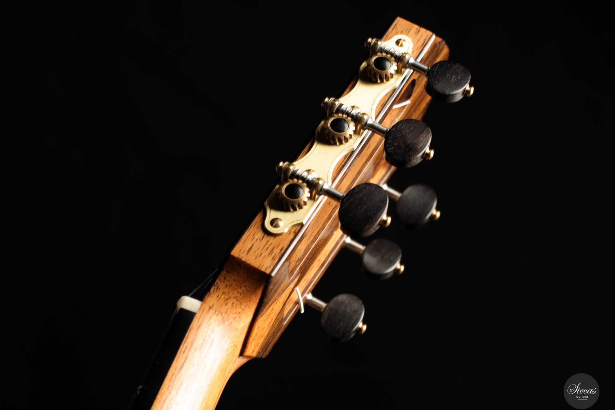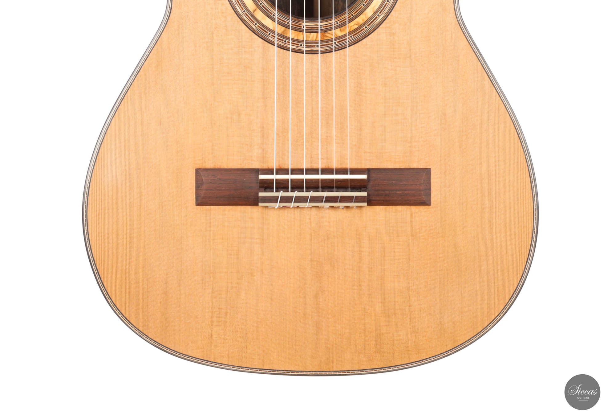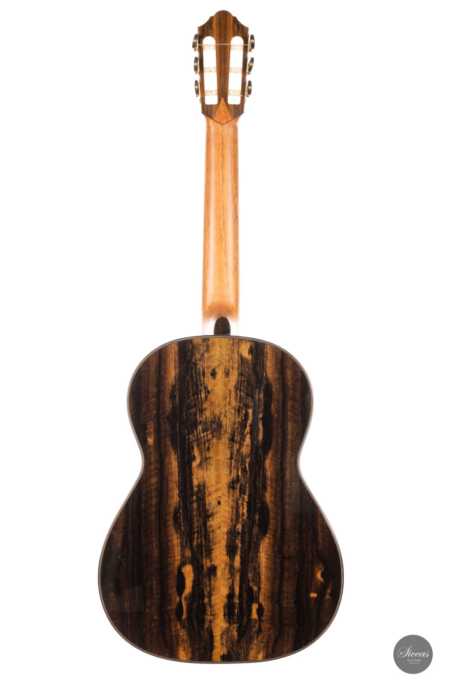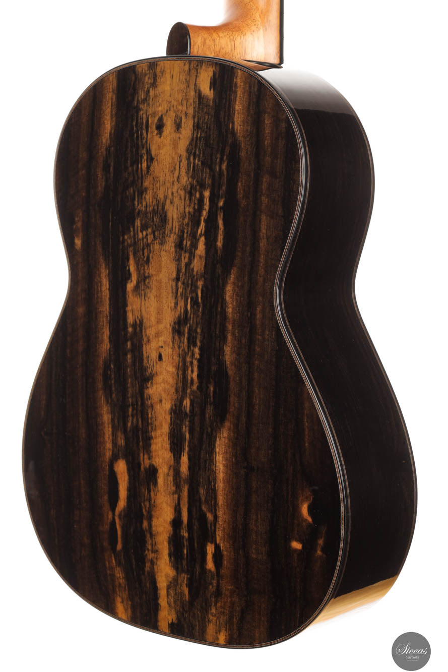 Die Gitarren von Kris Barnett verwenden ein Verstrebungssystem, das auf der Fibonacci-Sequenz basiert. Dieses Verhältnis, das in der Natur, Musik, Architektur und Kunst allgegenwärtig ist, hat Kris in den Gitarrenbau integriert, um seine Klangideale zu verwirklichen. Seine „Phi“-Verstrebung kombiniert Zeder und Fichte, was ihm große Flexibilität bei der Gestaltung von Klang und Struktur seiner Gitarren verleiht. Seine Instrumente zeichnen sich durch eine sehr gute Balance, einen süßen Klang und eine raffinierte Tonqualität aus. Diese Gitarre aus dem Jahr 2020 ist aus gut abgelagerter westlicher Rotzeder gefertigt, mit Gabun-Ebenholz für Boden und Zargen. Sie verfügt über ein Klangloch an der Seite sowie ein erhöhtes Griffbrett. Jede seiner Gitarren ist komplett handgefertigt, ohne vorgefertigte Komponenten, einschließlich handgefertigter Rosetten, Einlagen und Verzierungen. Dank ihrer großartigen Bespielbarkeit, ihres vollen Klangs und ihrer schnellen Ansprache ist diese Gitarre ein herausragendes Konzertinstrument mit einem hellen und formbaren Klang.