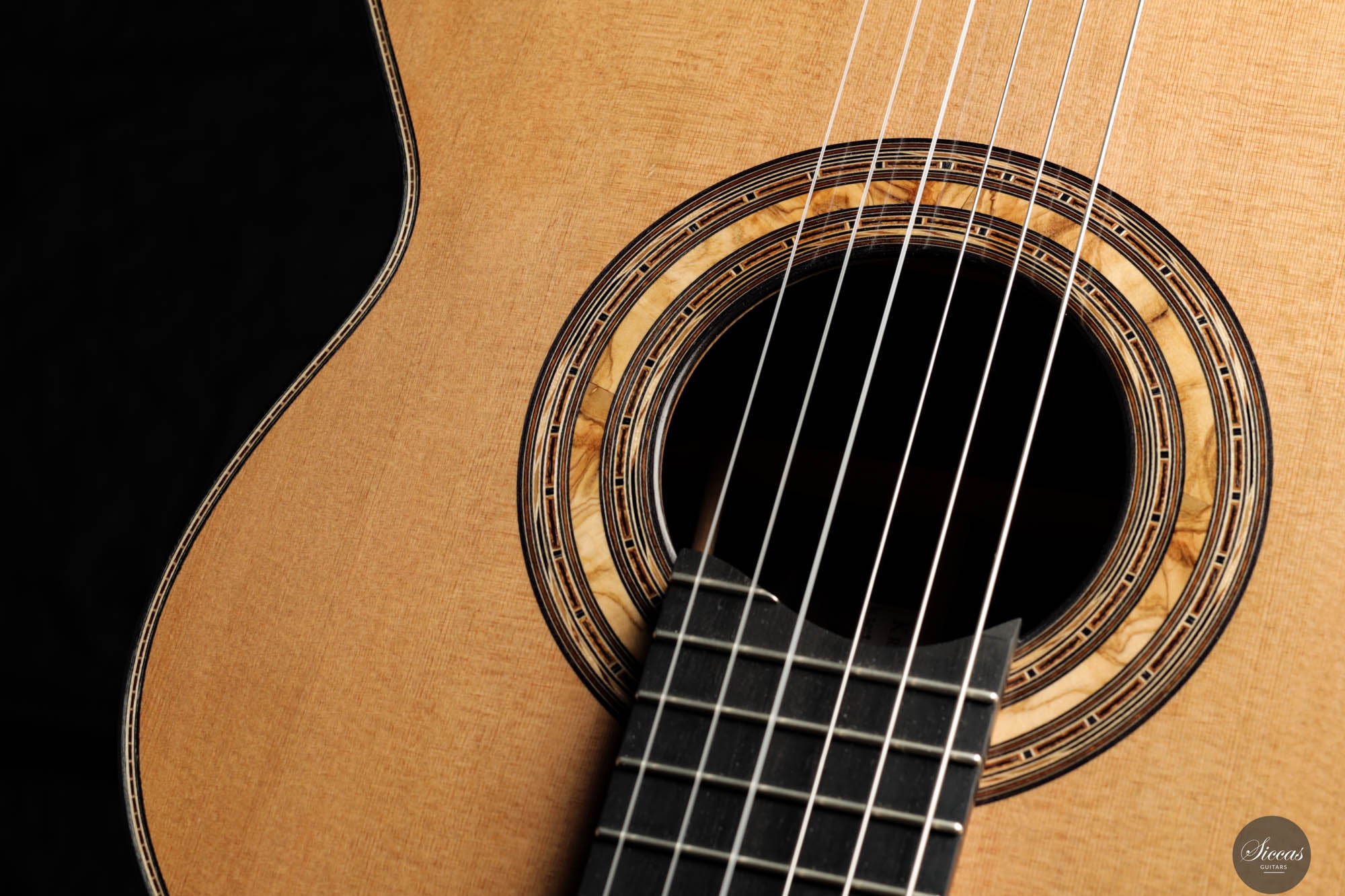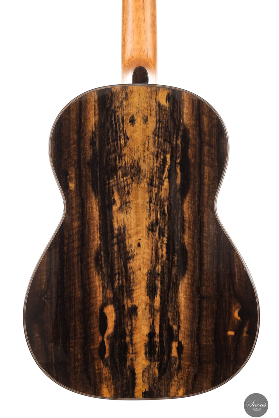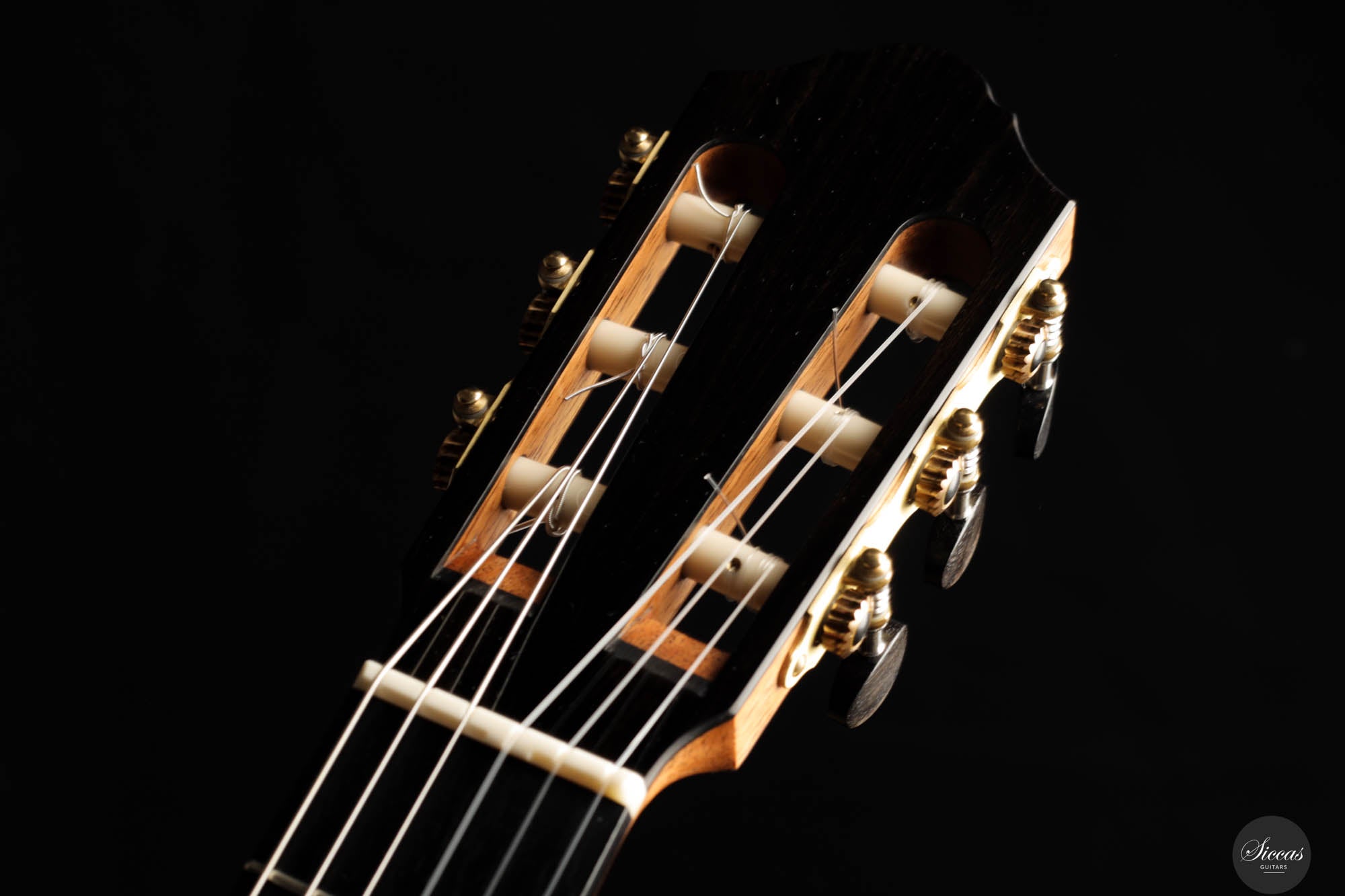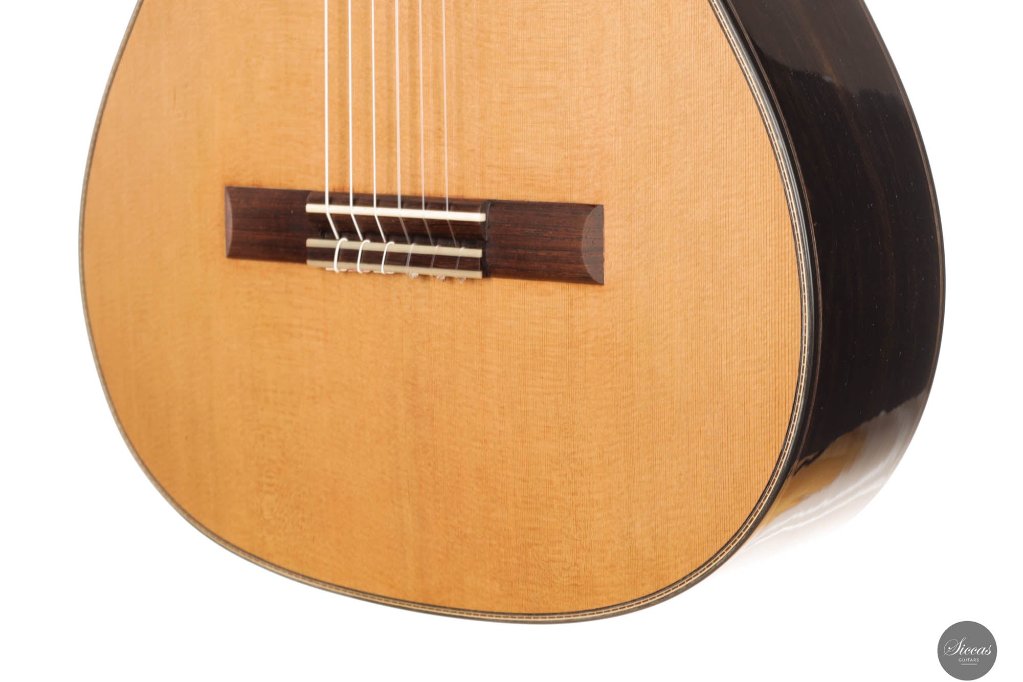 Die Gitarren von Kris Barnett verwenden ein Verstrebungssystem, das auf der Fibonacci-Sequenz basiert. Dieses Verhältnis, das in der Natur, Musik, Architektur und Kunst allgegenwärtig ist, hat Kris in den Gitarrenbau integriert, um seine Klangideale zu verwirklichen. Seine „Phi“-Verstrebung kombiniert Zeder und Fichte, was ihm große Flexibilität bei der Gestaltung von Klang und Struktur seiner Gitarren verleiht. Seine Instrumente zeichnen sich durch eine sehr gute Balance, einen süßen Klang und eine raffinierte Tonqualität aus. Diese Gitarre aus dem Jahr 2020 ist aus gut abgelagerter westlicher Rotzeder gefertigt, mit Gabun-Ebenholz für Boden und Zargen. Sie verfügt über ein Klangloch an der Seite sowie ein erhöhtes Griffbrett. Jede seiner Gitarren ist komplett handgefertigt, ohne vorgefertigte Komponenten, einschließlich handgefertigter Rosetten, Einlagen und Verzierungen. Dank ihrer großartigen Bespielbarkeit, ihres vollen Klangs und ihrer schnellen Ansprache ist diese Gitarre ein herausragendes Konzertinstrument mit einem hellen und formbaren Klang.