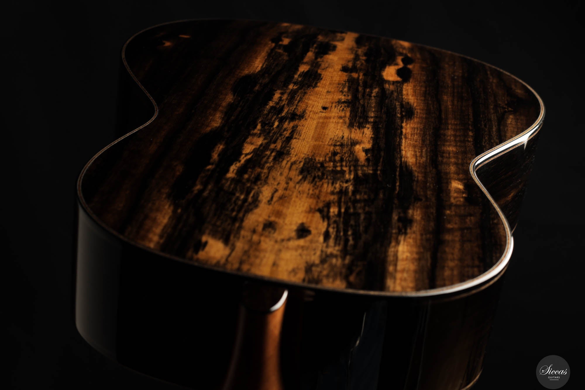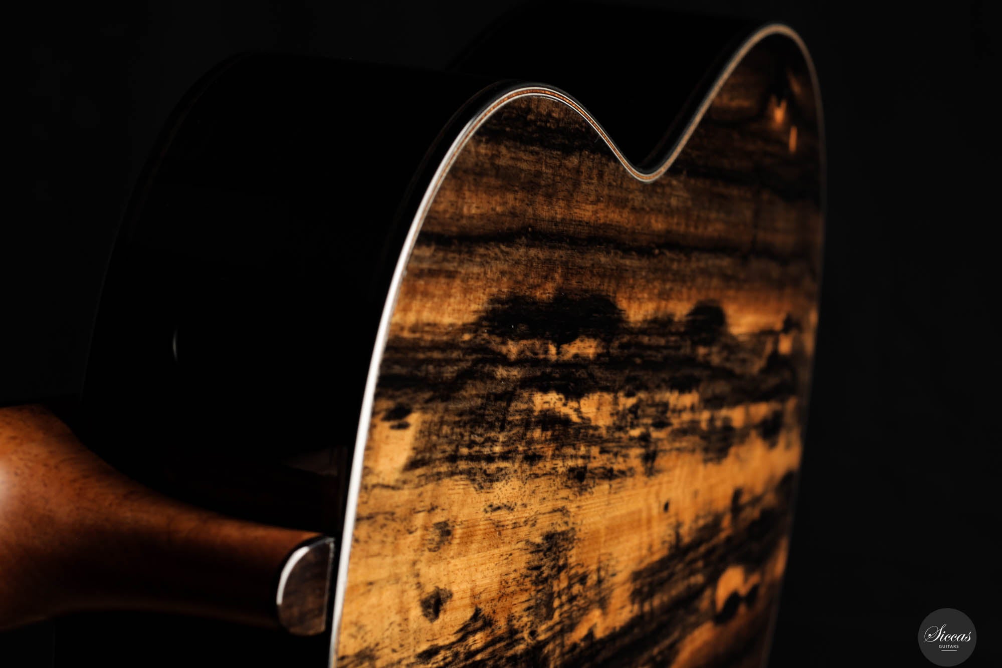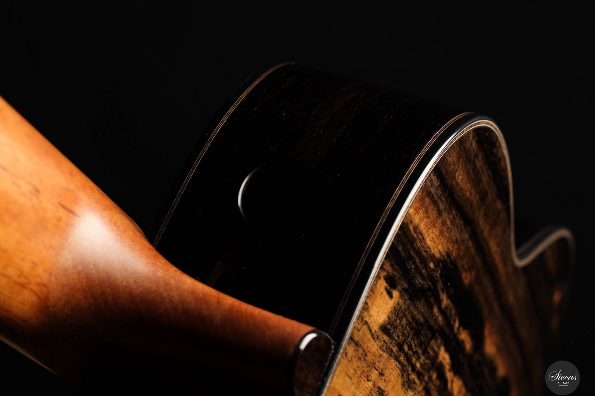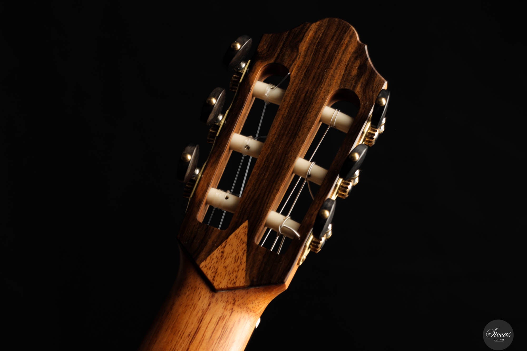 Die Gitarren von Kris Barnett verwenden ein Verstrebungssystem, das auf der Fibonacci-Sequenz basiert. Dieses Verhältnis, das in der Natur, Musik, Architektur und Kunst allgegenwärtig ist, hat Kris in den Gitarrenbau integriert, um seine Klangideale zu verwirklichen. Seine „Phi“-Verstrebung kombiniert Zeder und Fichte, was ihm große Flexibilität bei der Gestaltung von Klang und Struktur seiner Gitarren verleiht. Seine Instrumente zeichnen sich durch eine sehr gute Balance, einen süßen Klang und eine raffinierte Tonqualität aus. Diese Gitarre aus dem Jahr 2020 ist aus gut abgelagerter westlicher Rotzeder gefertigt, mit Gabun-Ebenholz für Boden und Zargen. Sie verfügt über ein Klangloch an der Seite sowie ein erhöhtes Griffbrett. Jede seiner Gitarren ist komplett handgefertigt, ohne vorgefertigte Komponenten, einschließlich handgefertigter Rosetten, Einlagen und Verzierungen. Dank ihrer großartigen Bespielbarkeit, ihres vollen Klangs und ihrer schnellen Ansprache ist diese Gitarre ein herausragendes Konzertinstrument mit einem hellen und formbaren Klang.
