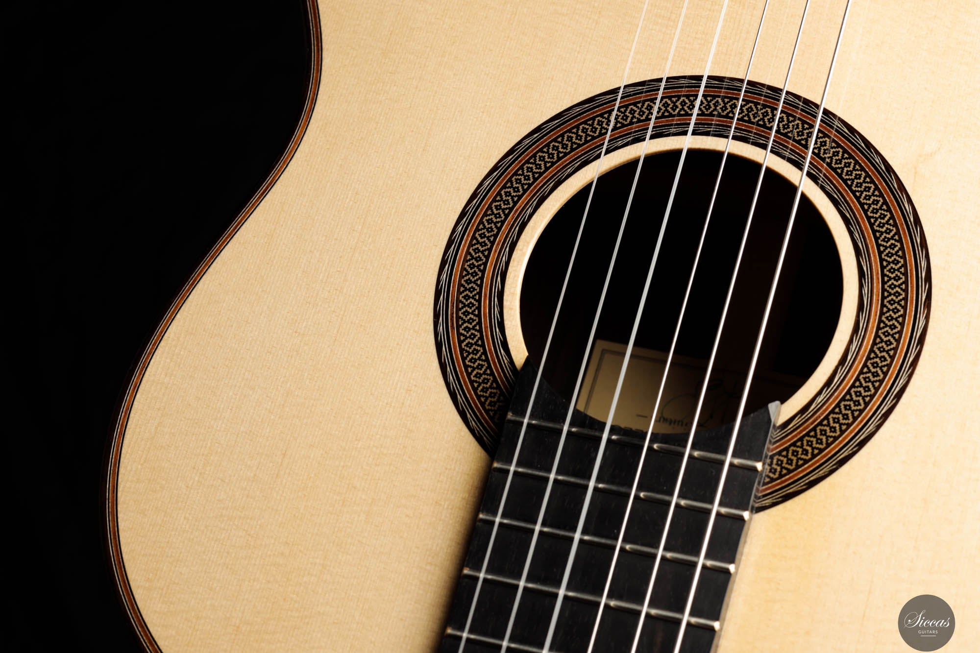 Aus dem Atelier des angesehenen Gitarrenbauers Kristof Meeus kommt das Konzertmodell 2024, eine meisterhafte Mischung aus klassischem Handwerk und moderner Innovation. Dieses Instrument verfügt über ein innovatives Gitter-Bracing-Muster aus Fichte, das an jeder Verbindung mit Zedereinlagen verstärkt ist, was der Struktur sowohl Stärke als auch Flexibilität verleiht. Optisch beeindruckend, präsentiert die Gitarre eine kunstvoll gestaltete Rosette, die von dem ästhetischen Stil des berühmten Enrique Garcia inspiriert ist und jeden Betrachter in ihren Bann zieht. Klanglich überzeugt die Gitarre mit einem reichen, samtigen Timbre, das sofort aus der reaktionsfreudigen Decke hervortritt und Tiefe und Raffinesse in ihrer akustischen Ausgabe bietet. Mit Leidenschaft und akribischer Liebe zum Detail gefertigt, ist diese Gitarre nicht nur hergestellt, sondern leidenschaftlich erschaffen worden, was sie zu einem Schatz für erfahrene Virtuosen und jene macht, die exquisite musikalische Kunstfertigkeit zu schätzen wissen. Sie verspricht eine tiefgreifende Reise der musikalischen Erkundung und Entdeckung.