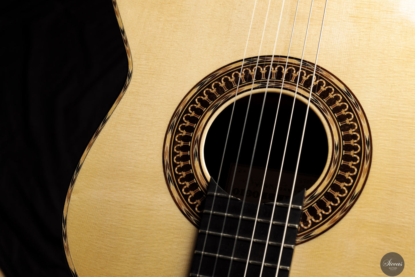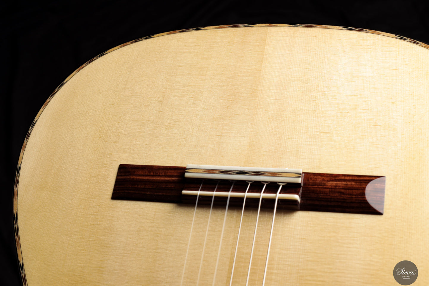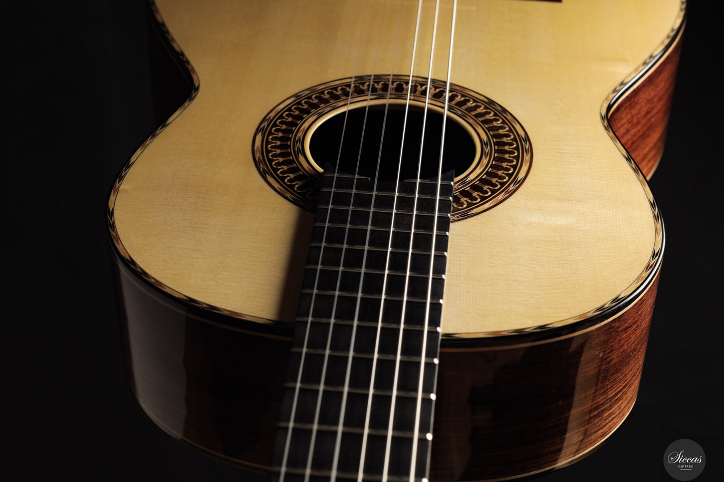 Optisch ist dies die bislang aufwendigste Gitarre, die Luca gebaut hat. Sie ist mit der charakteristischen Kolonnaden-Rosette nach Romanillos versehen und weist eine auffällige Fischgrät-Einlegearbeit aus Ebenholz, Walnuss, Zypresse, Ahorn und Palisander auf, die entlang der Ränder von Decke und Boden sowie an Kopfplatte und Steg verläuft. Diese feinen Dekorationselemente fügen sich nahtlos in die klaren und eleganten Linien des Instruments ein und halten eine ausgewogene Verbindung zwischen Funktionalität und Ästhetik.