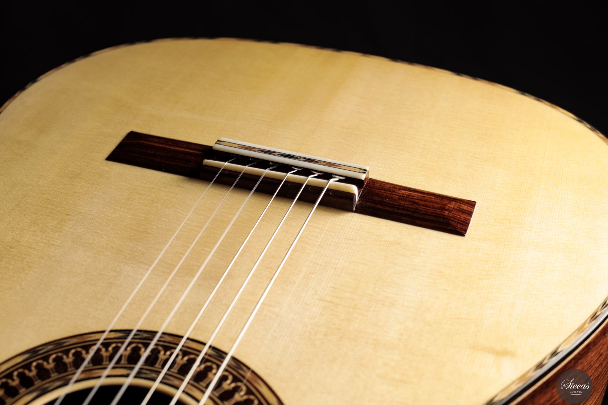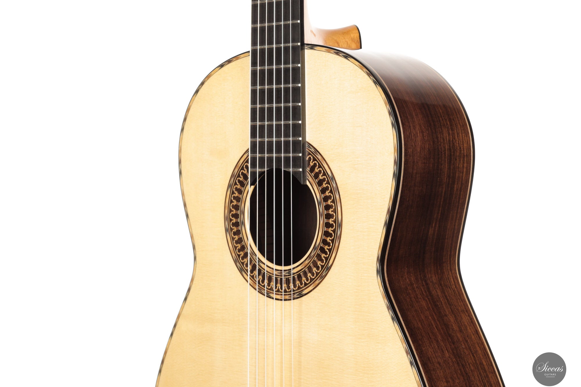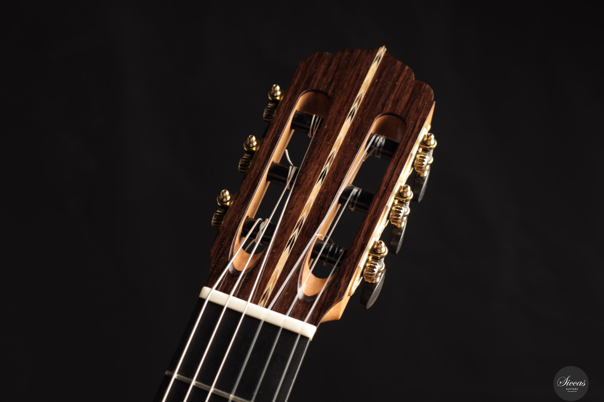 Optisch ist dies die bislang aufwendigste Gitarre, die Luca gebaut hat. Sie ist mit der charakteristischen Kolonnaden-Rosette nach Romanillos versehen und weist eine auffällige Fischgrät-Einlegearbeit aus Ebenholz, Walnuss, Zypresse, Ahorn und Palisander auf, die entlang der Ränder von Decke und Boden sowie an Kopfplatte und Steg verläuft. Diese feinen Dekorationselemente fügen sich nahtlos in die klaren und eleganten Linien des Instruments ein und halten eine ausgewogene Verbindung zwischen Funktionalität und Ästhetik.