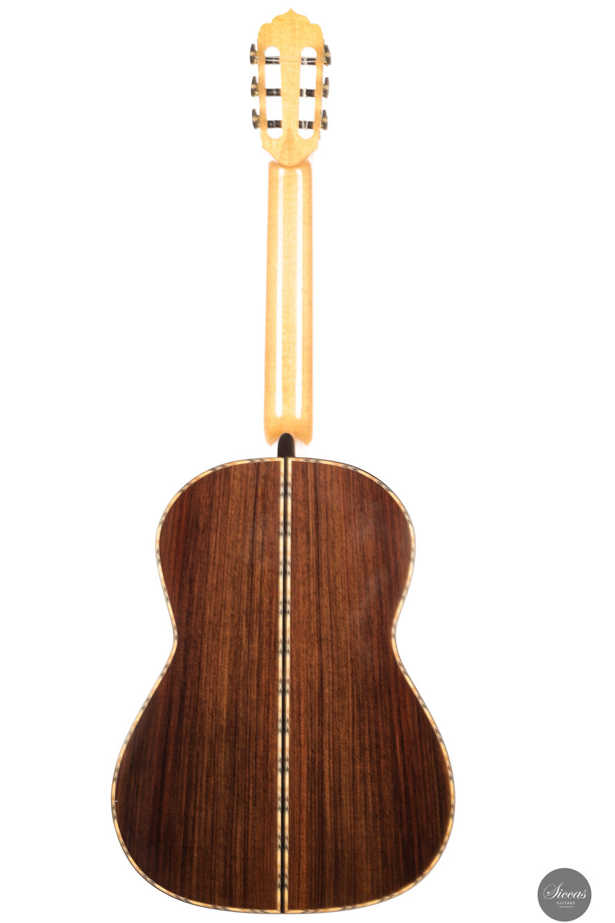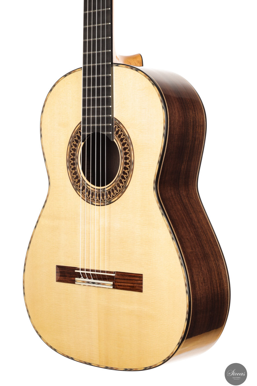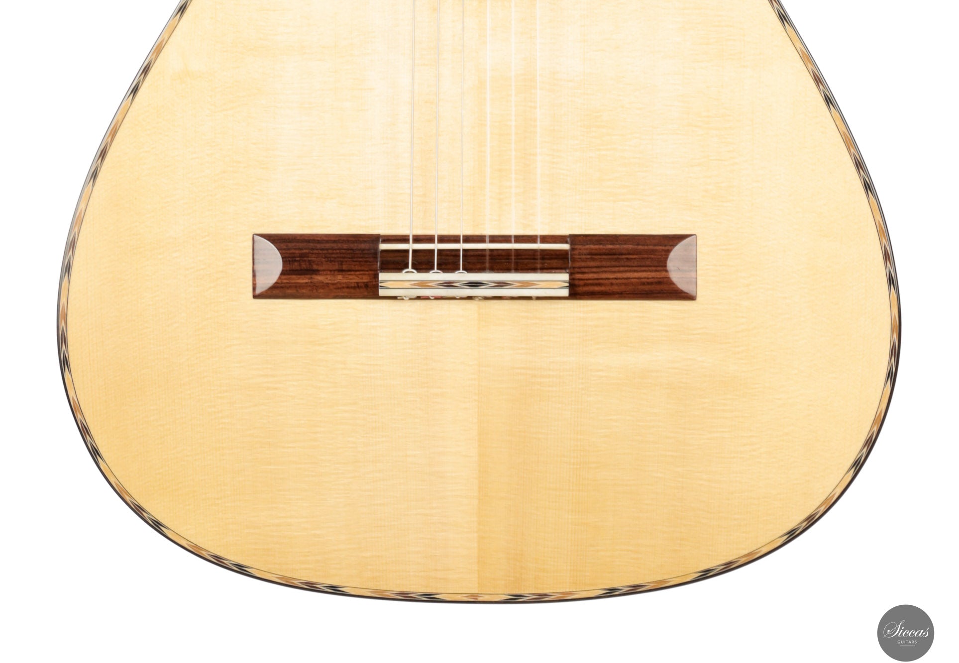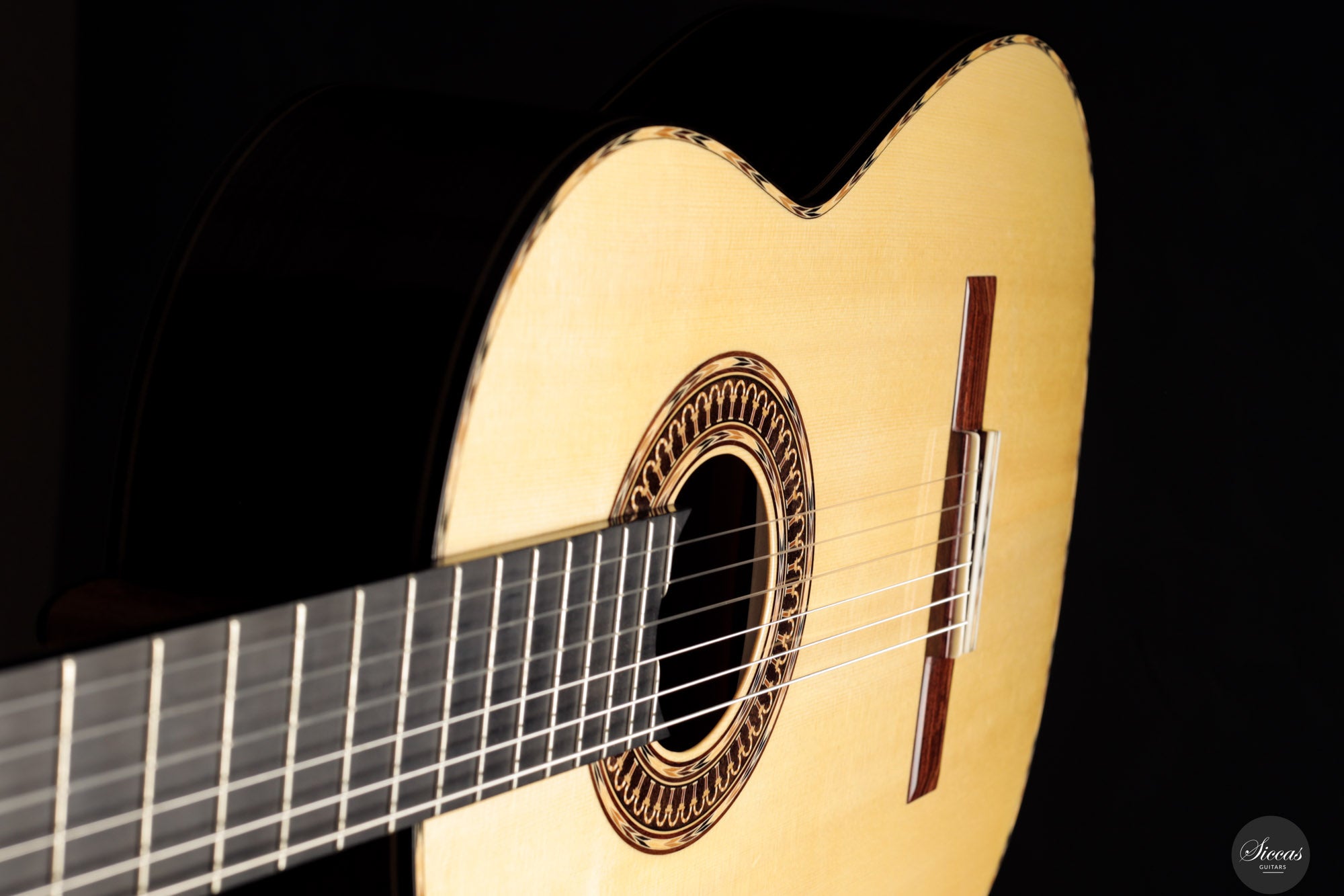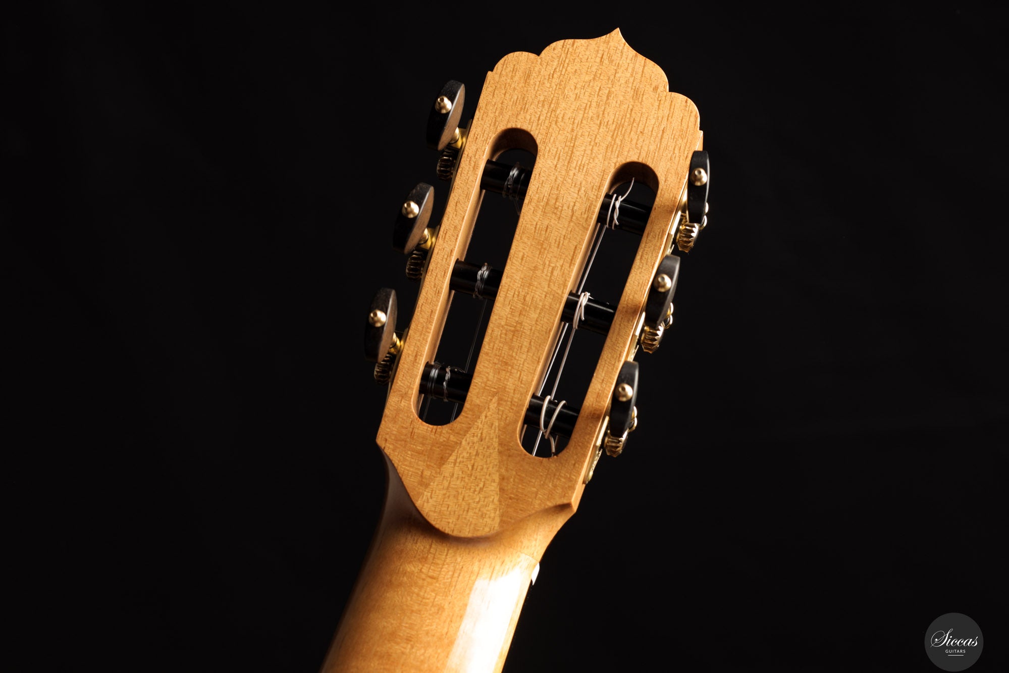 Klanglich bietet die Gitarre ein warmes, süßes Profil mit einem besonders tragfähigen Bassfundament und vollen, gesanglichen Höhen. Die Saiten schwingen mit langem Sustain und sprechen schon auf geringste Impulse direkt an, wodurch eine unmittelbare Rückmeldung und musikalische Klarheit entsteht. Die innere Struktur unterstützt ein breites Spektrum an Obertönen und verleiht dem Instrument eine große Ausdruckstiefe. Ganz im Geiste der spanischen Tradition konzipiert, verbindet dieses Modell Reaktionsfreude mit klanglicher Eleganz und entfaltet eine feine, ausgereifte Stimme, sowohl für den Konzertsaal als auch für intime Spielmomente.