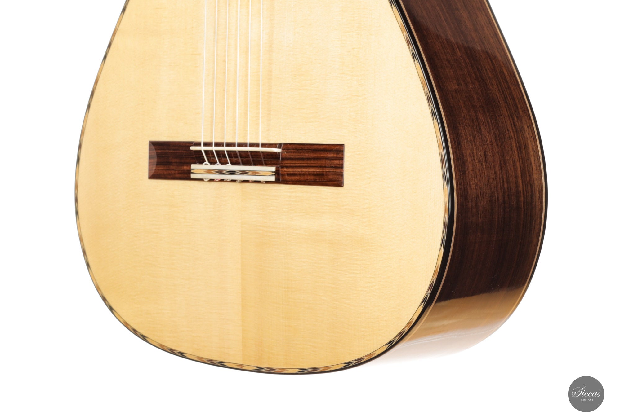 Diese Romanillos Modell Nr. 9 aus dem Jahr 2025 markiert einen bedeutenden Schritt in der künstlerischen und technischen Entwicklung von Luca Santambrogio. Die Gitarre verfügt über eine hochwertige italienische Fichtendecke aus dem Val di Fiemme sowie über einen wunderschön gemaserten Satz indischen Palisanders für Boden und Zargen. Der Hals besteht aus viertelgesägtem spanischem Zedernholz und ist mit einem traditionellen V-Falz mit der Kopfplatte verbunden. Griffbrett aus Ebenholz und Steg aus Madagascar-Palisander sorgen für strukturelle Stabilität und visuelle Harmonie.