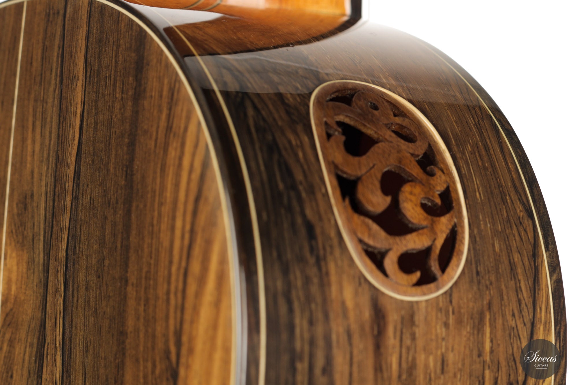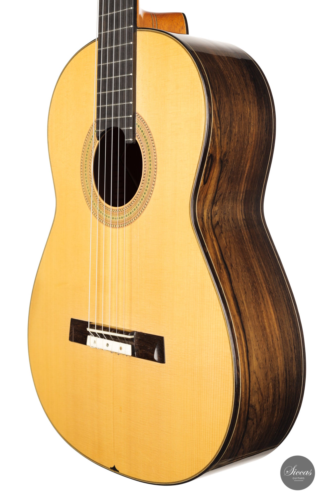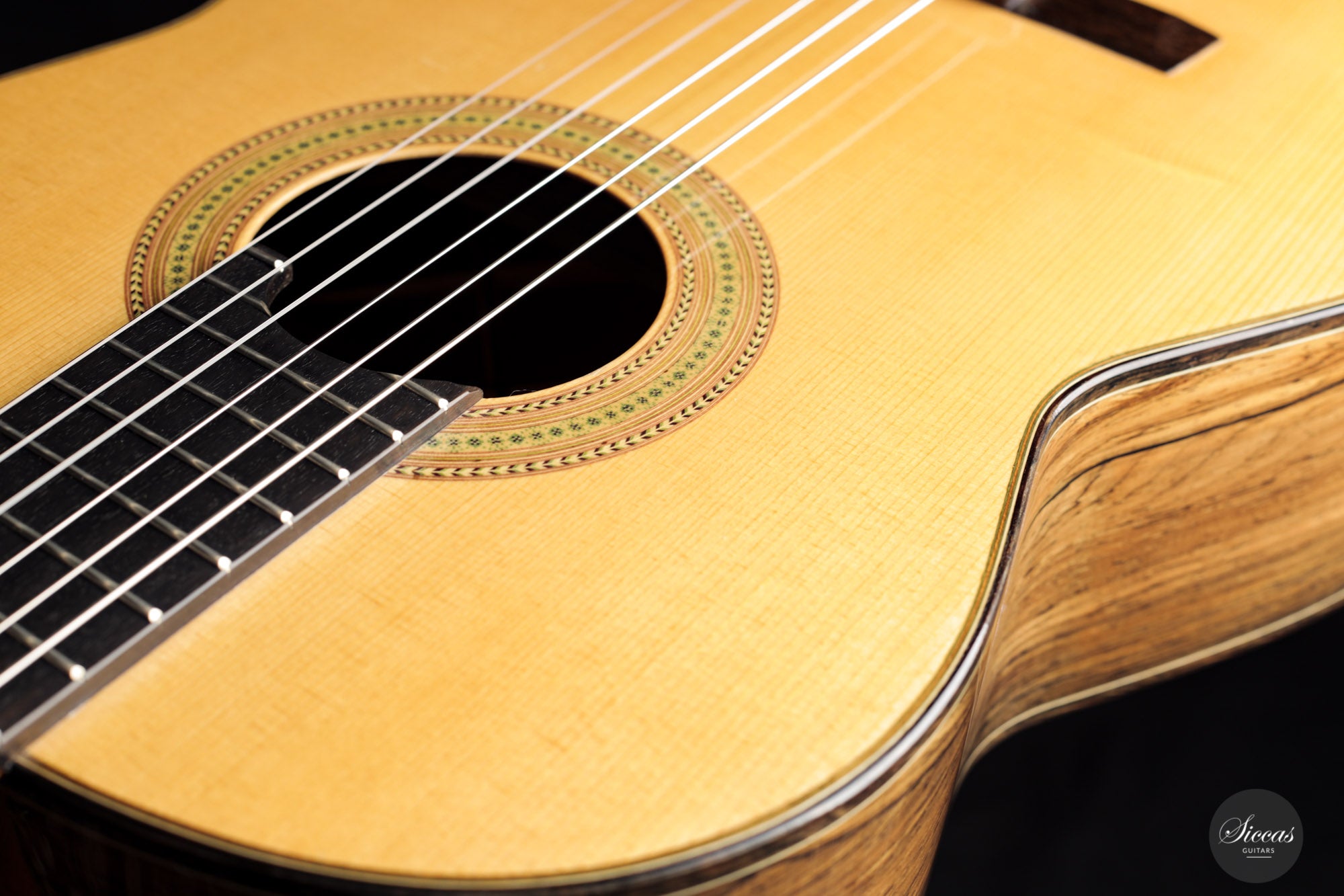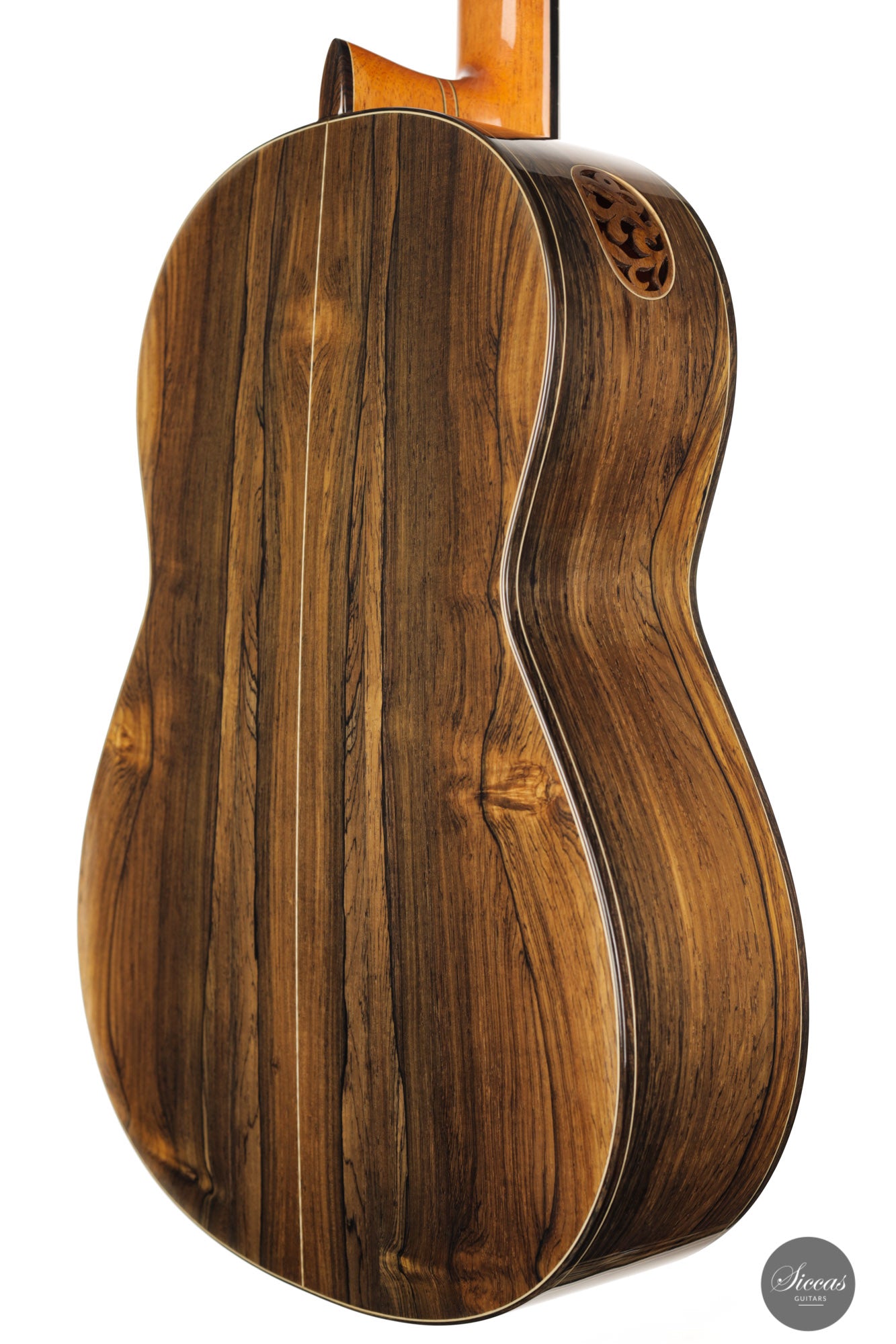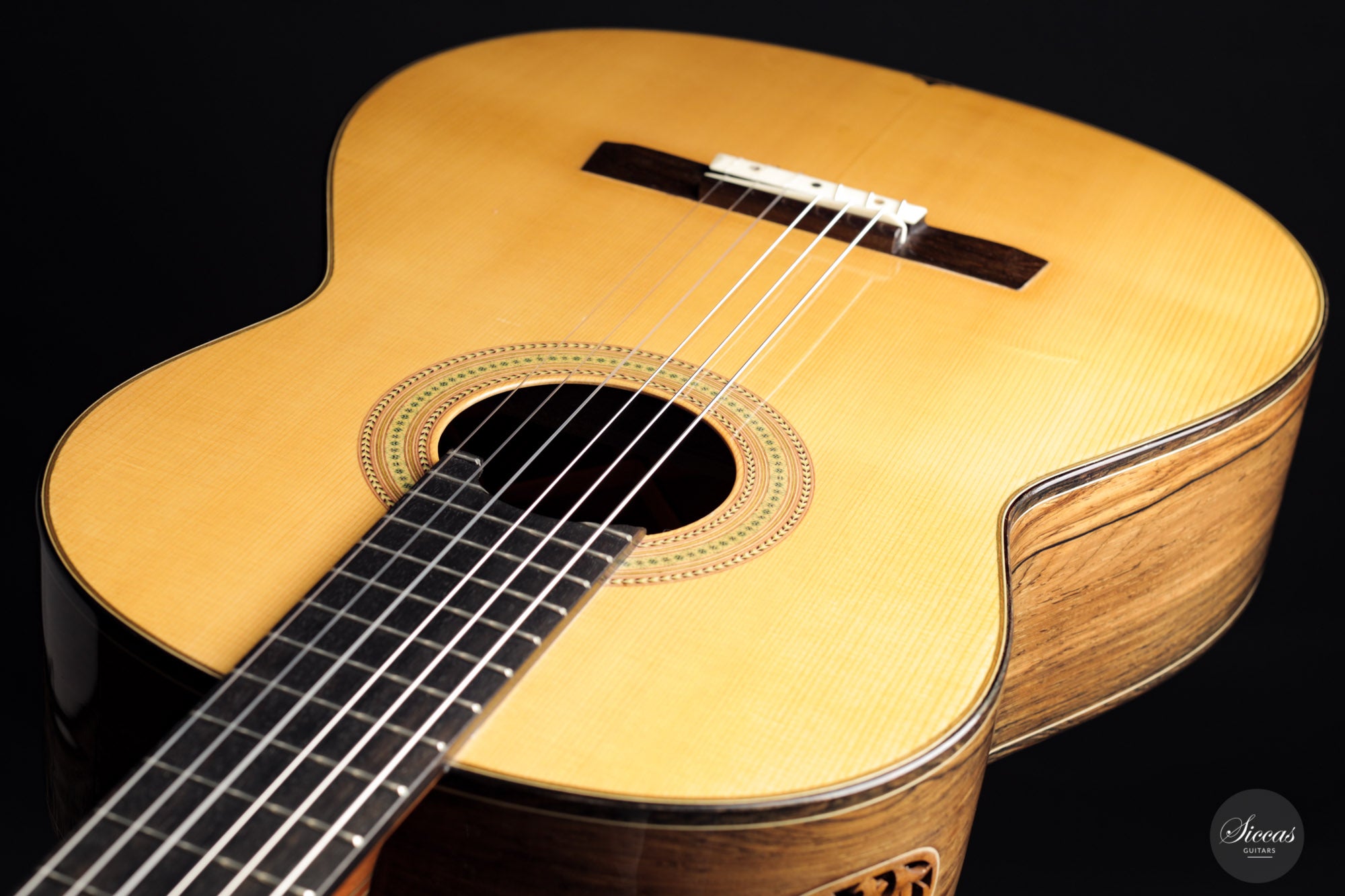 This guitar, built in 2012, is Luciano's sought-after Antares model. This modern guitar displays an abundance of exciting modern features such as a lattice braced spruce soundboard, a lattice braced double back, double sides, and a hand-carved soundport. The quality of the woods is also outstanding, with highly figured Ziricote and excellent spruce. Finally, this guitar impresses with its openness and wide dynamic range. Deep basses, a very resonant body, and rich harmonics also characterize the tonal qualities of this guitar.