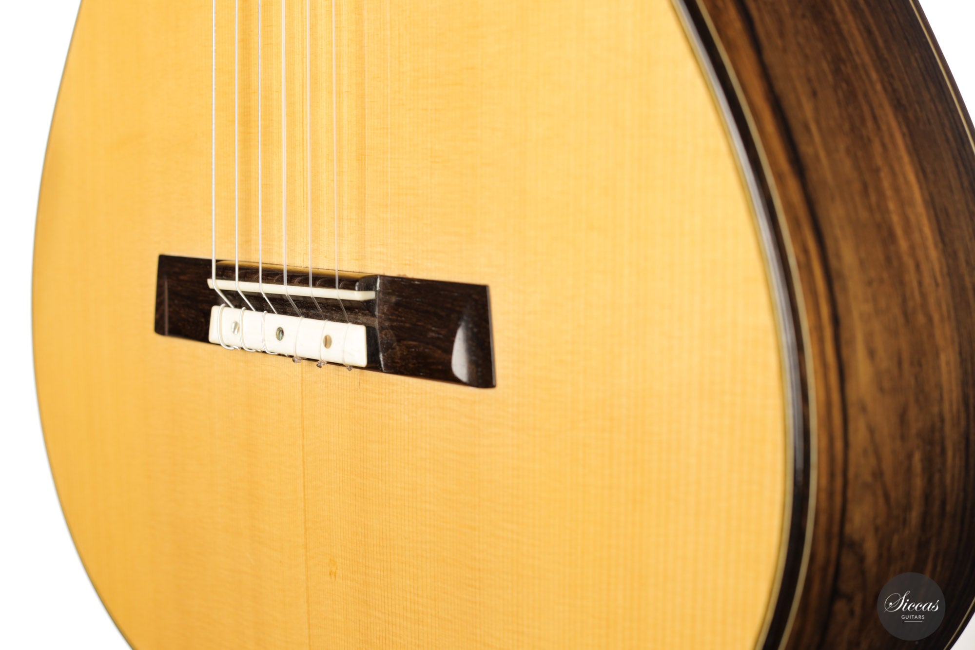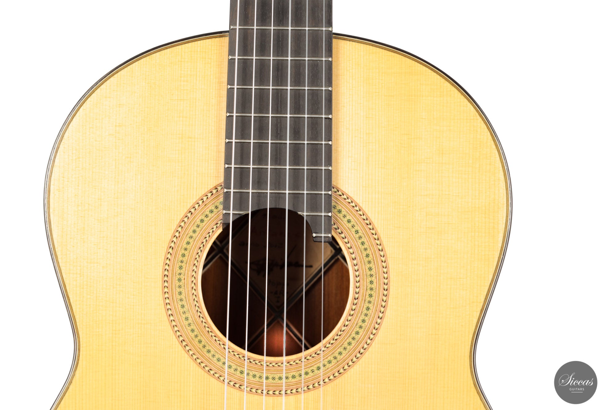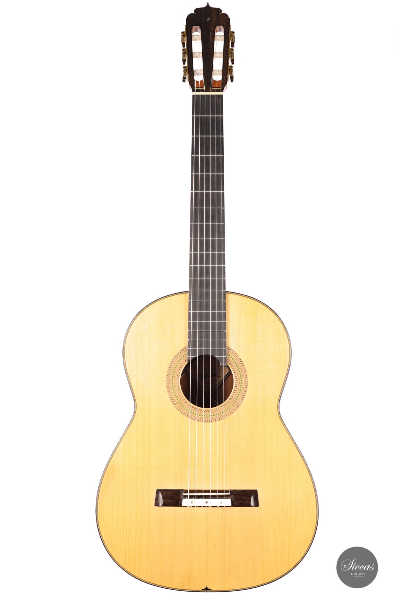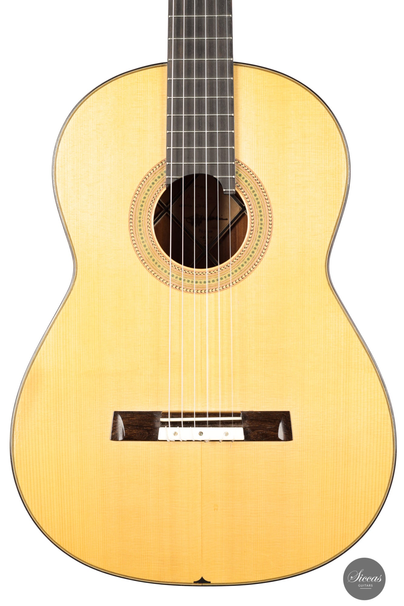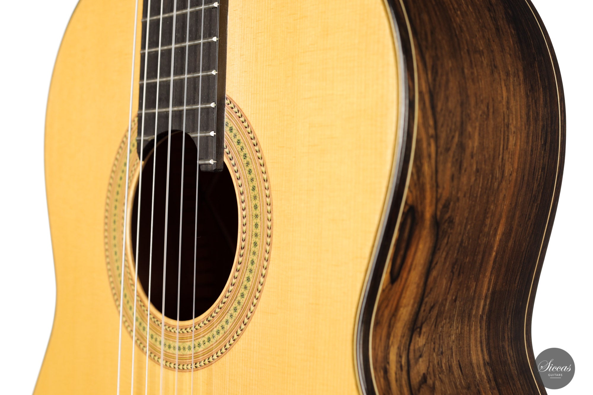 This guitar, built in 2012, is Luciano's sought-after Antares model. This modern guitar displays an abundance of exciting modern features such as a lattice braced spruce soundboard, a lattice braced double back, double sides, and a hand-carved soundport. The quality of the woods is also outstanding, with highly figured Ziricote and excellent spruce. Finally, this guitar impresses with its openness and wide dynamic range. Deep basses, a very resonant body, and rich harmonics also characterize the tonal qualities of this guitar.