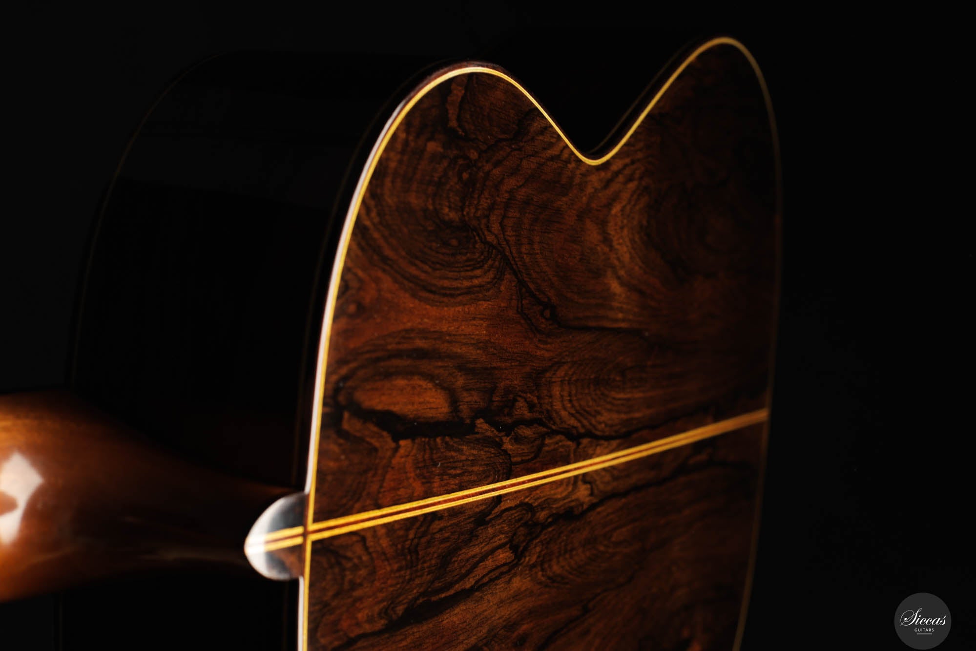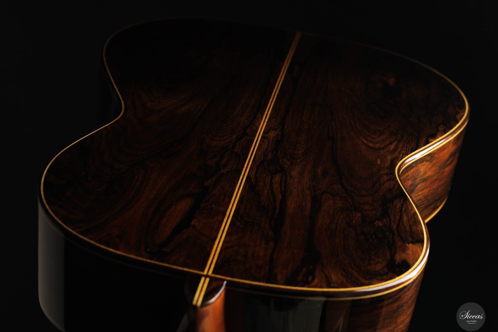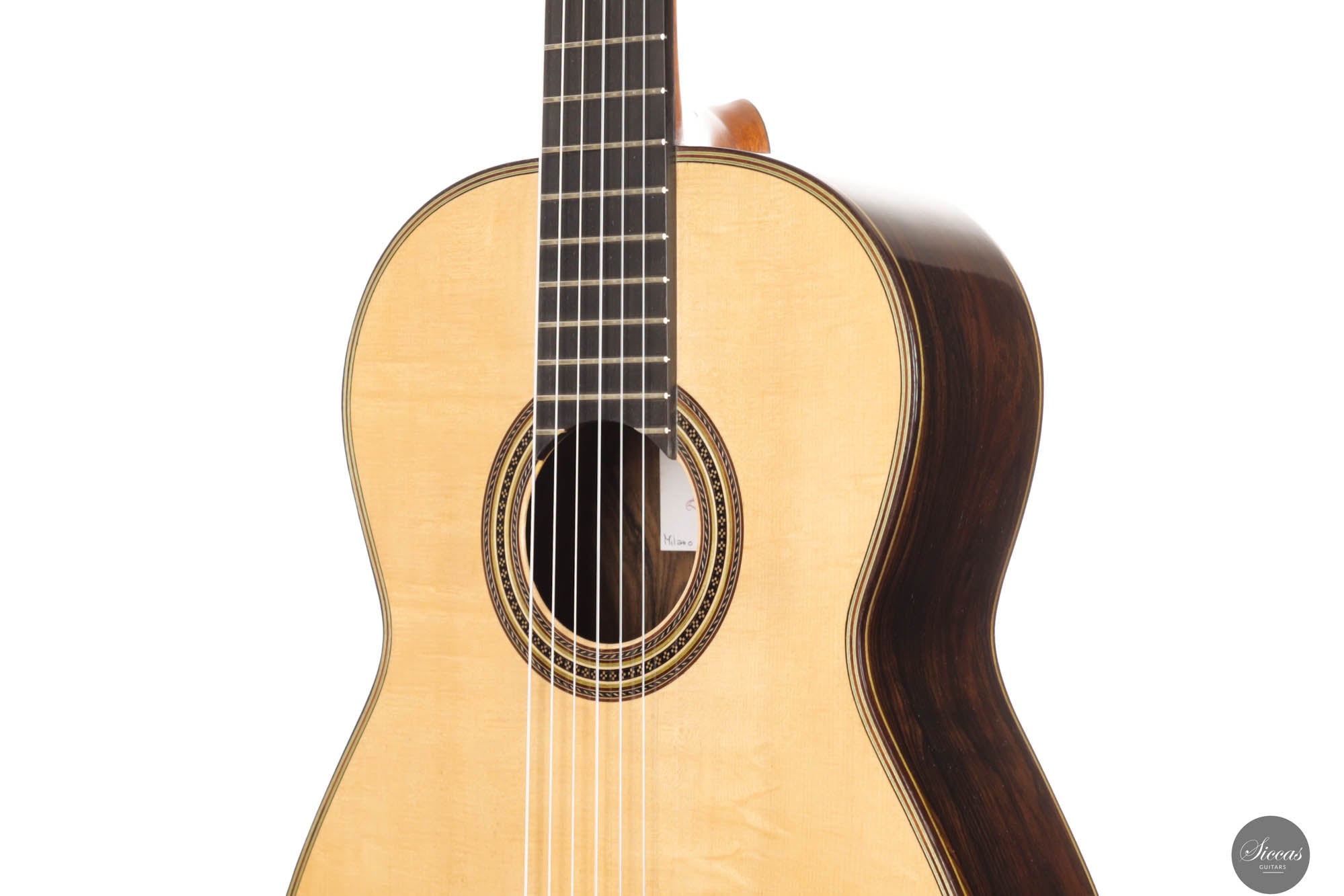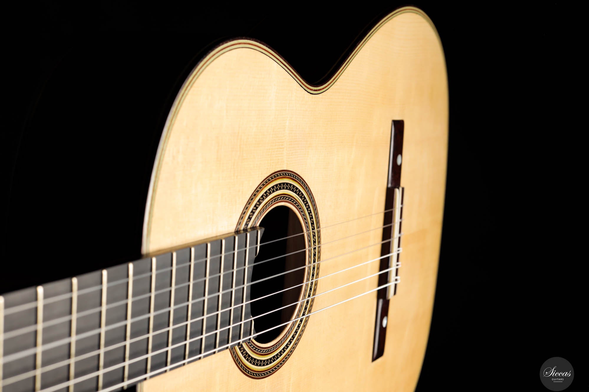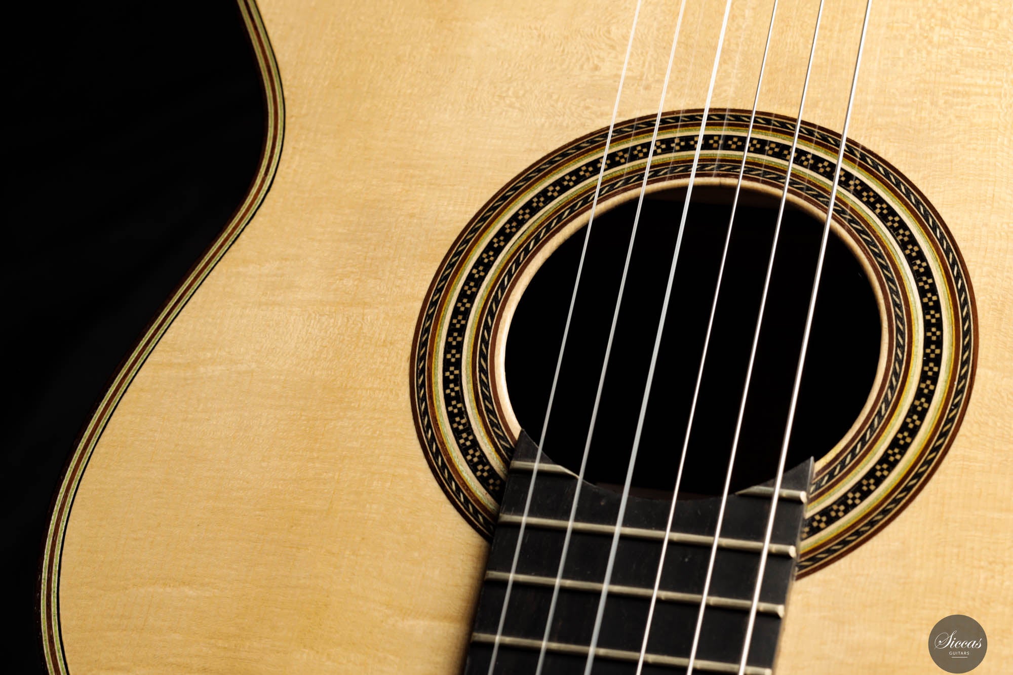 Die ästhetische Schönheit der Gitarre erhöht zusätzlich ihren Reiz. Die Fichtendecke hat eine charmante Farbe und ist mit einer schönen Maserung verziert, die den visuellen Aspekt des Instruments hebt und ihm einen einzigartigen Charakter und Raffinesse verleiht. Diese komplizierten Details des Holzes tragen nicht nur zur atemberaubenden Erscheinung der Gitarre bei; sie spielen auch eine Rolle bei der Formung der unverwechselbaren klanglichen Eigenschaften des Instruments. Lucio Carbones Aufmerksamkeit sowohl für die visuellen als auch für die akustischen Details macht diese Gitarre zu einem Kunstwerk, das mit Schönheit und Exzellenz resoniert.