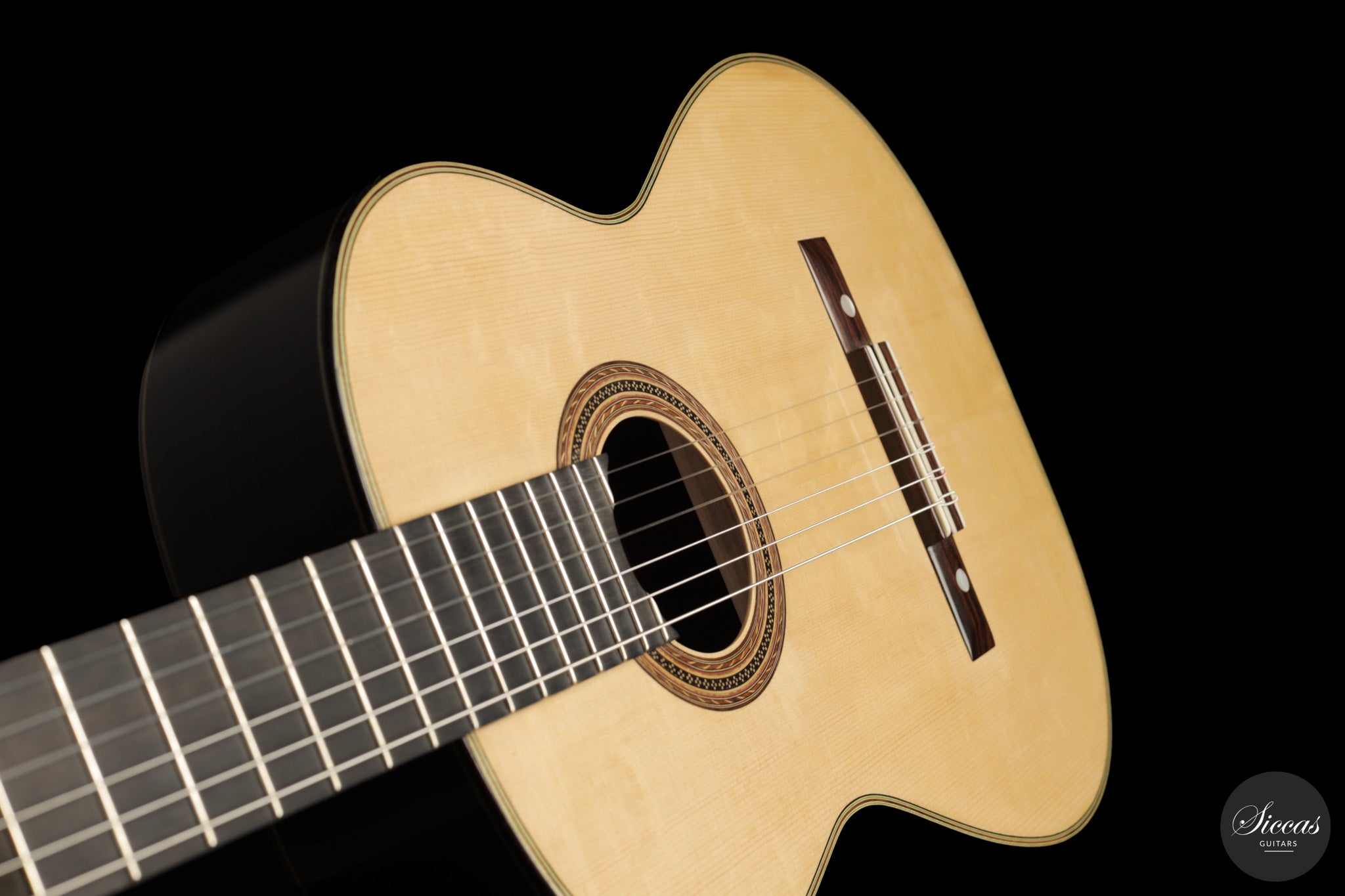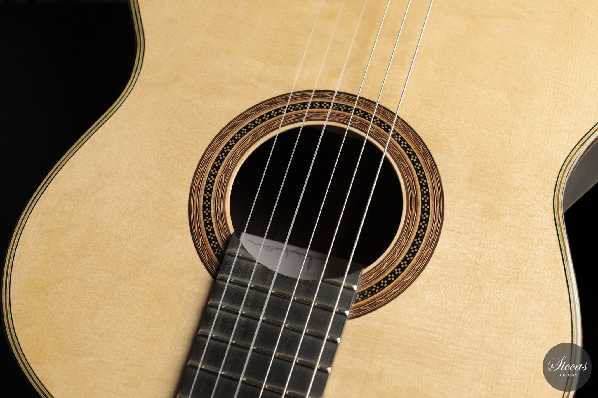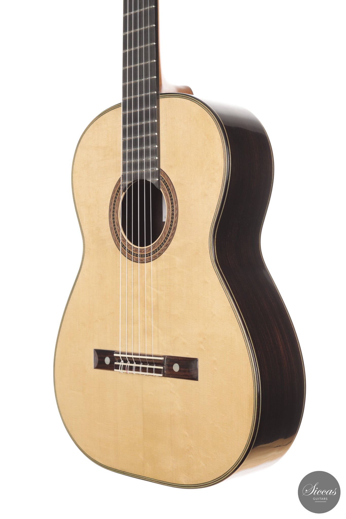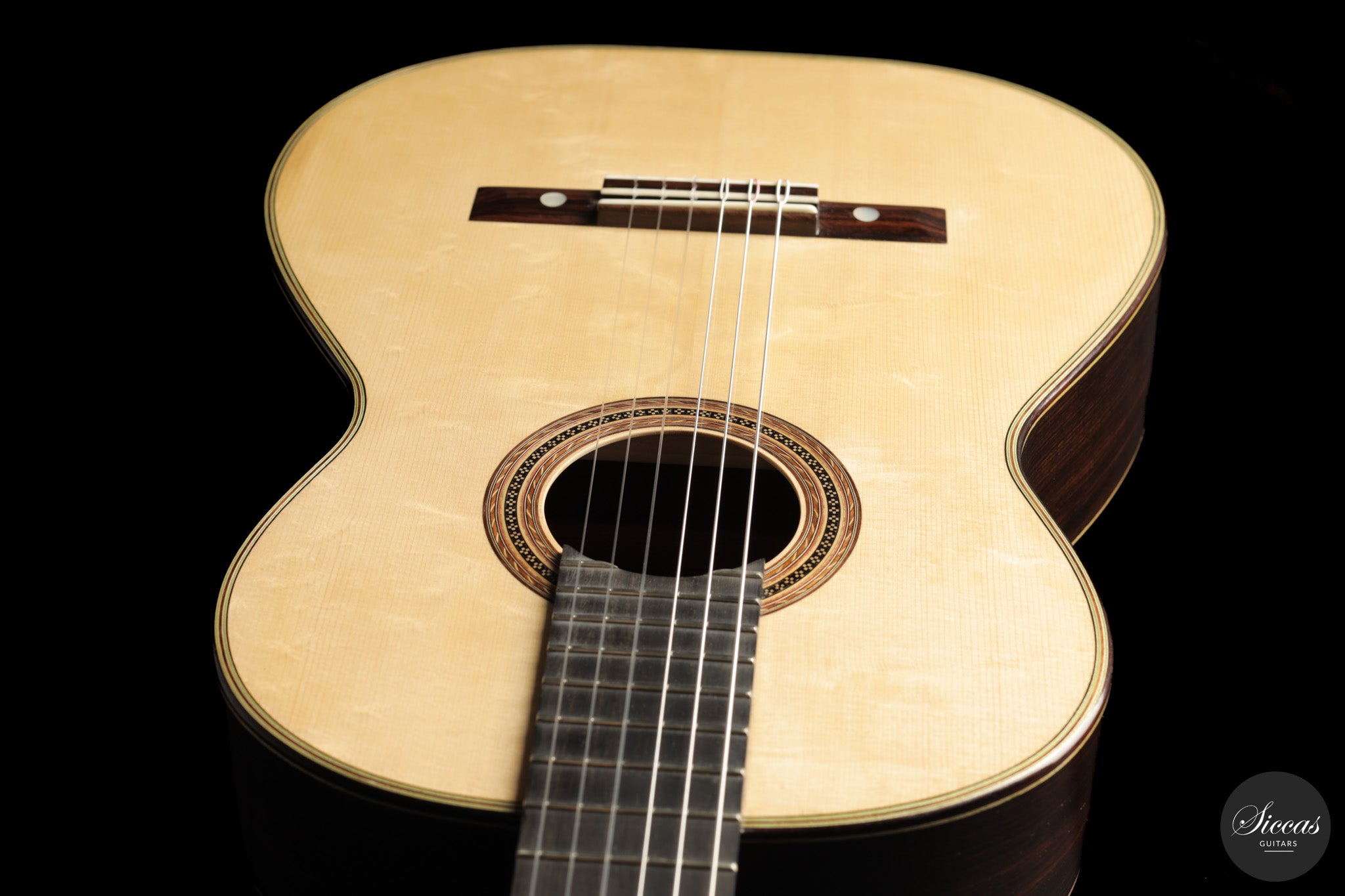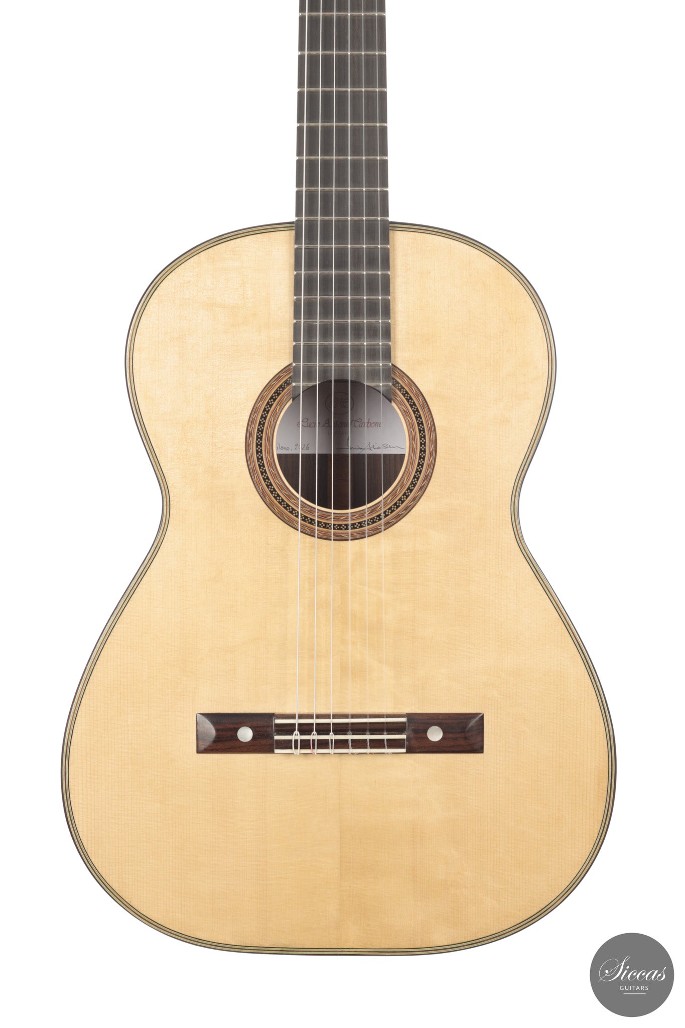 Diese Gitarre aus dem Jahr 2026 von Lucio Antonio Carbone ist ein traditionell gebautes Instrument mit Fichtendecke sowie Boden und Zargen aus indischem Palisander, vollständig mit Schellack poliert. Auch wenn die Gestaltung deutlich von Carbones langjähriger Beschäftigung mit den großen historischen Modellen geprägt ist, sollte dieses Instrument nicht als strenge Kopie verstanden werden, sondern als seine eigene reife Interpretation. Das Ergebnis ist eine Konzertgitarre von bemerkenswerter Präsenz, die auf traditionellen Prinzipien beruht, klanglich jedoch eine ungewöhnliche Offenheit und Leichtigkeit entfaltet.