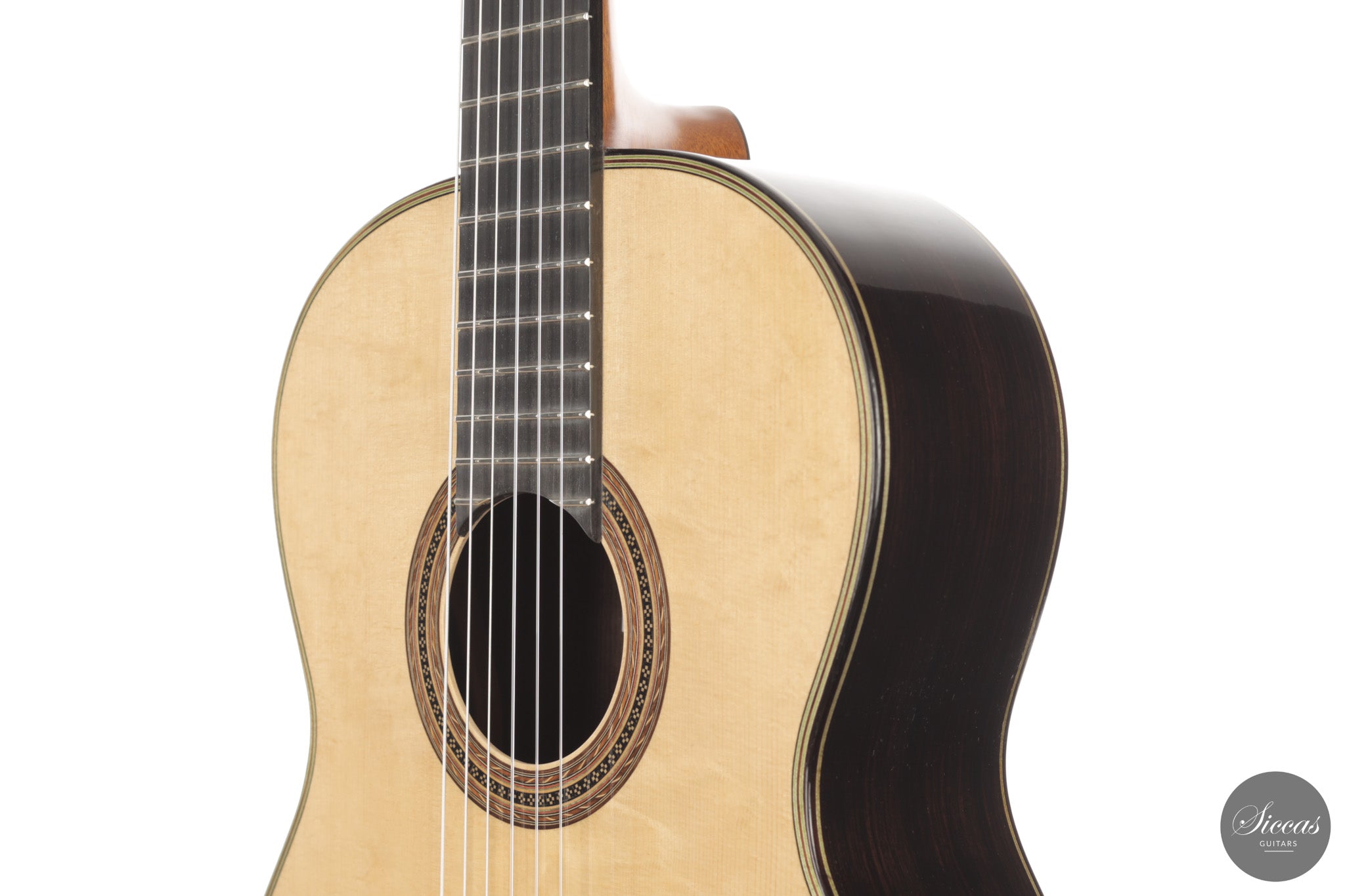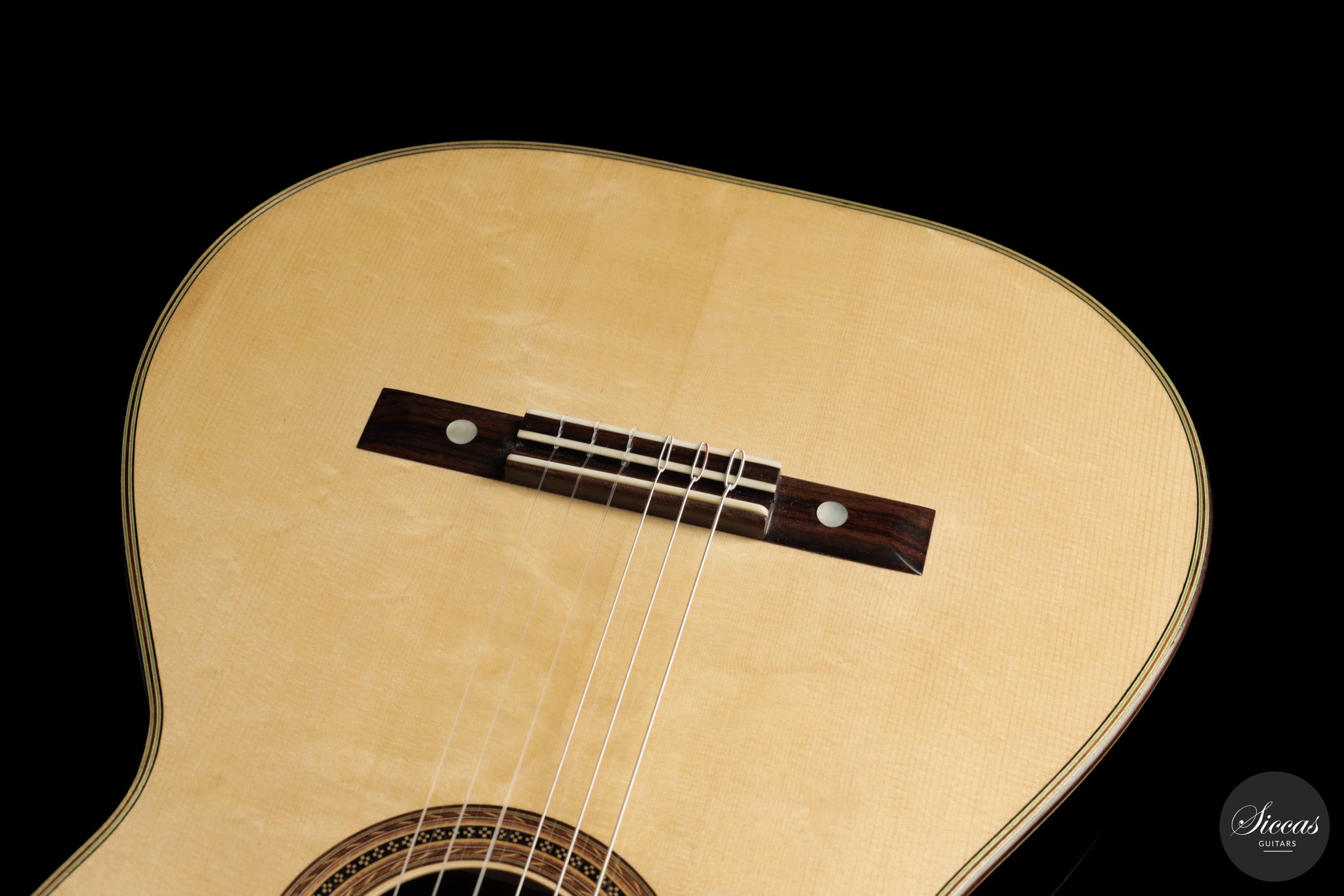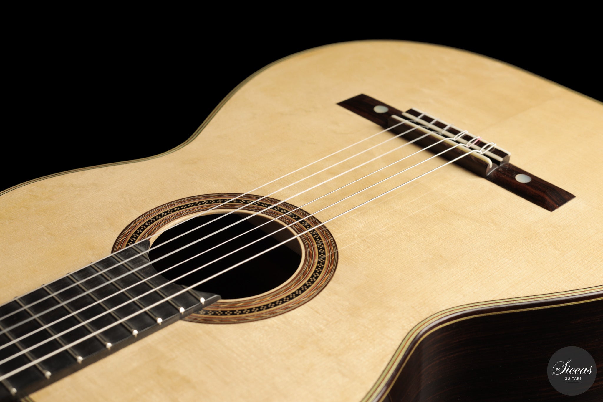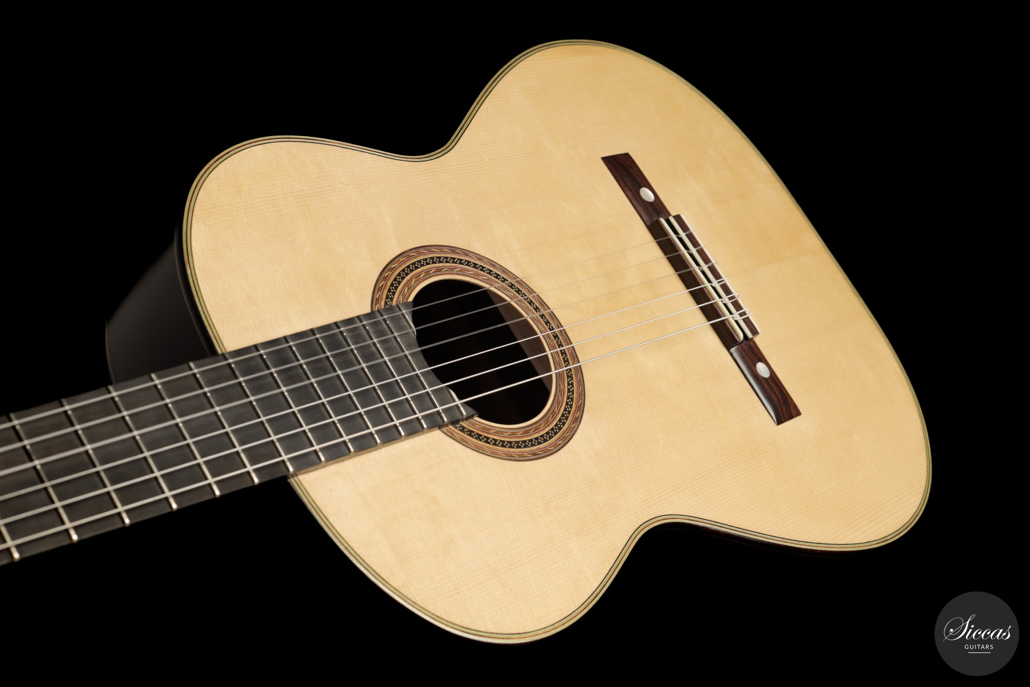 Diese Gitarre aus dem Jahr 2026 von Lucio Antonio Carbone ist ein traditionell gebautes Instrument mit Fichtendecke sowie Boden und Zargen aus indischem Palisander, vollständig mit Schellack poliert. Auch wenn die Gestaltung deutlich von Carbones langjähriger Beschäftigung mit den großen historischen Modellen geprägt ist, sollte dieses Instrument nicht als strenge Kopie verstanden werden, sondern als seine eigene reife Interpretation. Das Ergebnis ist eine Konzertgitarre von bemerkenswerter Präsenz, die auf traditionellen Prinzipien beruht, klanglich jedoch eine ungewöhnliche Offenheit und Leichtigkeit entfaltet.