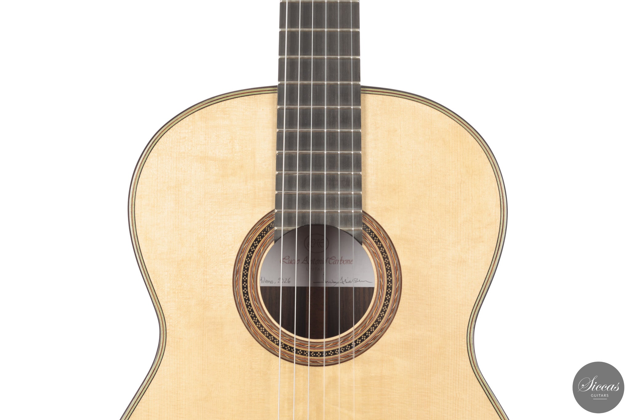 Lucio Antonio Carbone, geboren 1959, baut seit den frühen 1980er Jahren klassische Gitarren. 1989 gründete er seine Werkstatt in Mailand, wo er bis heute mit klarer Hingabe an traditionelle Bauweisen und eine fein austarierte klangliche Ästhetik arbeitet. Im Laufe der Jahrzehnte hat er eine persönliche Handschrift entwickelt, die sowohl spanische als auch deutsche Einflüsse aufnimmt und dennoch unverkennbar eigenständig bleibt. Seine Gitarren zeugen von einem sorgfältigen Verständnis der Materialien und einer konsequenten Suche nach klanglicher Klarheit, Tiefe und konstruktiver Geschlossenheit.