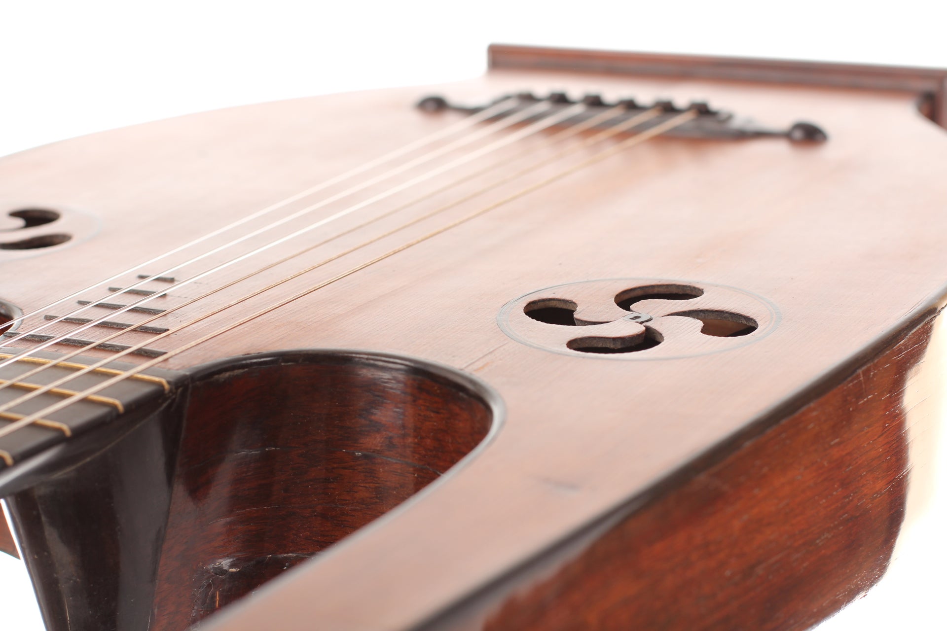 Schöne Terz Lyra Gitarre aus Mirecourt, die um 1820 gebaut wurde. Die Fichtendecke befindet sich in einem guten Zustand. Am rechten Rand befindet sich ein ausgespahnter Riss. Boden und Zargen sind aus Palisander gefertigt. Die Innenseite des Bodens besteht aus Fichte. Die Lyra Gitarre ist spielbereit.